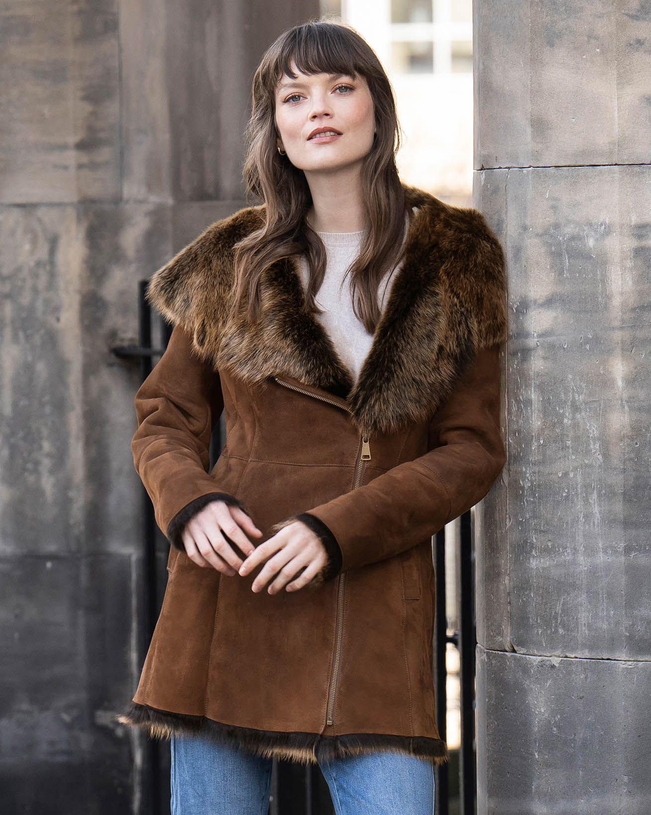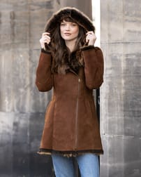 Toscana sheepskin is renowned for its super-soft hide and silky, fur-like wool that together provide incredible insulation and a truly indulgent wearing experience. We've given the leather a sueded finish, which beautifully complements the double-dyed wool tips that appear at the collar, cuffs and hem. The cosy hood can be fastened with a button closure to protect your face and neck, while an asymmetric zip adds a contemporary touch.