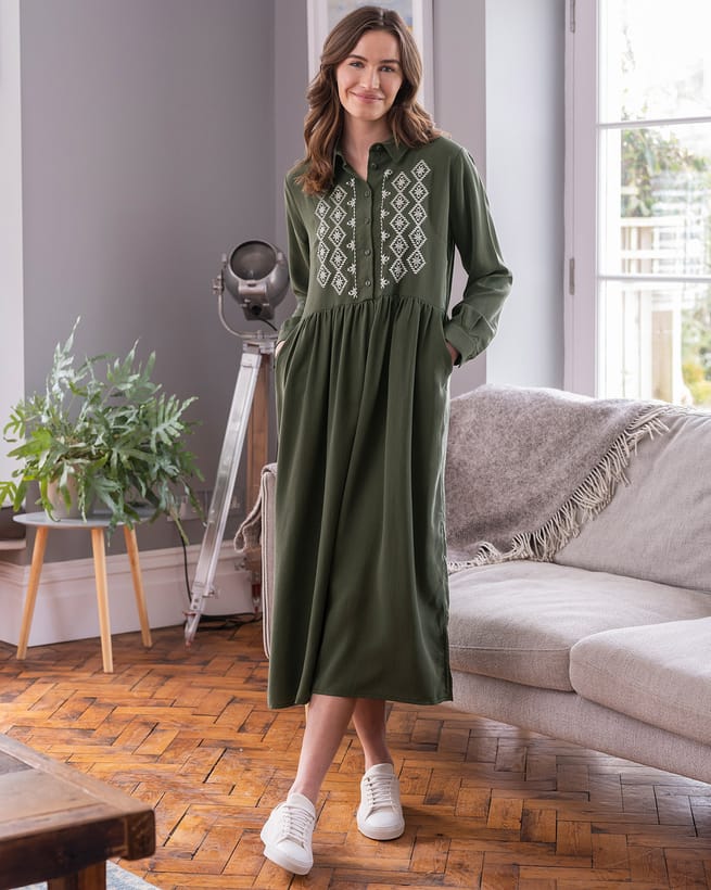 The perfect dress if you’re looking for light and breathable with a little more coverage. Washed to give it a beautiful, soft, tumbled look, this classic shirt dress is a flattering length. Featuring a curved hem, side pockets, half length, turn up cuff sleeves and collar detail. The fabric has a small check pattern throughout, creating texture. Use the self tie belt to style as you wish, either creating a fitted, cinched at the waist silhouette, or belt-less for a straight shirt dress style.