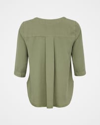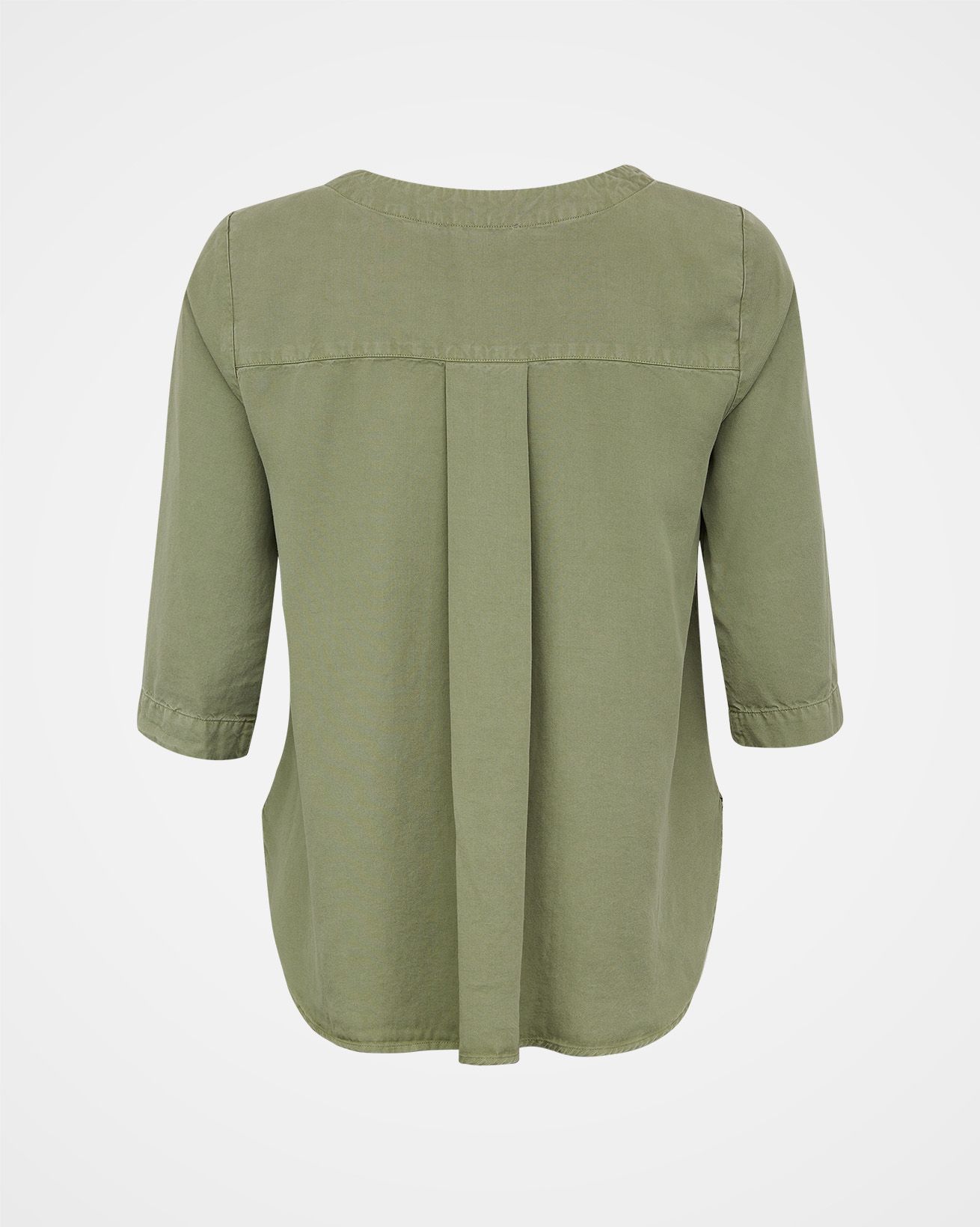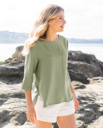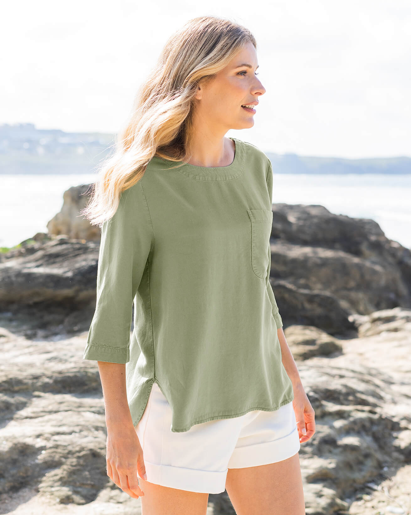 With the material consciously sourced as close by as possible, it's designed with three-quarter sleeves, a round neckline and a patched pocket at the chest. The deep box pleat at the rear ensures it's easy to move in, making it ideal for pottering at home, heading out with friends or going on a stroll along the shoreline.