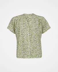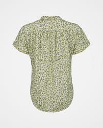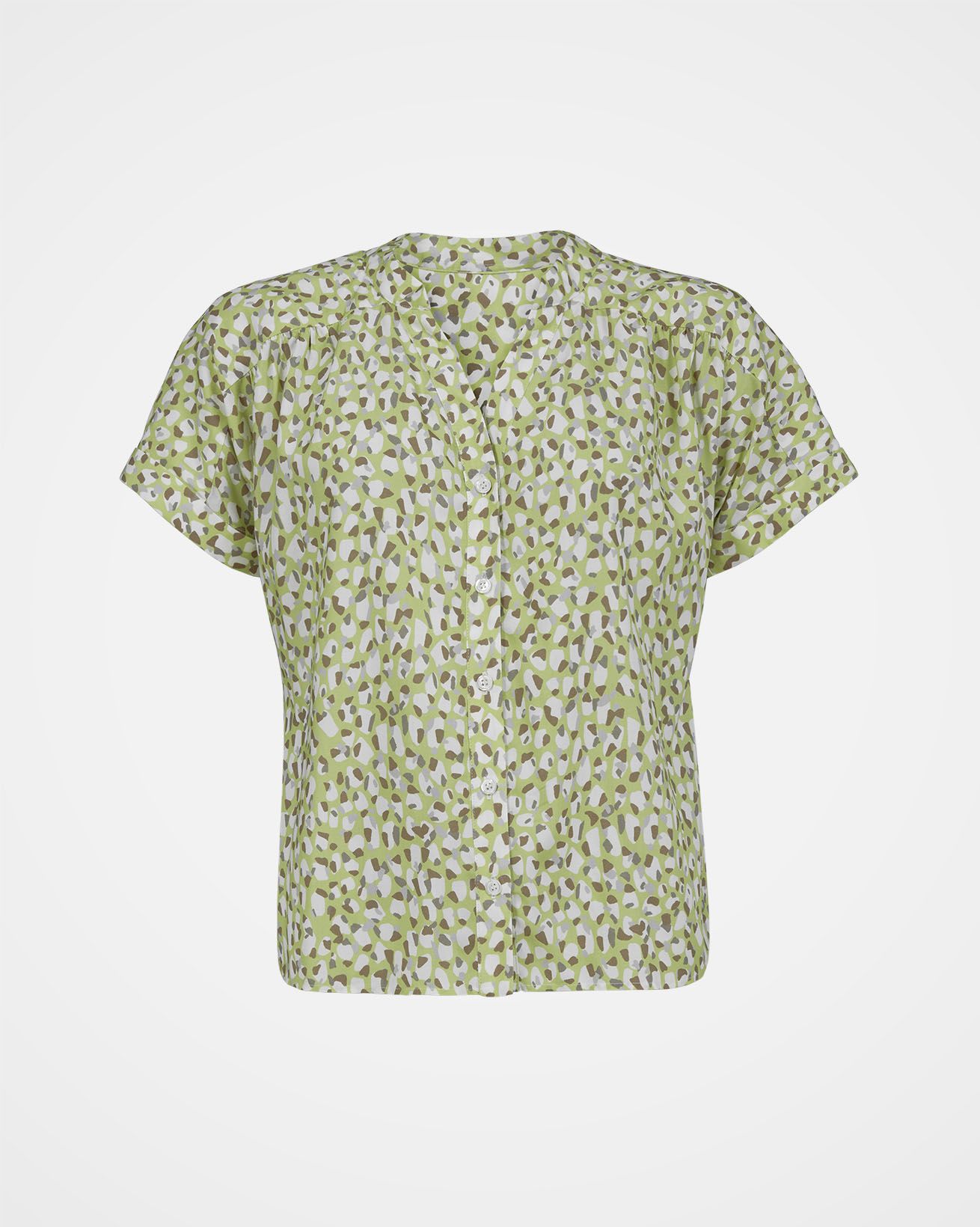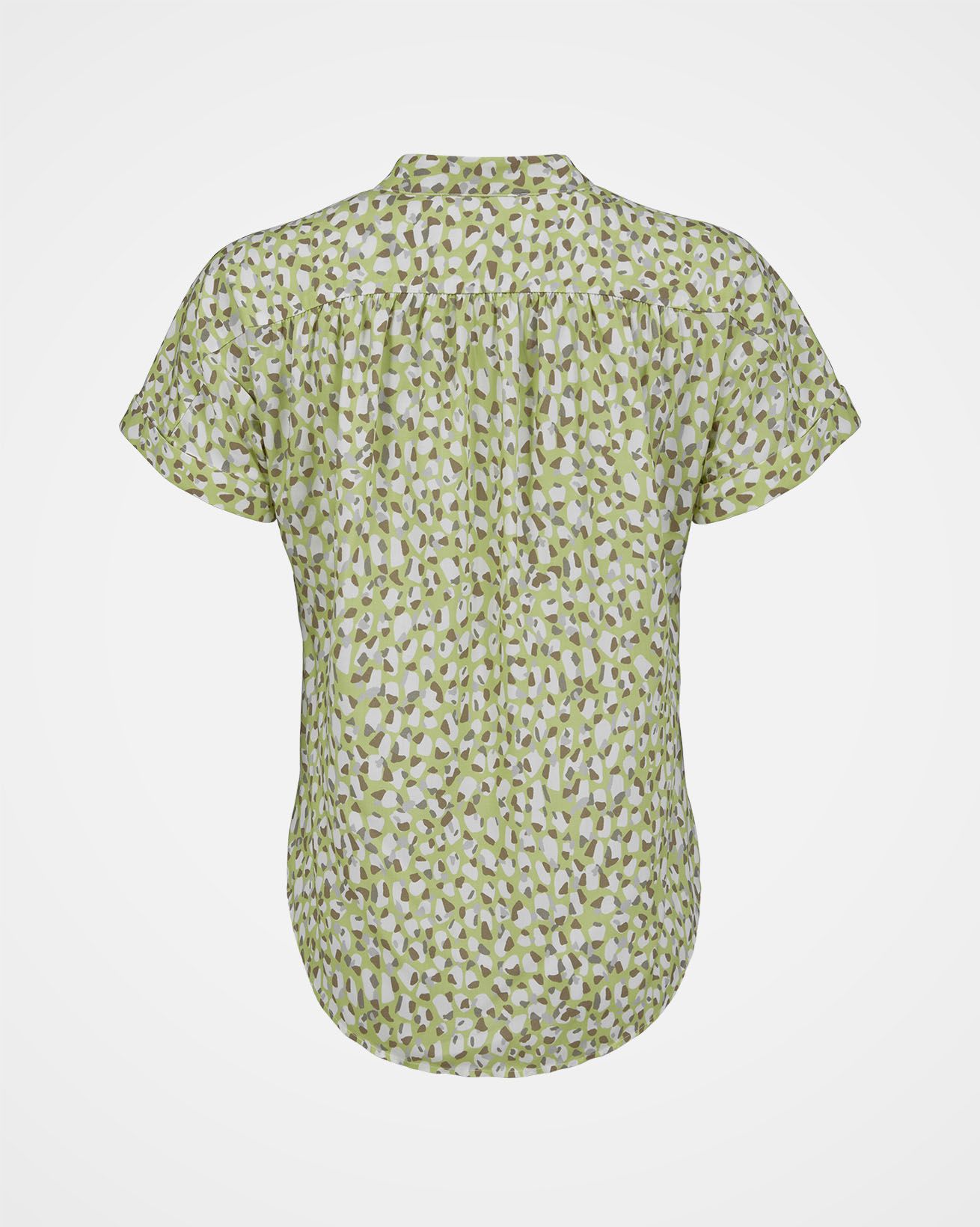 Made in a beautifully soft, flowing fabric, this Corozo-button through blouse features a small stand collar and grown on shirt sleeves with turn back cuffs. The back of the shirt flatteringly curves down for additional length, and there is soft gathering into the front and back yoke seams.