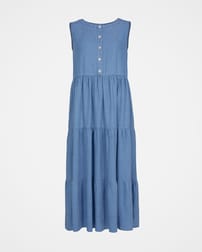 A simple and elegant tiered midi dress that offers a relaxed and comfy fit with a generous, draped skirt. Featuring contrast buttons that add bodice detail, a crew neckline and pockets in the side seam.