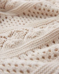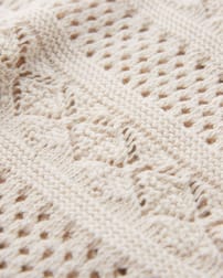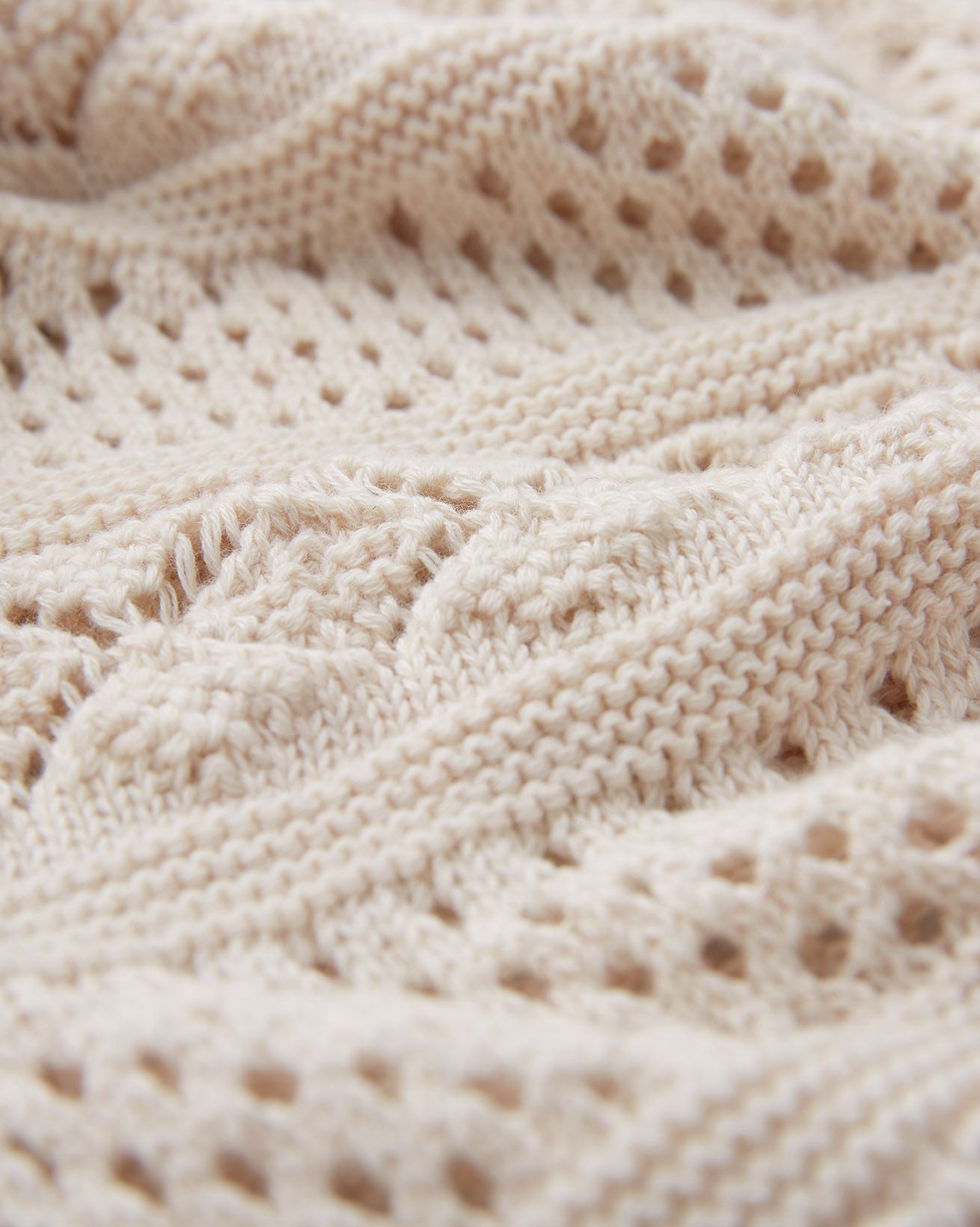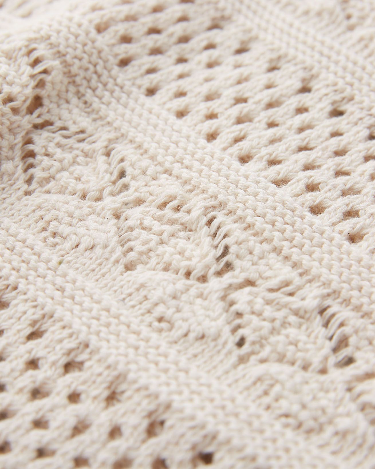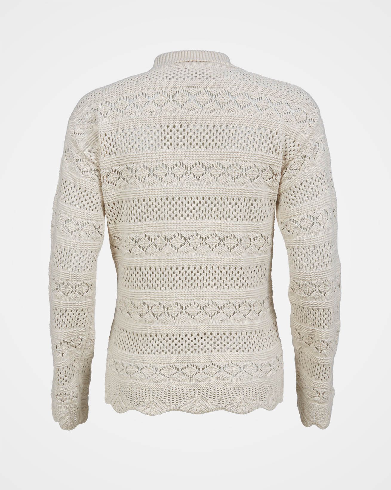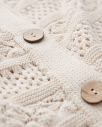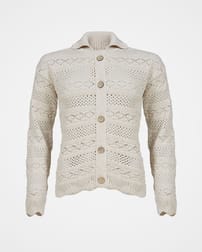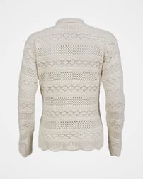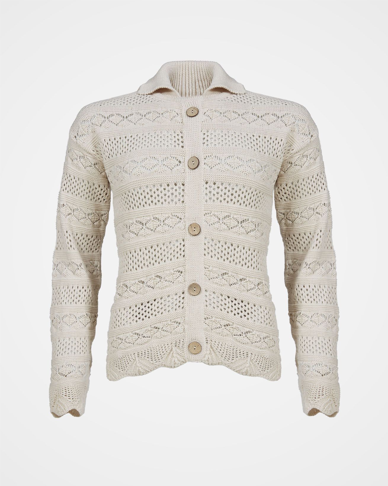 The neat fit of our Cotton Crochet Stitch Cardigan is an eye-catching alternative to the common cardi. With all over crochet-look stitch design in stripes and alternating pointelle patterns. Finished with a scalloped edge on the hem and cuff, the collar and placket are ribbed knit. This piece fastens with five coconut buttons, and looks great with denim.