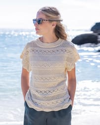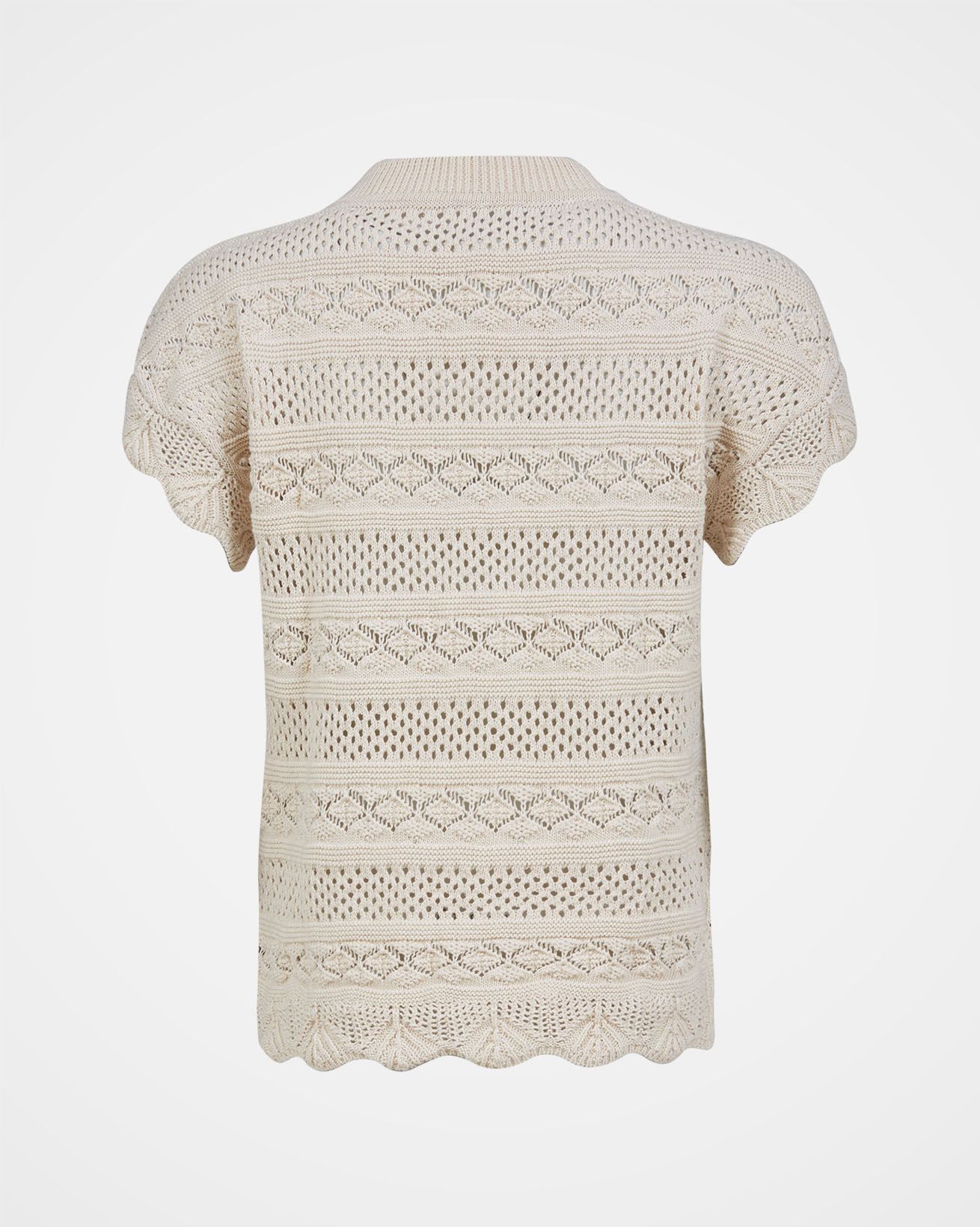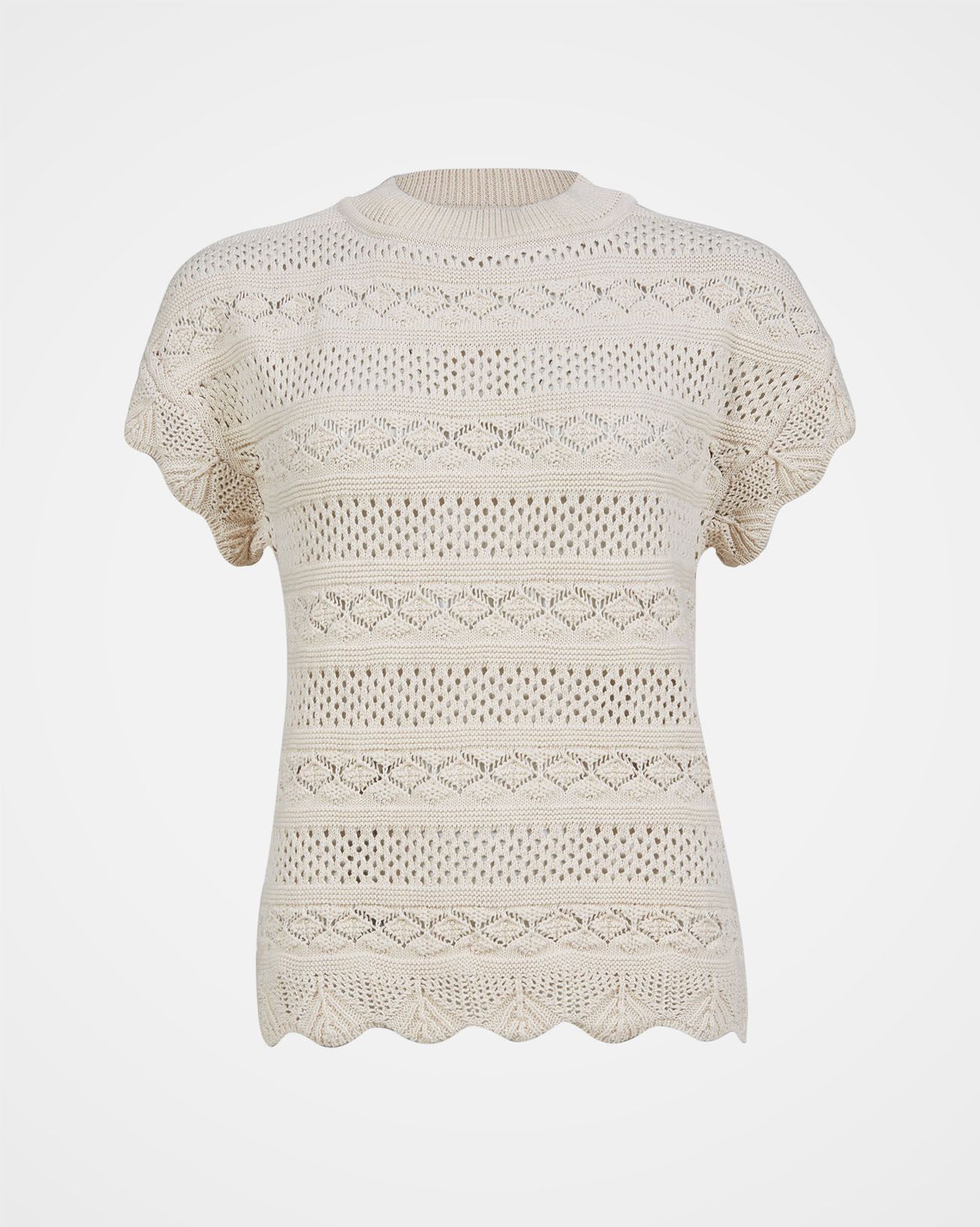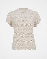 This beautiful crew neck knitted t-shirt is both eye-catching and easy to wear. Knitted in an all-over crochet-look stitch design in stripes and various pointelle patterns, a ribbed collar and finished with a scalloped edge on the hem and cuff.