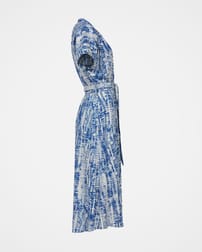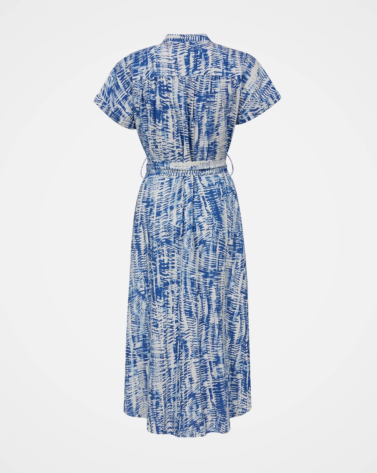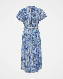 A lovely button through midi dress with side pockets, short sleeves and a notch neck with a stand collar. Details are added through gathering at the front and back yoke. The fabric blend has created a draped yet slightly structured appearance, which hangs beautifully on the body. Adjust the fit to your desired preference using the self tie waist belt.