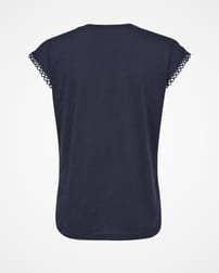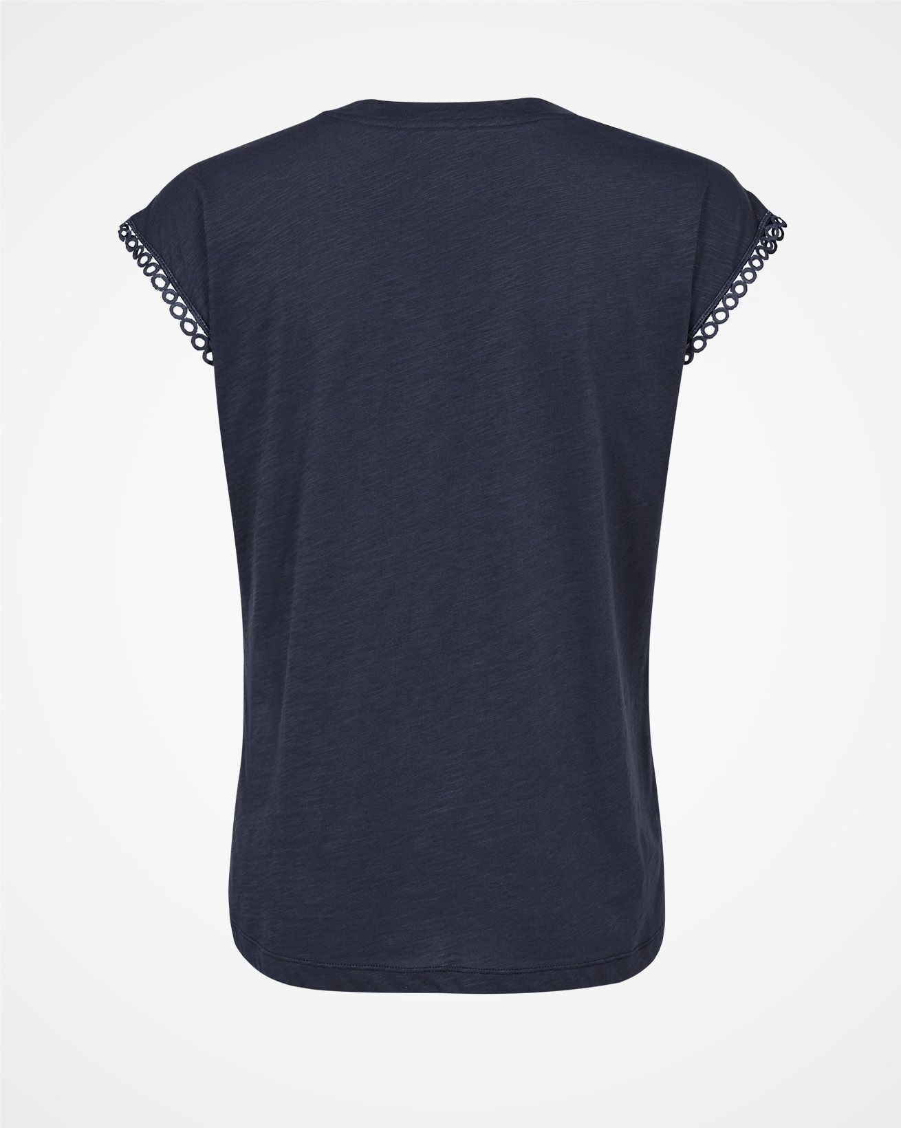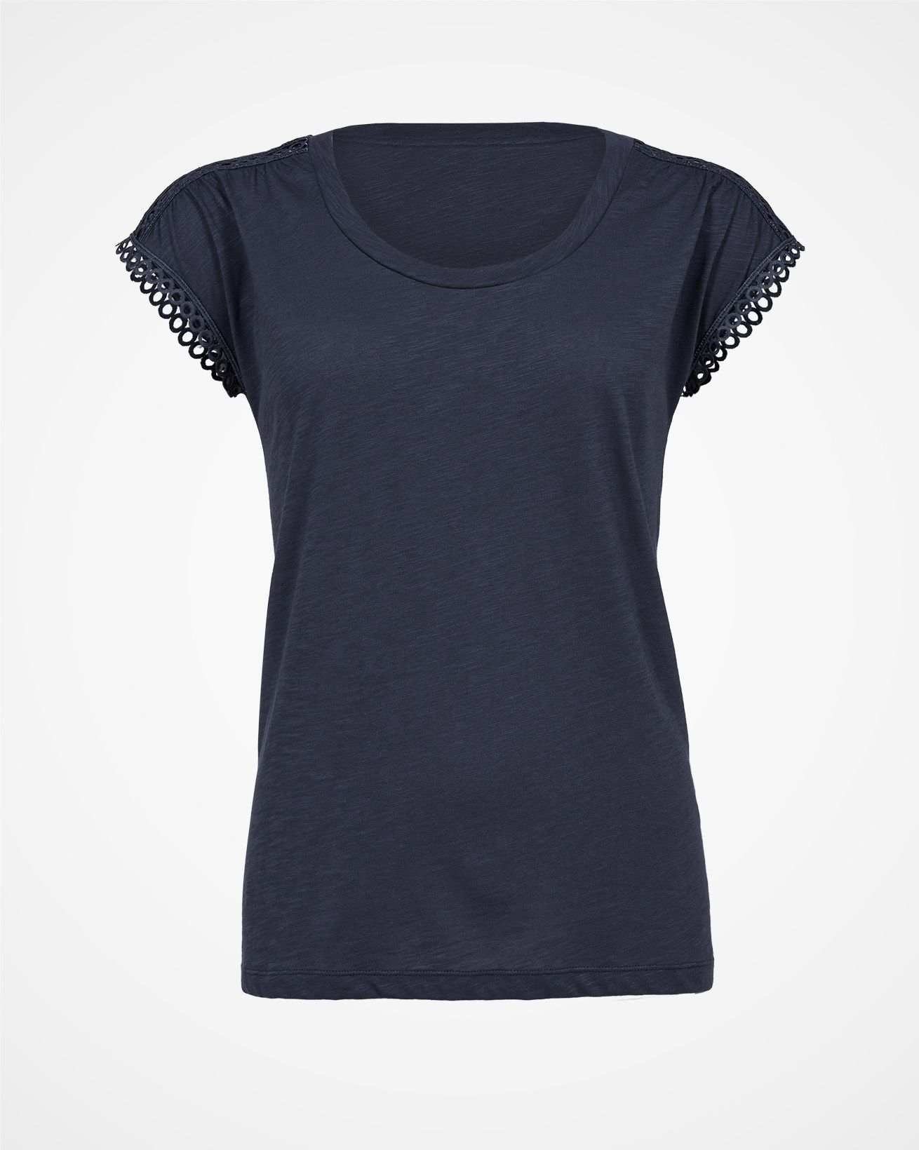 Much more than your everyday t-shirt. This lovely organic cotton scoop neck top is made from soft, slub jersey and features a delicate and subtle cotton loop lace trim insert at the shoulder seam and around the arm hole. Breathable and durable, pull on with jeans or shorts and sneakers for the perfect cool and casual outfit.