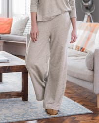 Part of our lounge collection, these wide leg joggers are the ultimate in cosy winter home wear. Made in a super soft, brushed back sweatshirt material, they are full length to keep you warm, with an elasticated waistband for comfort and handy pockets in the side seams. Curl up on the sofa in the coordinating V-neck sweatshirt, or pair with any other item in our lounge collection.