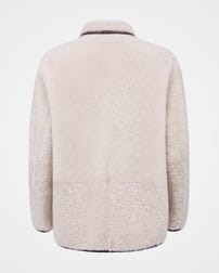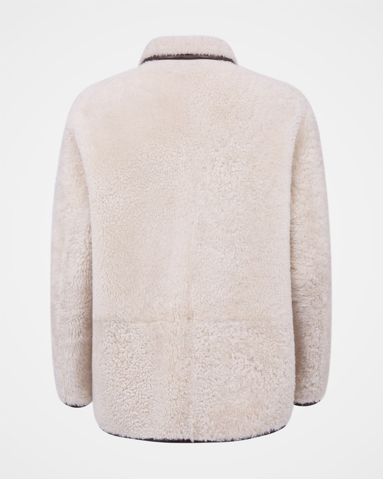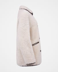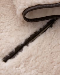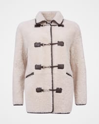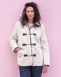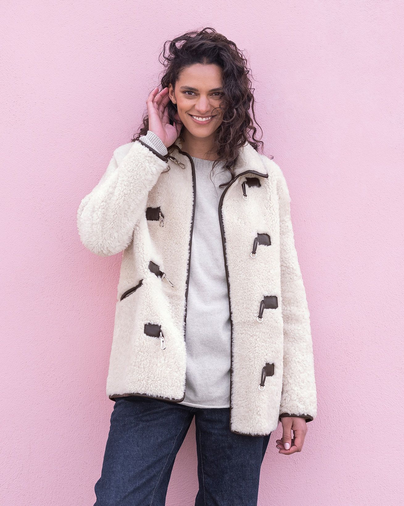 A lighter weight variation on our chunkier shearling styles, our teddy leather trim jacket is a modern take on a traditional duffle jacket. Designed with cosy teddy wool facing out, drop shoulder and easy body fit, it's great for layering through the colder seasons. Stylish details include a contrast dark brown leather binding around the cuff, collar, front edge and hem, plus welt pockets with leather edges. The fastenings consist of beautiful leather toggles with metal clips and rings.