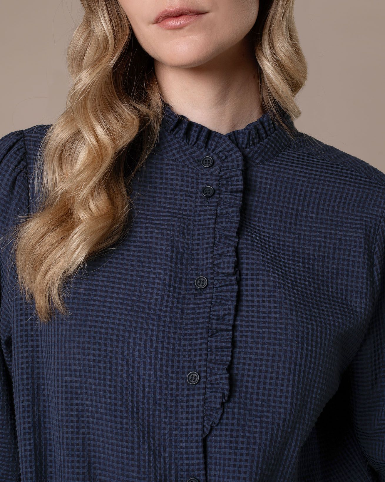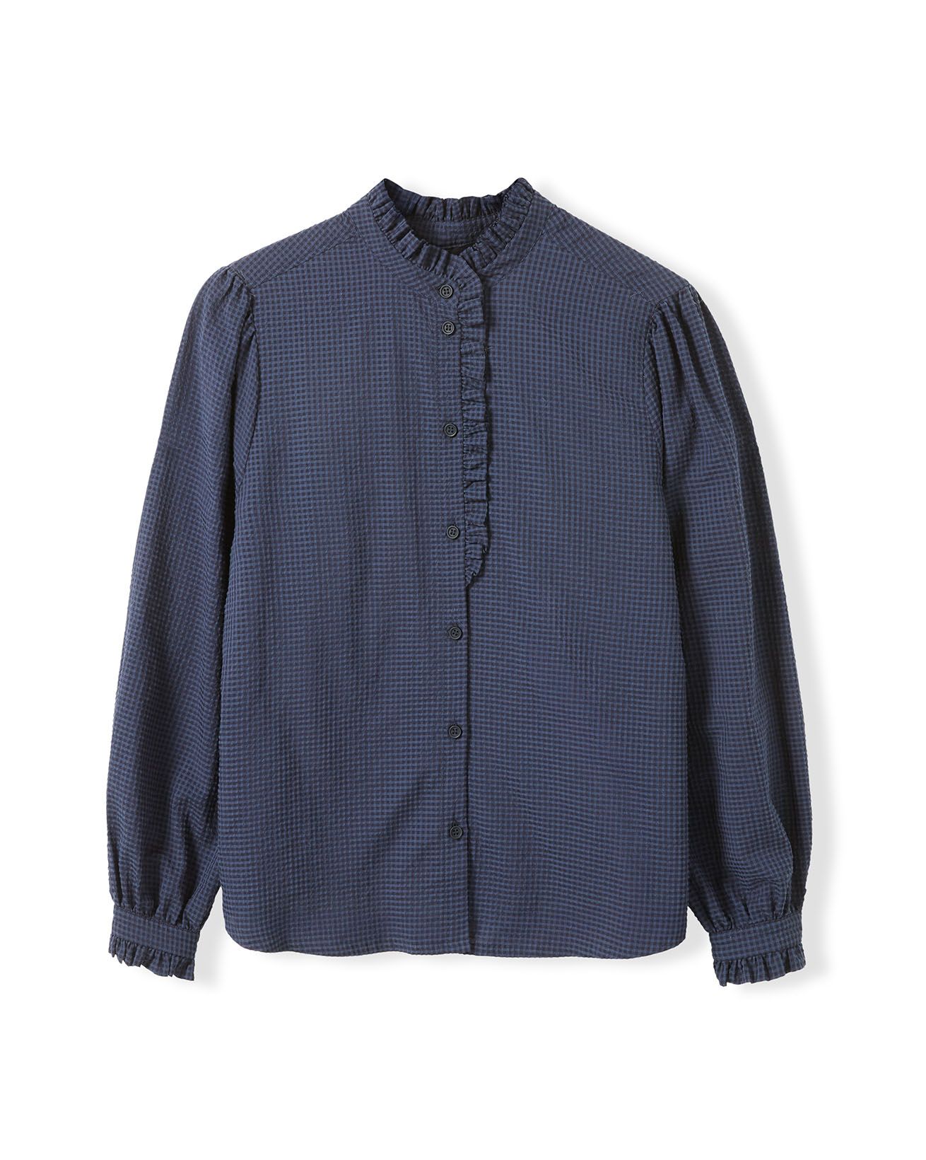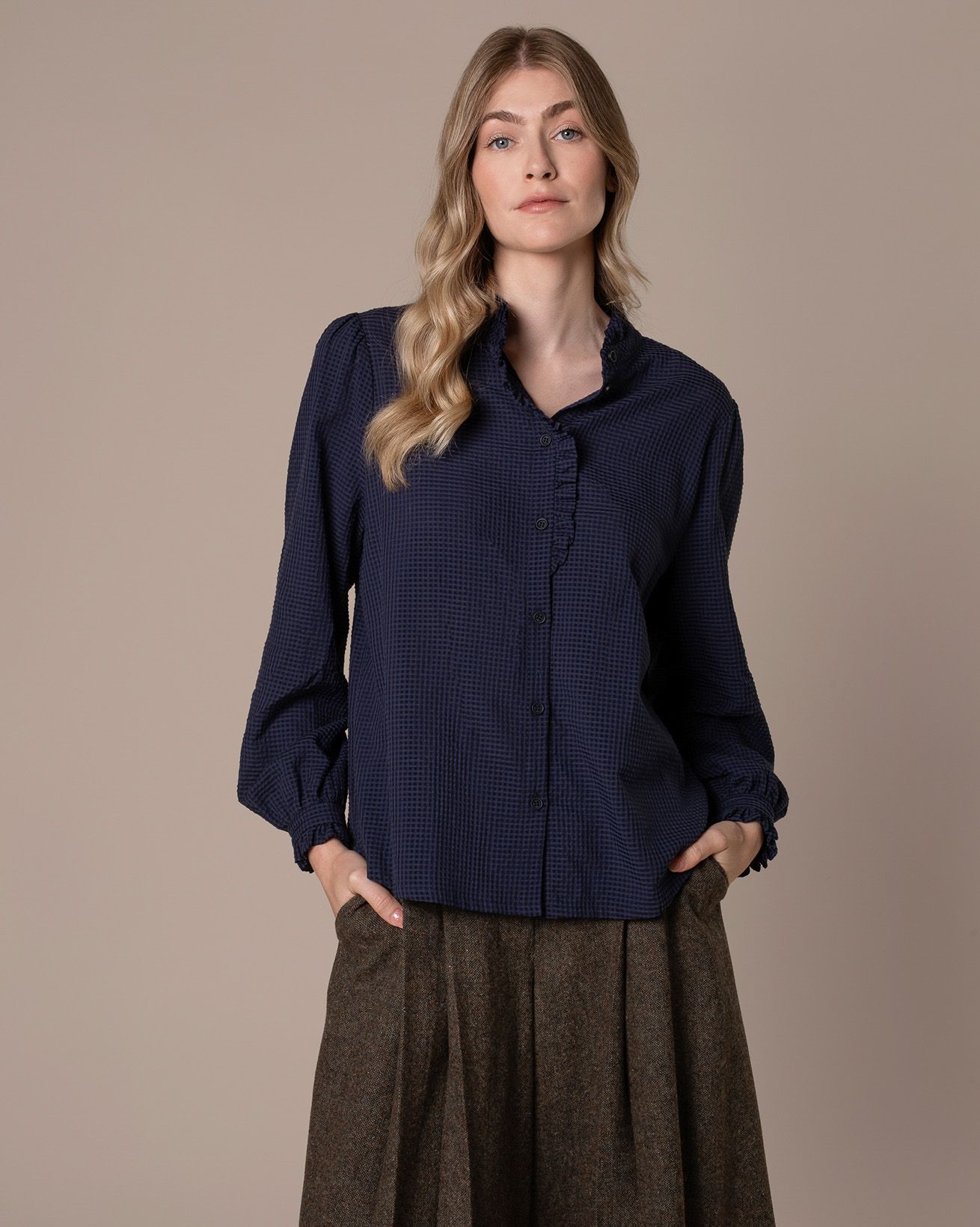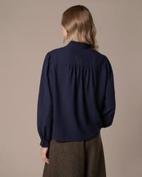Diese luxuriöse Bluse verfügt über einen Stehkragen mit zarter Rüsche. Weitere Rüschen schmücken die Manschetten, und die Bluse wird mit Corozo-Knöpfen abgeschlossen.
