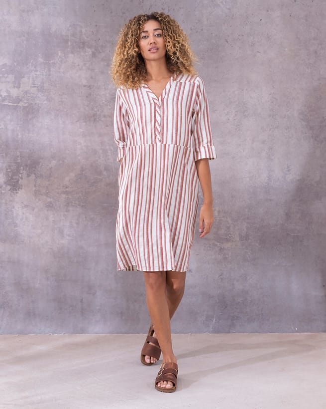 Dieses knielange Kleid ist vielseitig tragbar. Sie können die Taille enger schnüren oder den Gürtel für ein luftiges Tragegefühl lose einstellen. Der gewebte Baumwollstoff mit Streifen ermöglicht eine hohe Atmungsaktivität und ein angenehmes Tragegefühl auf der Haut. Mit geschlitztem Ausschnitt und Cutabout-Streifen.