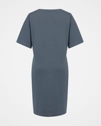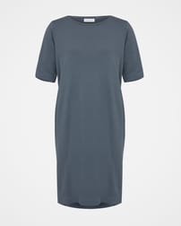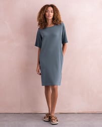 Dieses knielange, gerade geschnittene T-Shirt-Kleid ist praktisch, besonders bequem und lässt sich einfach stylen. Die halblangen, ausgestellten Ärmel sind äußerst schmeichelhaft und sorgen für zusätzlichen Schutz. Mit dem Rundhalsausschnitt und den Seitentaschen eignet sich das Kleidungsstück perfekt für den Alltag. Stylingtipp: Tragen Sie es mit Sneakern in der Stadt oder barfuß am Strand.