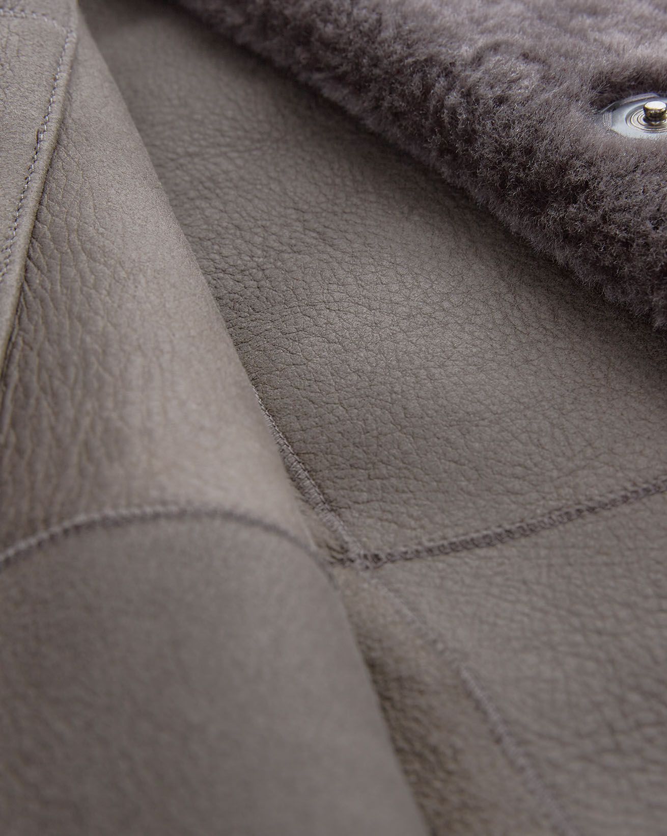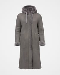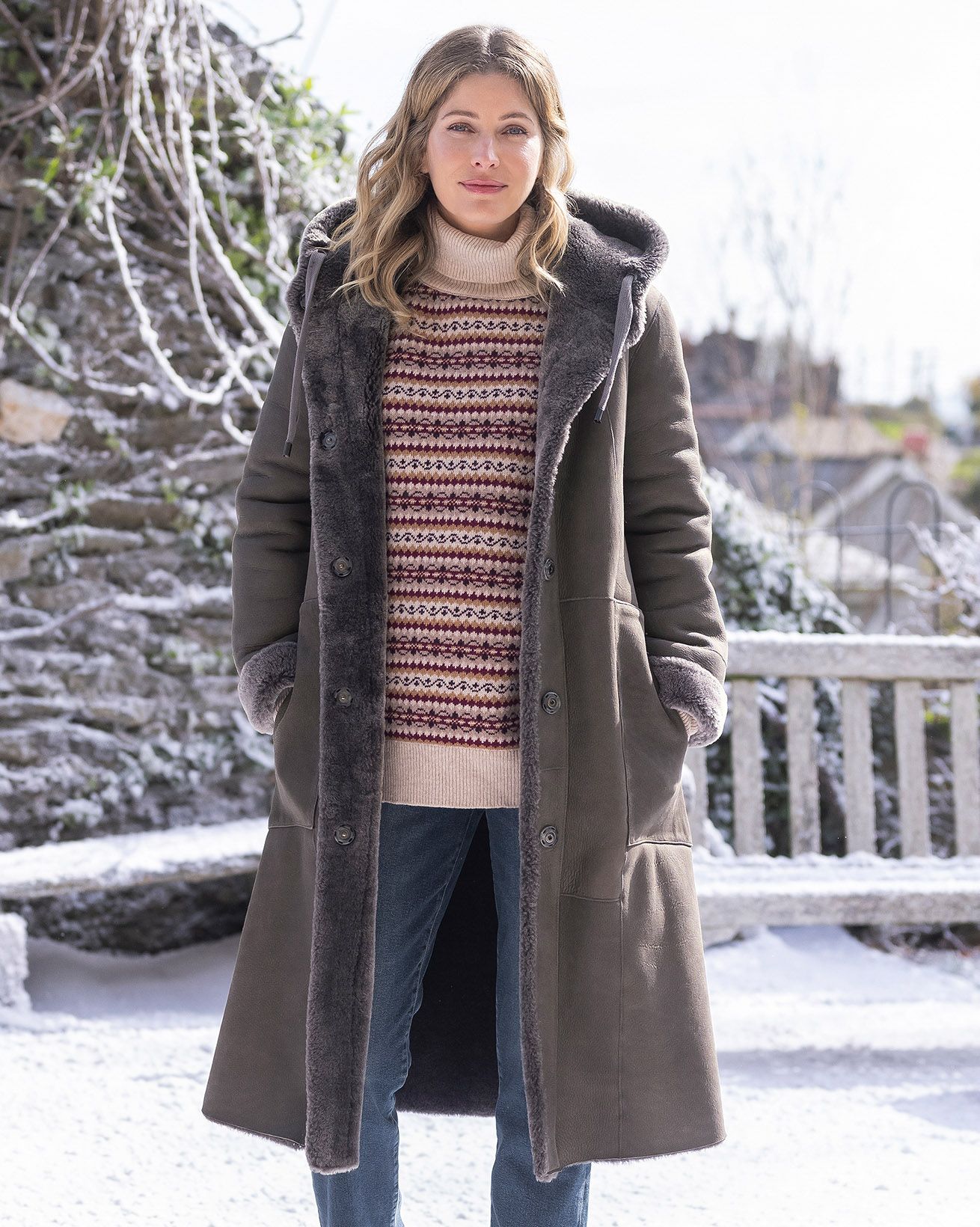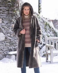 Dieser luxuriöse Mantel ist wunderbar weich, warm und kuschelig. Er ist wendbar und kann entweder mit der Wildleder- oder der luxuriösen Wollseite nach außen getragen werden. Die geräumige Kapuze ist weit geschnitten, sodass die Schafwolle immer Ihr Gesicht umschließt. Ein Kordelzug aus Baumwolle am Rand der Kapuze sorgt dafür, dass Sie auch bei niedrigen Temperaturen nicht frieren. Der Mantel ist lang, hat eine gerade Passform und lässt sich mit versteckten, hochwertigen Druckknöpfen auf der Vorderseite schließen. Wenn Sie den Mantel mit der Wollseite nach außen tragen, fällt er etwa eine halbe Größe größer aus, damit Sie auch dickeren Strick darunter anziehen können. Mit Ärmelbund zum Aufschlagen, der die Wolle zur Geltung bringt, wenn Sie den Mantel mit der Wildlederseite nach außen tragen, und praktischen integrierten Taschen, die stets zugänglich sind.