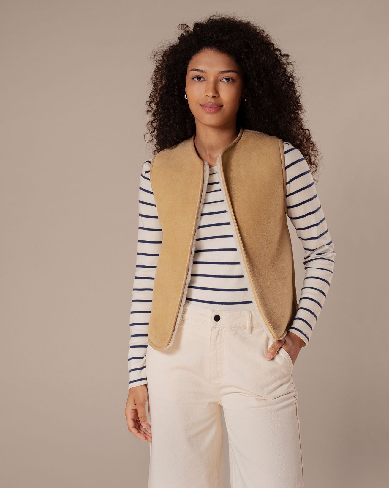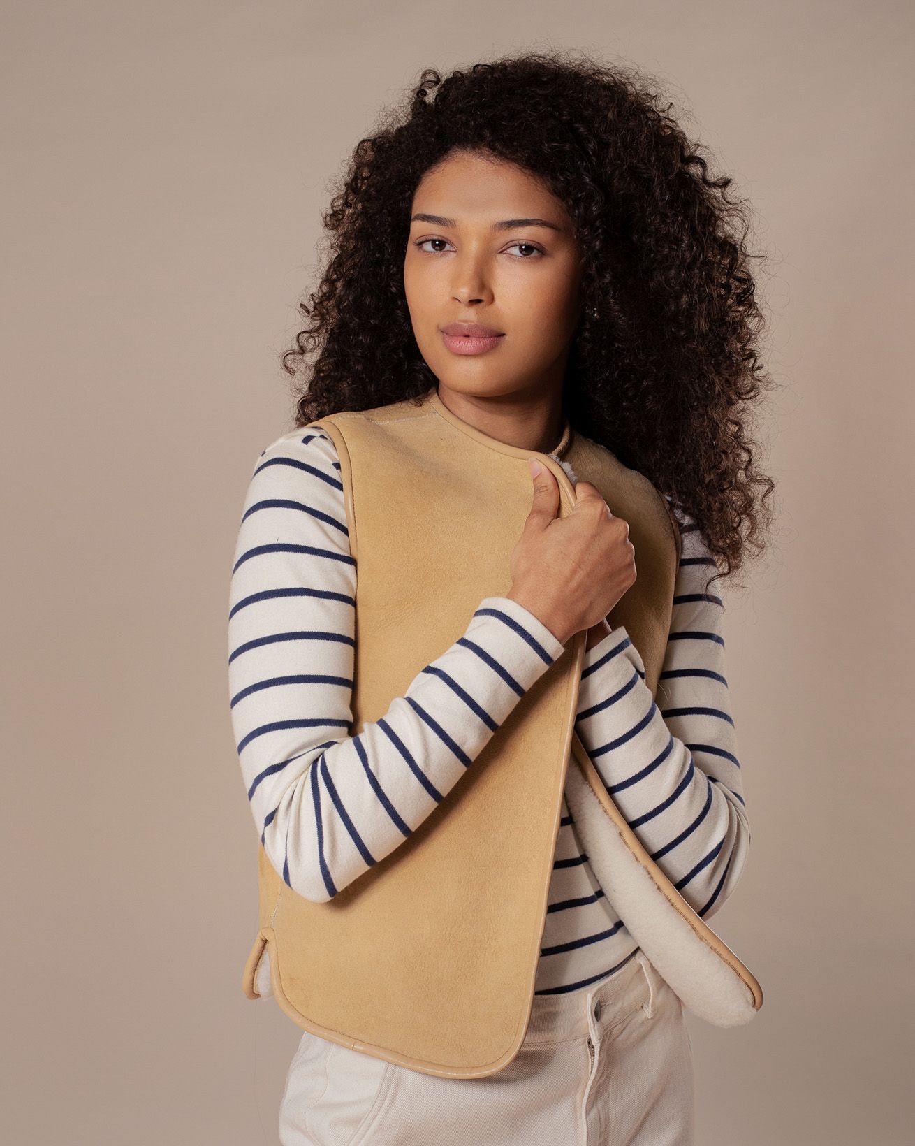 Hergestellt in Großbritannien aus 100 % Schaffell, ist diese offen geschnittene Weste vollständig wendbar. Sie bietet auf einer Seite eine lockige Woll-Oberfläche und auf der anderen weiches Veloursleder. Entworfen mit einem kragenlosen Ausschnitt und mit Lederbändern eingefasst für ein edles Finish.