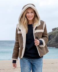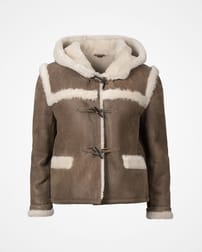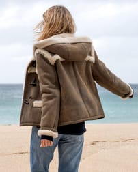 Une version plus courte du célèbre Celtic Duffle, notre veste en peau de mouton à capuche est garnie de boutons pour une apparence authentique.