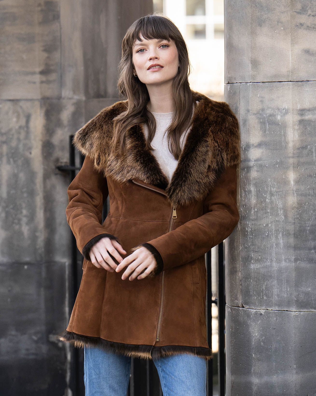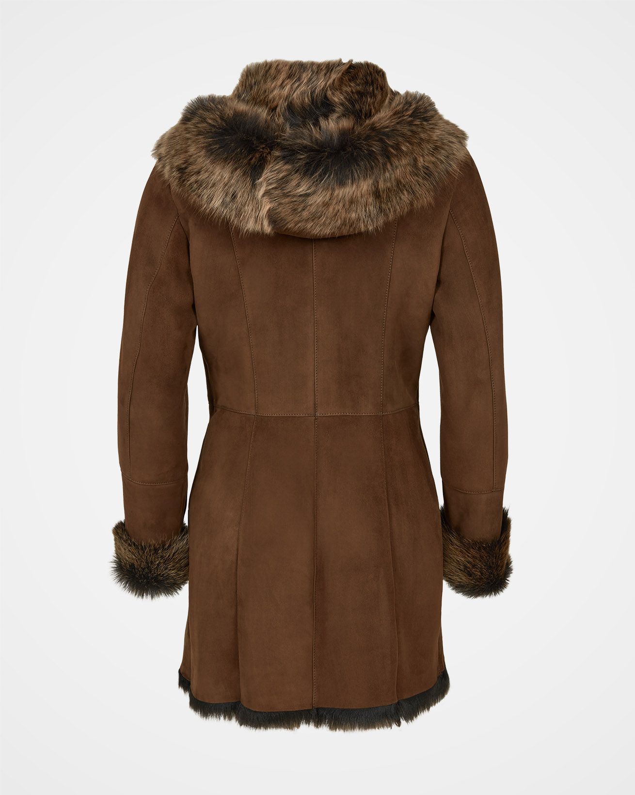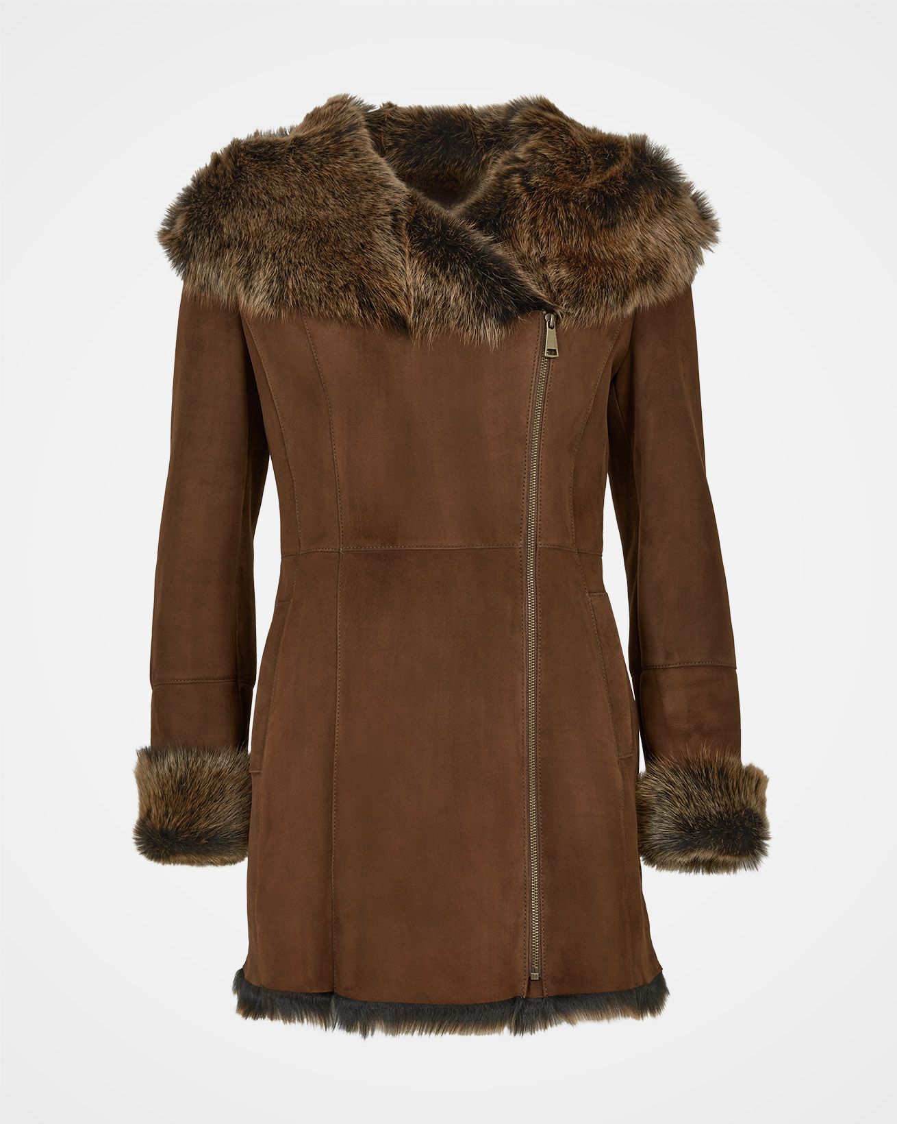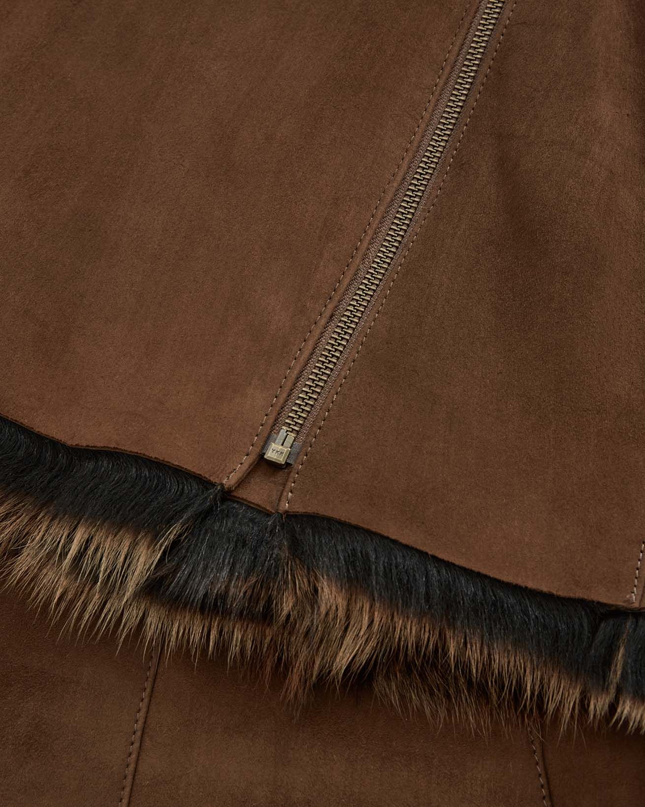 Nous avons repris le meilleur de notre manteau à capuche en laine de Toscane pour créer cette sublime veste longue, plus raffinée et plus confortable. La peau de mouton de Toscane est réputée pour son extrême douceur et sa laine soyeuse semblable à de la fourrure. Enveloppez-vous dans cette veste des plus confortables pour vous protéger efficacement du froid. Nous avons opté pour un cuir à l’aspect daim qui s’harmonise à la perfection avec les détails en laine à double teinture qui se démarquent au niveau du col, des manches et de l’ourlet. La capuche couvrante peut être boutonnée pour protéger votre visage et votre cou, tandis qu’une fermeture à glissière asymétrique apporte une touche de modernité.