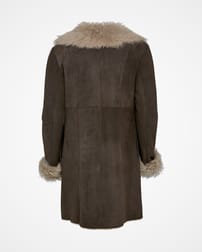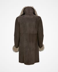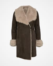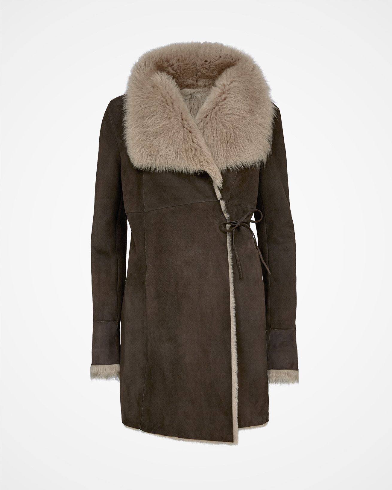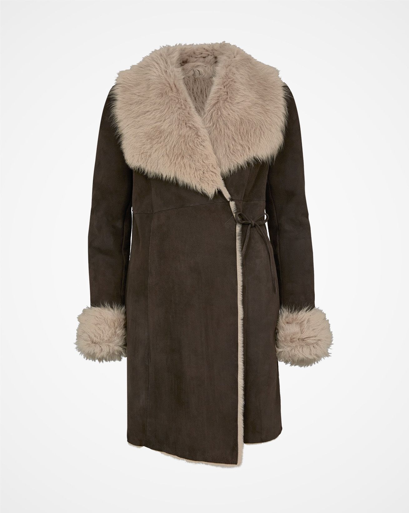 襟と袖口に贅沢なトスカーナ編みを使い、魅力的なメリノシープスキンからできたヨーロッパ製のラップコートは、あなたのお気に入りジーンズとセーターの上に重ね合わせるのに完璧です。