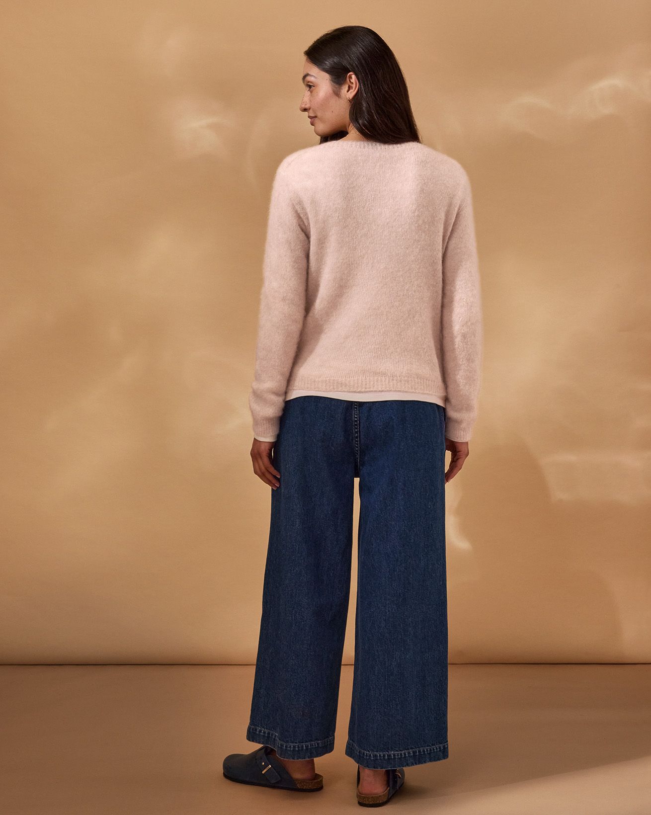 An alpaca-cotton-merino blend combines the softness and warmth of alpaca, the breathability of cotton, and the fine, elastic quality of merino wool. The result is a lightweight, cosy fabric with gentle stretch, ideal for comfortable, all-season wear.