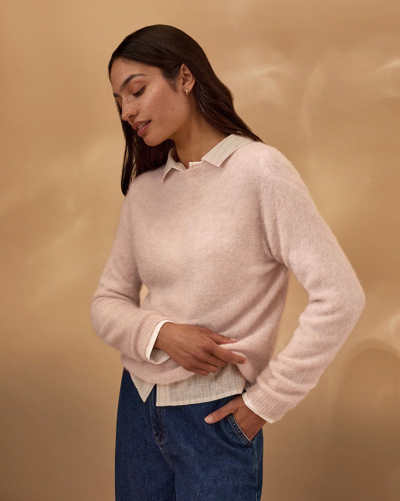 An alpaca-cotton-merino blend combines the softness and warmth of alpaca, the breathability of cotton, and the fine, elastic quality of merino wool. The result is a lightweight, cosy fabric with gentle stretch, ideal for comfortable, all-season wear.