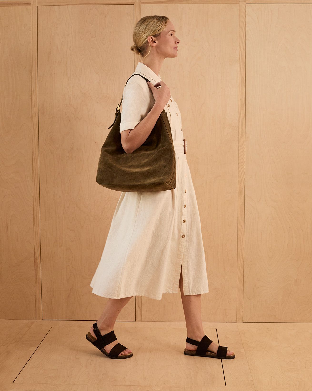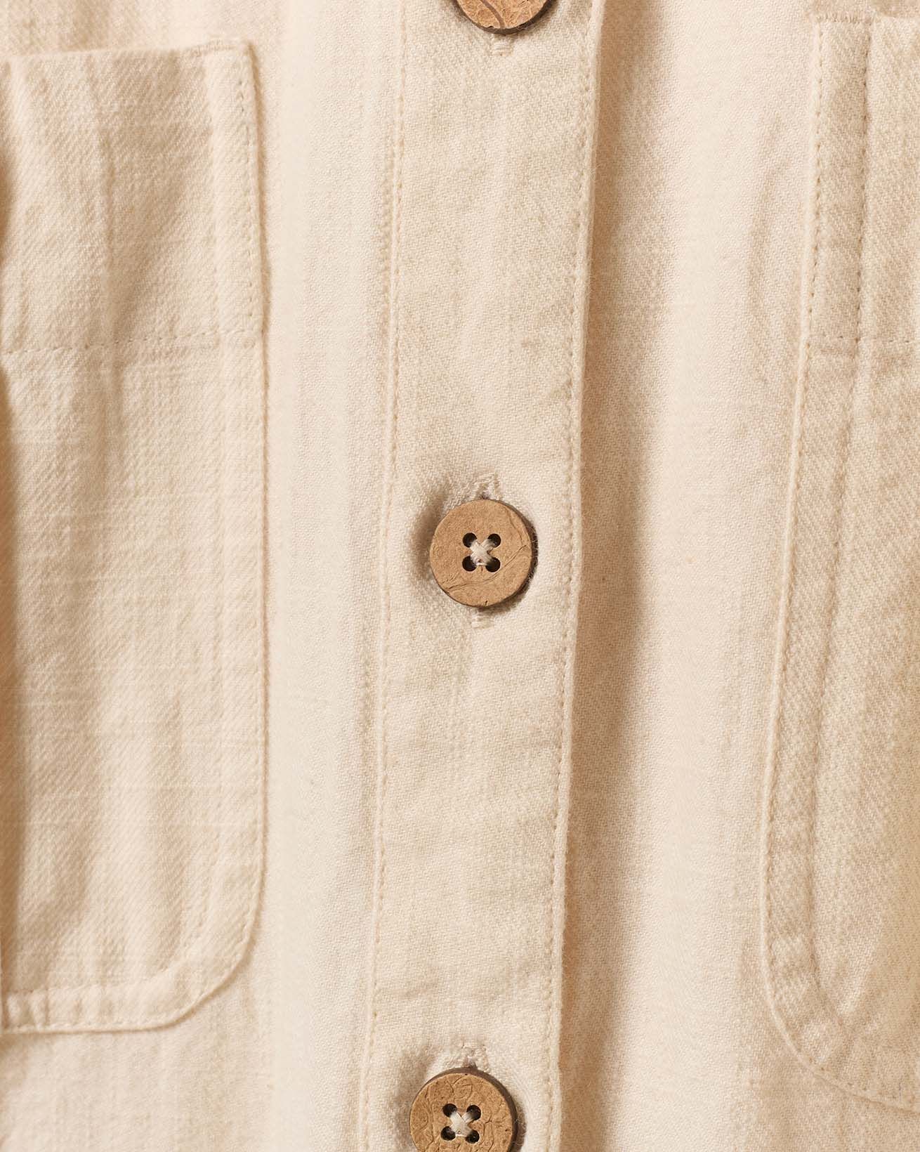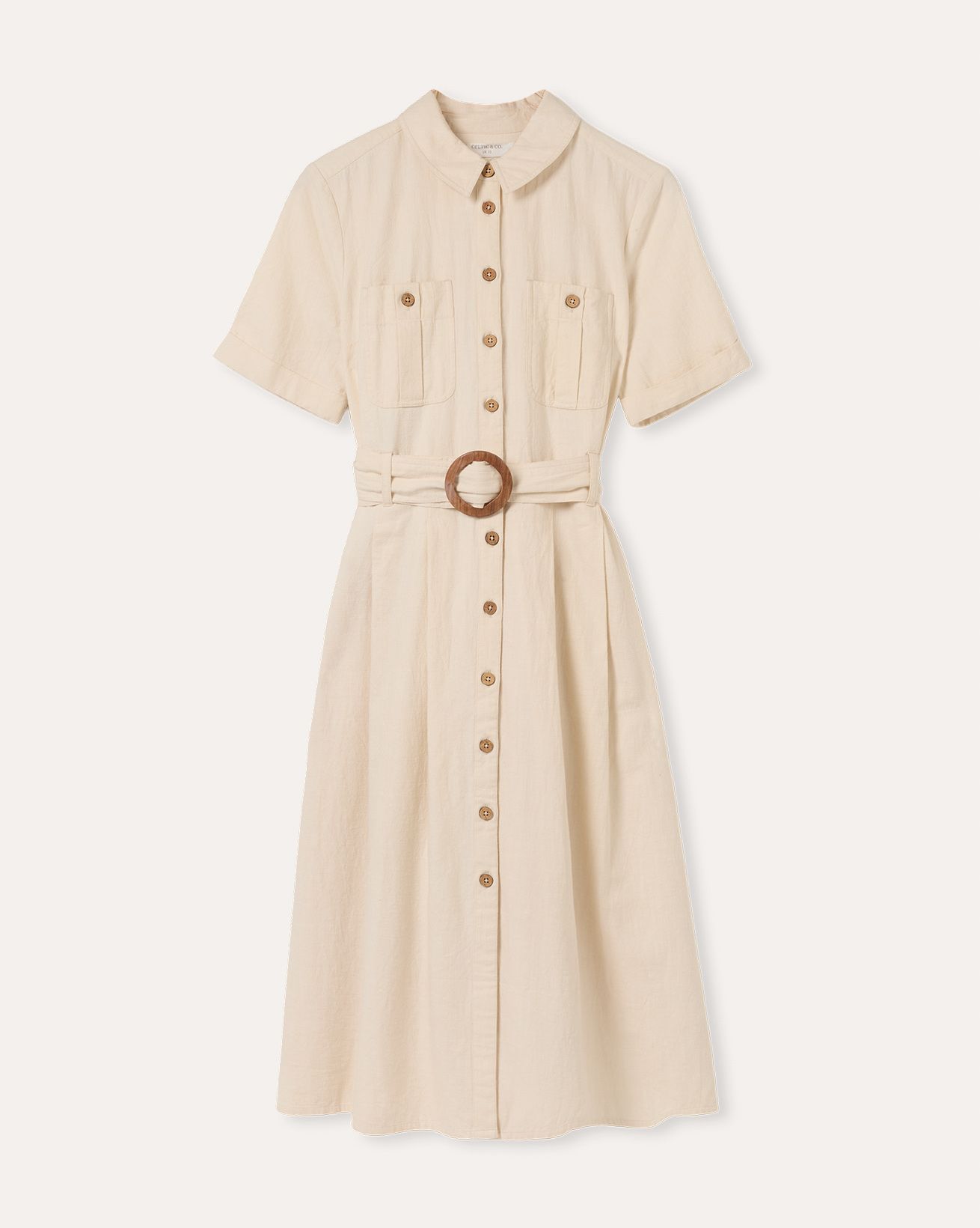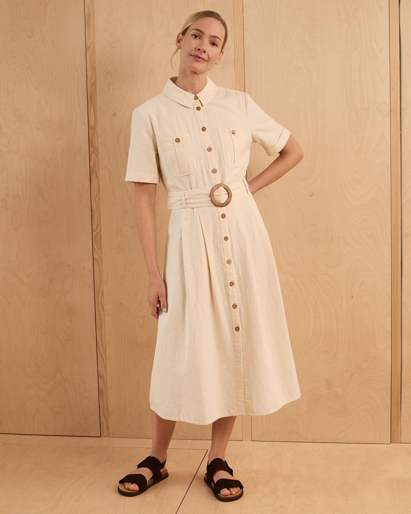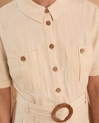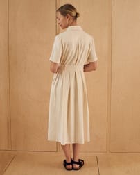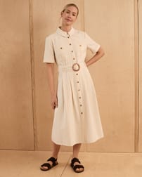 This fitted midi shirt dress features a classic collared neckline and a full button placket, complemented by chest pockets and a belted waist for a flattering silhouette. Crafted from undyed cotton with natural coconut buttons, it reflects a thoughtful approach to materials, combining timeless design with natural, sustainable elements.