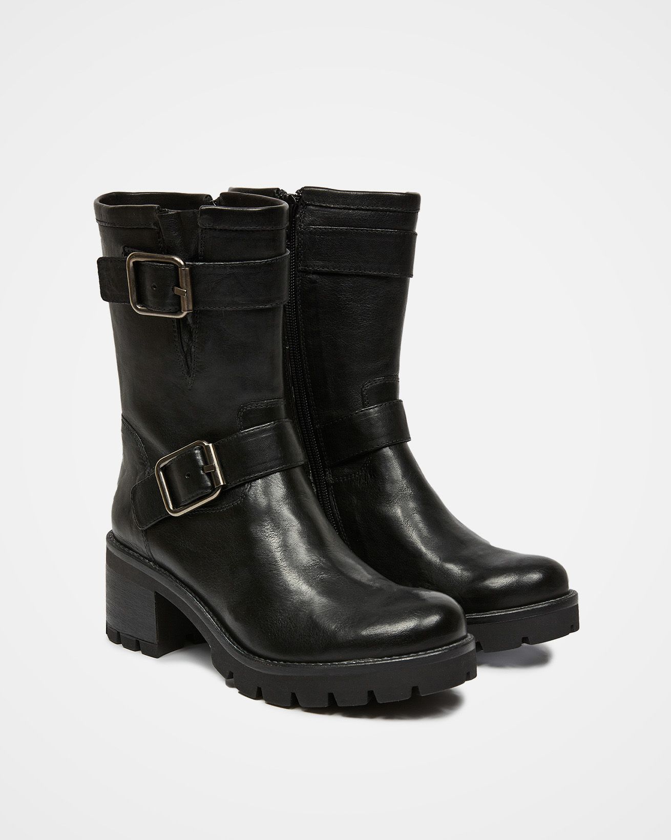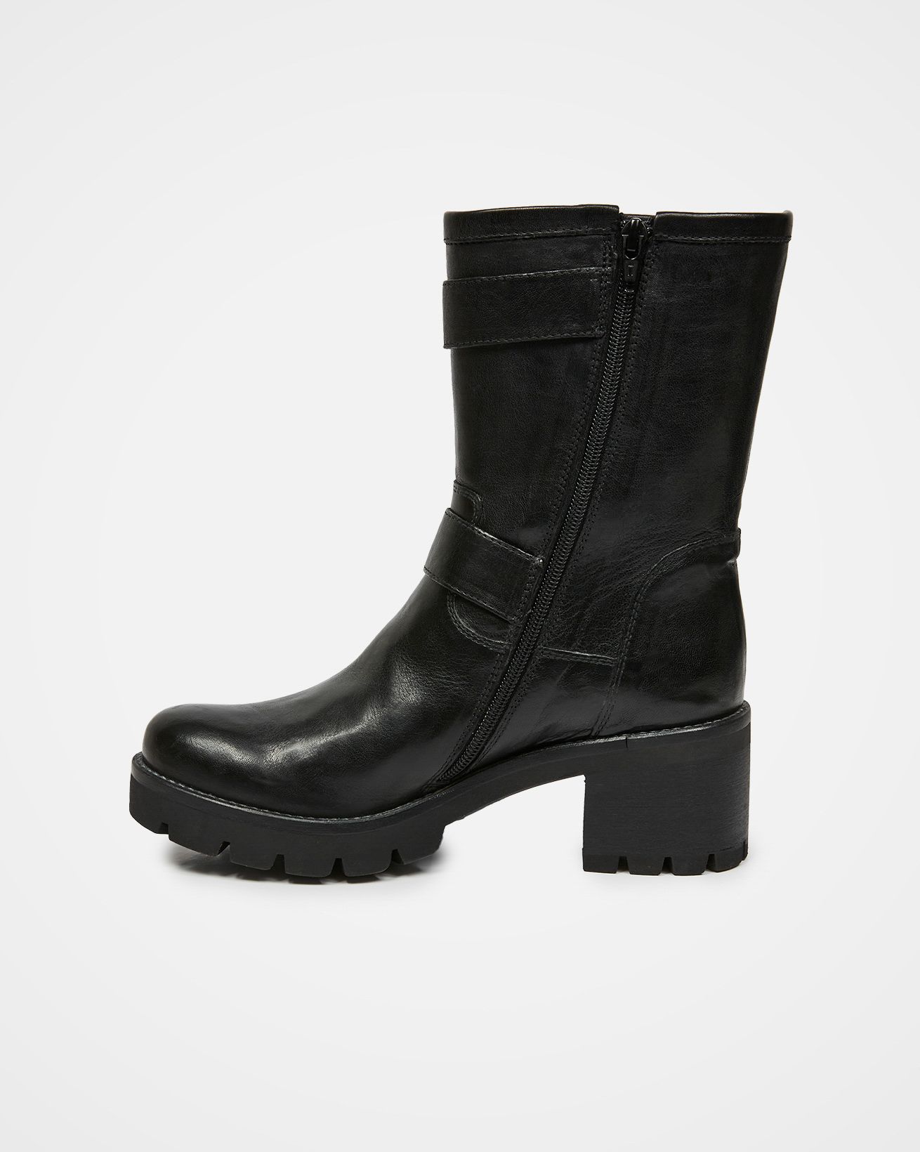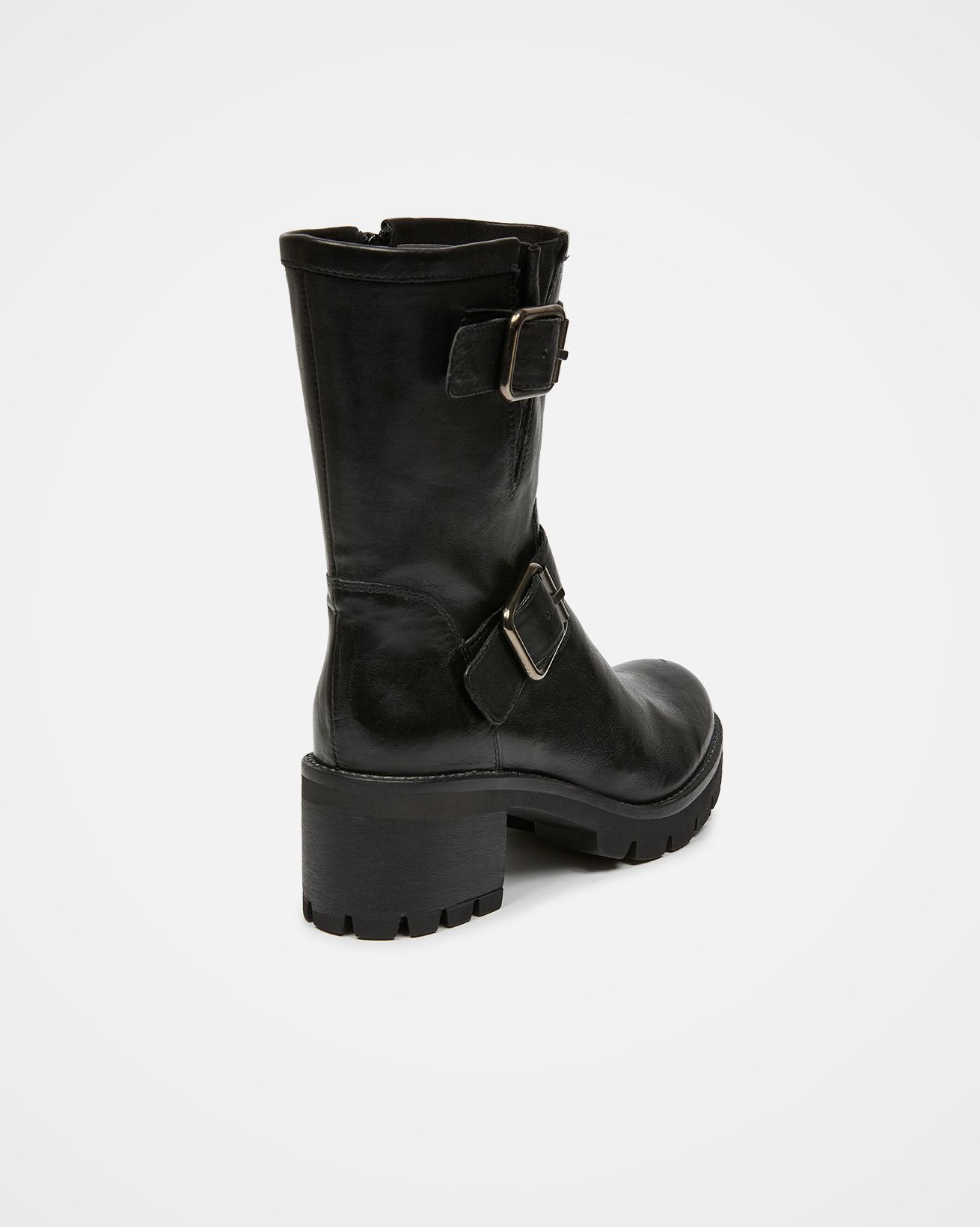 Trend-driven elements come through at the chunky outsole, which features deep cleating and a block heel with a wearable rise, and the straps with their antique brass roller buckles. Slip them on and off with ease using the full-length side zip.
