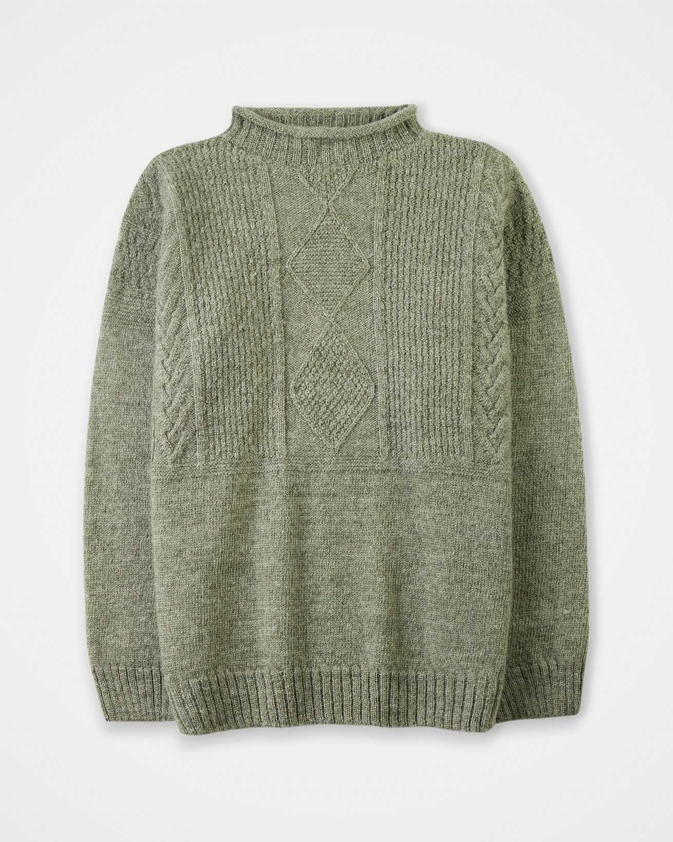 We're proud to say that from farm to factory our beautiful Gansey jumper is produced entirely in Britain. A take on the traditional fisherman’s Gansey jumper, we’ve been inspired by stitch patterns used historically in Cornish fishing villages. Details include a boxy, drop shoulder body shape with T sleeves and a ribbed and cast off rolled collar. Panelled stitch patterns run across the top half of the jumper, plus it is ‘knitted in the round’, meaning it is seamless, just as the traditional fisherman’s jumpers were made. Made using undyed wool, the natural fibres keep you warm in cold weather, but are breathable too.