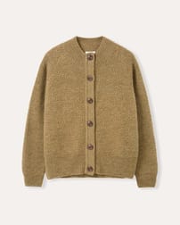 Crafted in Britain from undyed British wool, this moss stitch cardigan features a funnel neck, raglan sleeves, and a comfortable body fit. Finished with ribbed trims and natural corozo buttons, it offers warmth and texture in an entirely British-made piece.