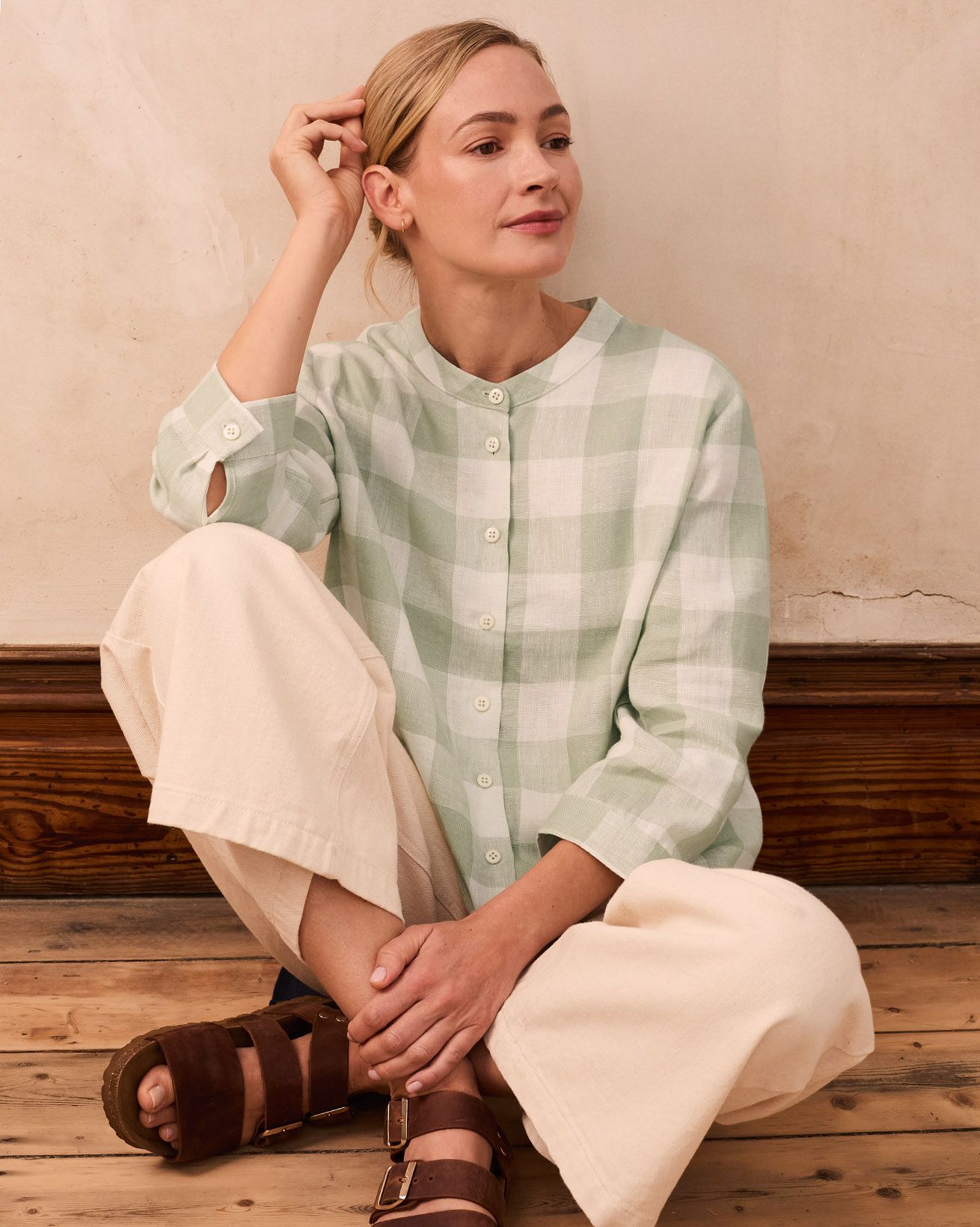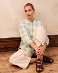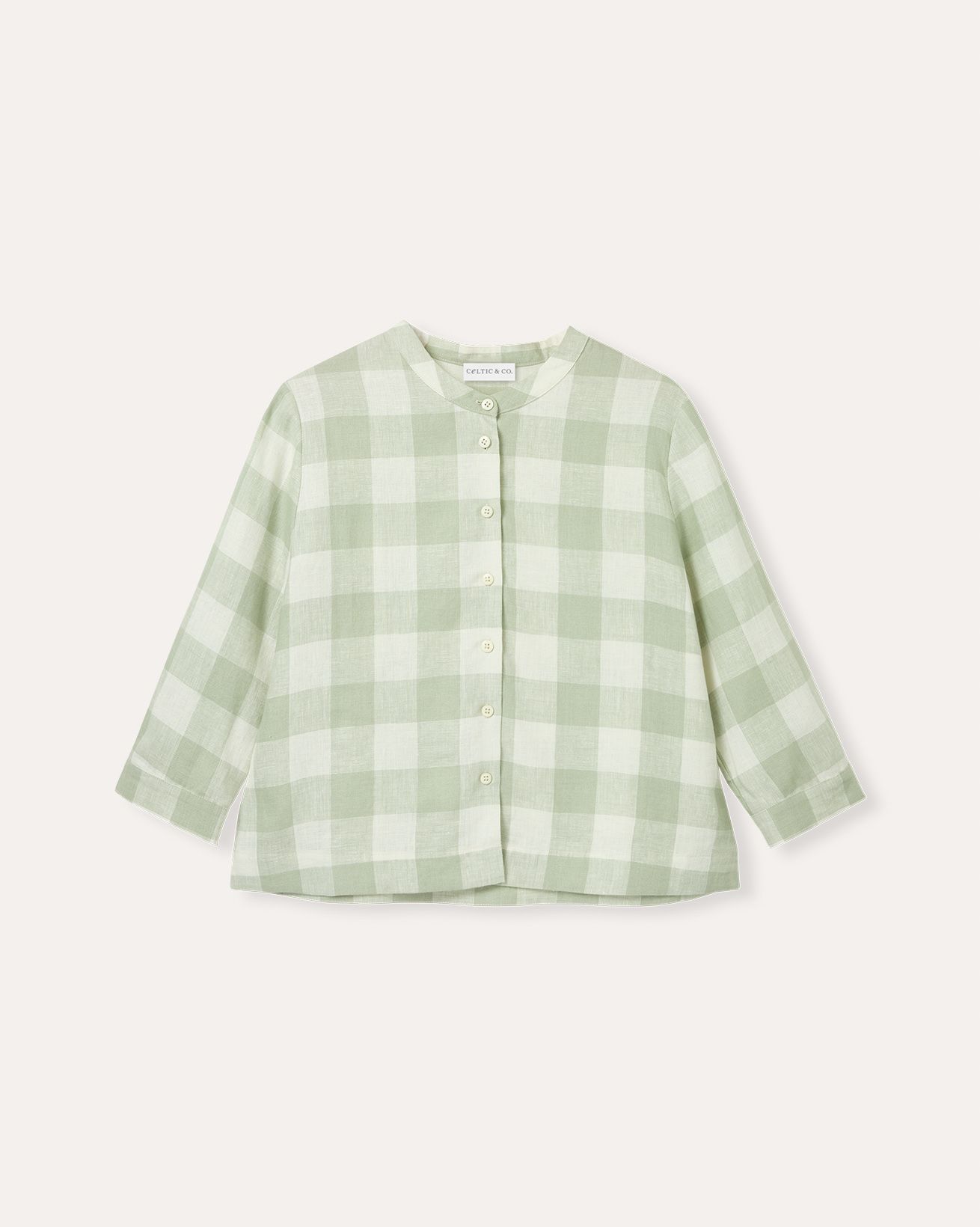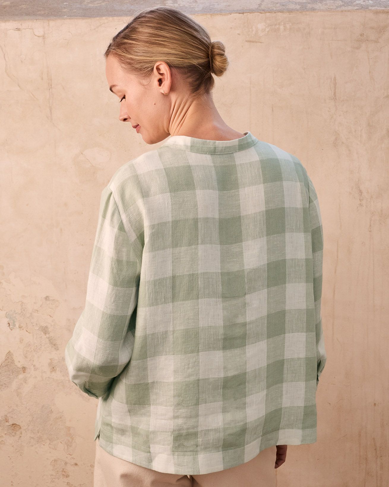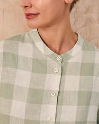 This blouse showcases a grandad collar neckline and a flattering swing shape, complemented by bracelet-length sleeves. Made from linen, it combines breathability with style, perfect for warm days or layered looks throughout the seasons.