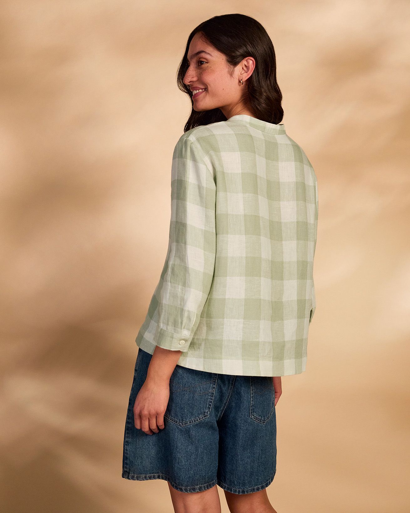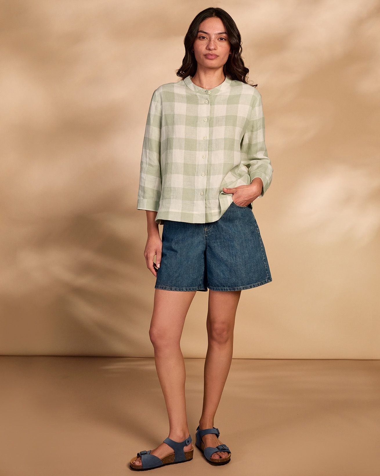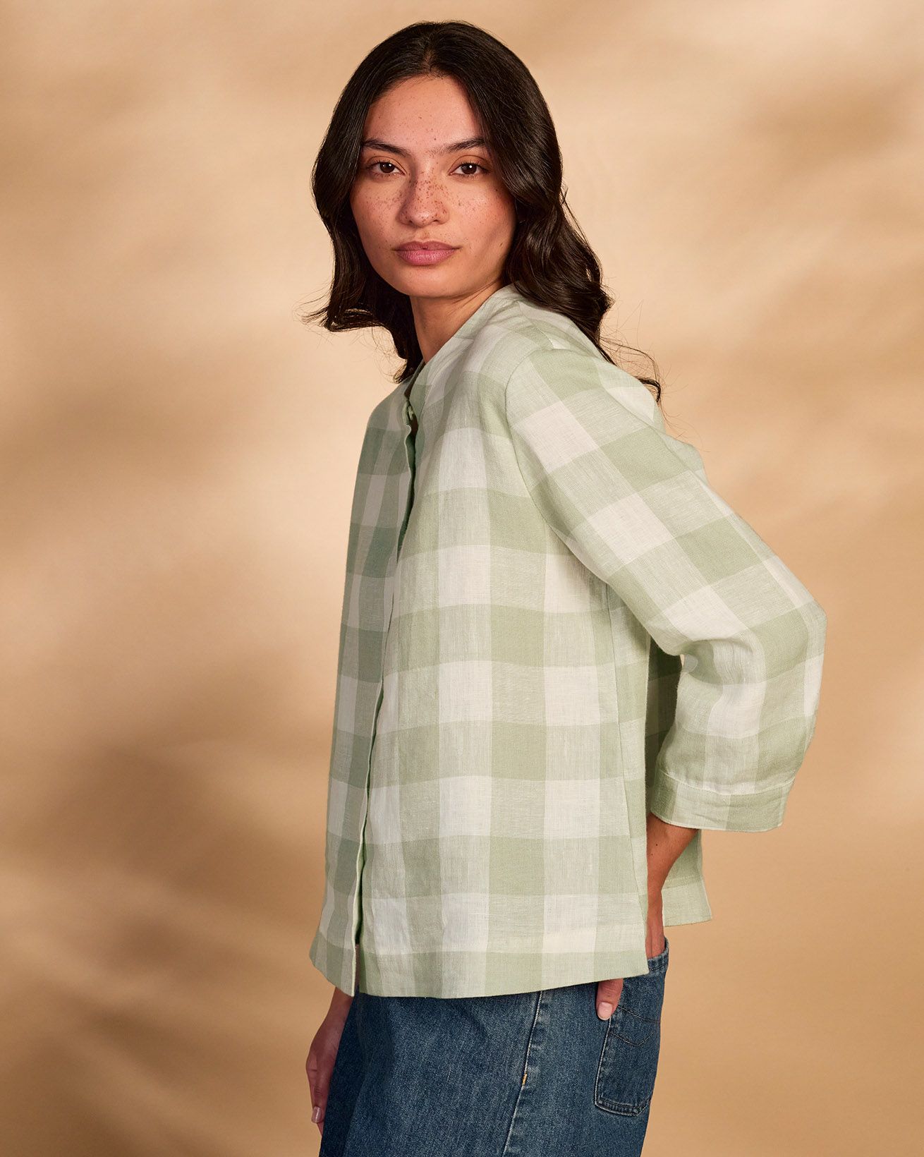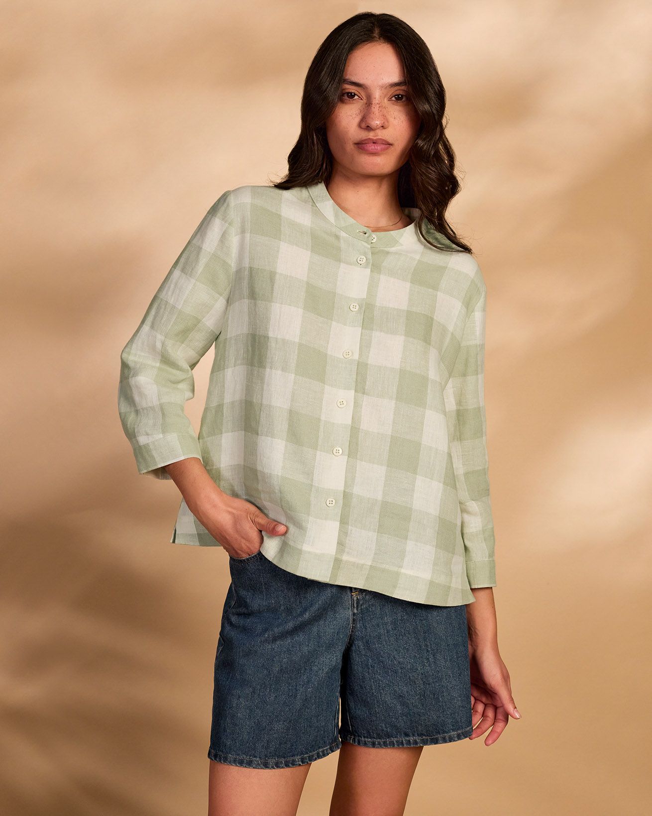 This blouse showcases a grandad collar neckline and a flattering swing shape, complemented by bracelet-length sleeves. Made from linen, it combines breathability with style, perfect for warm days or layered looks throughout the seasons.