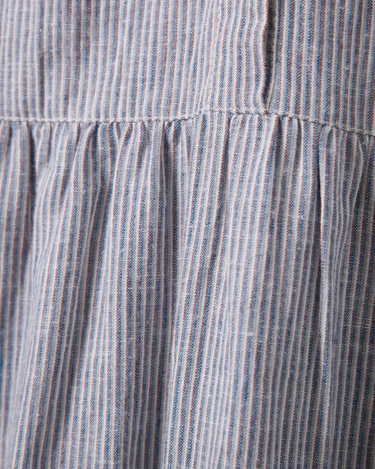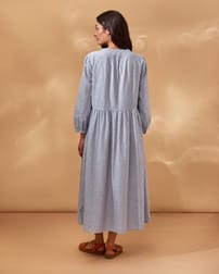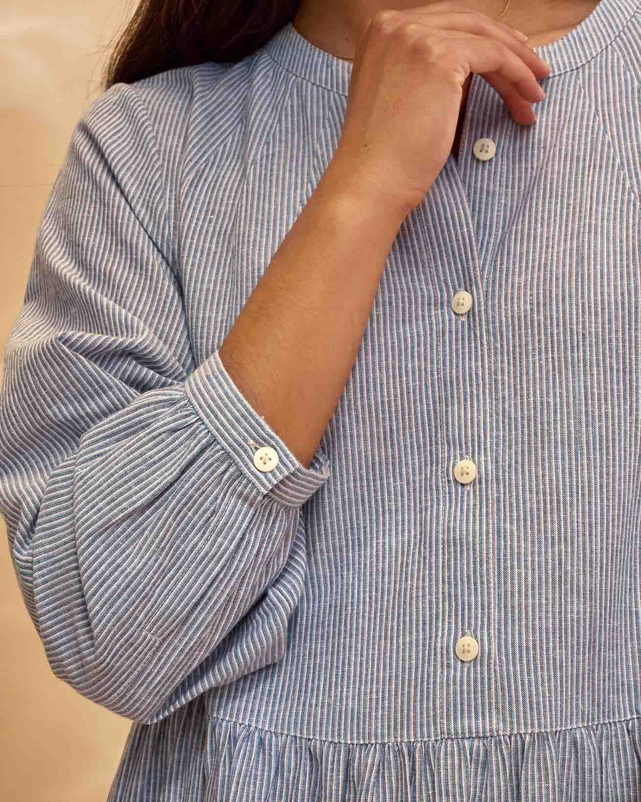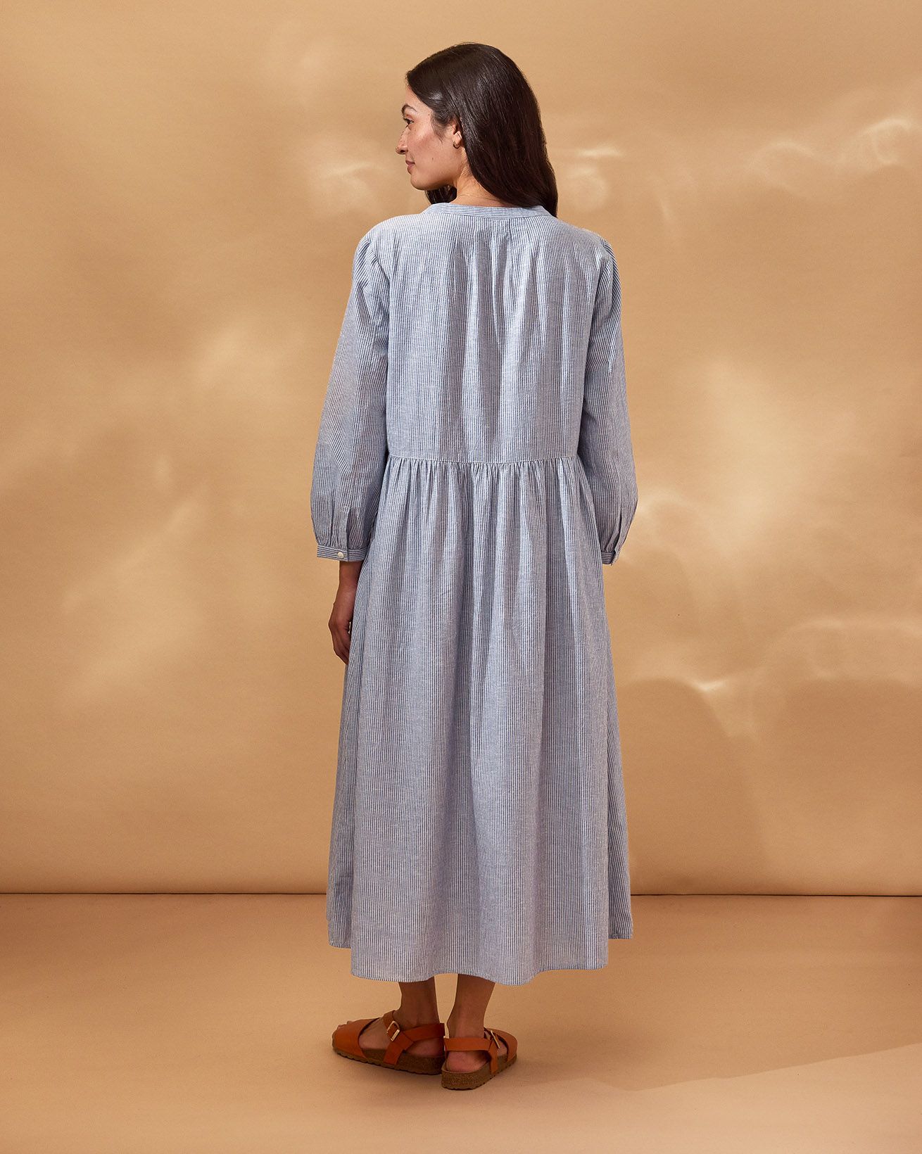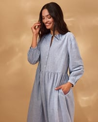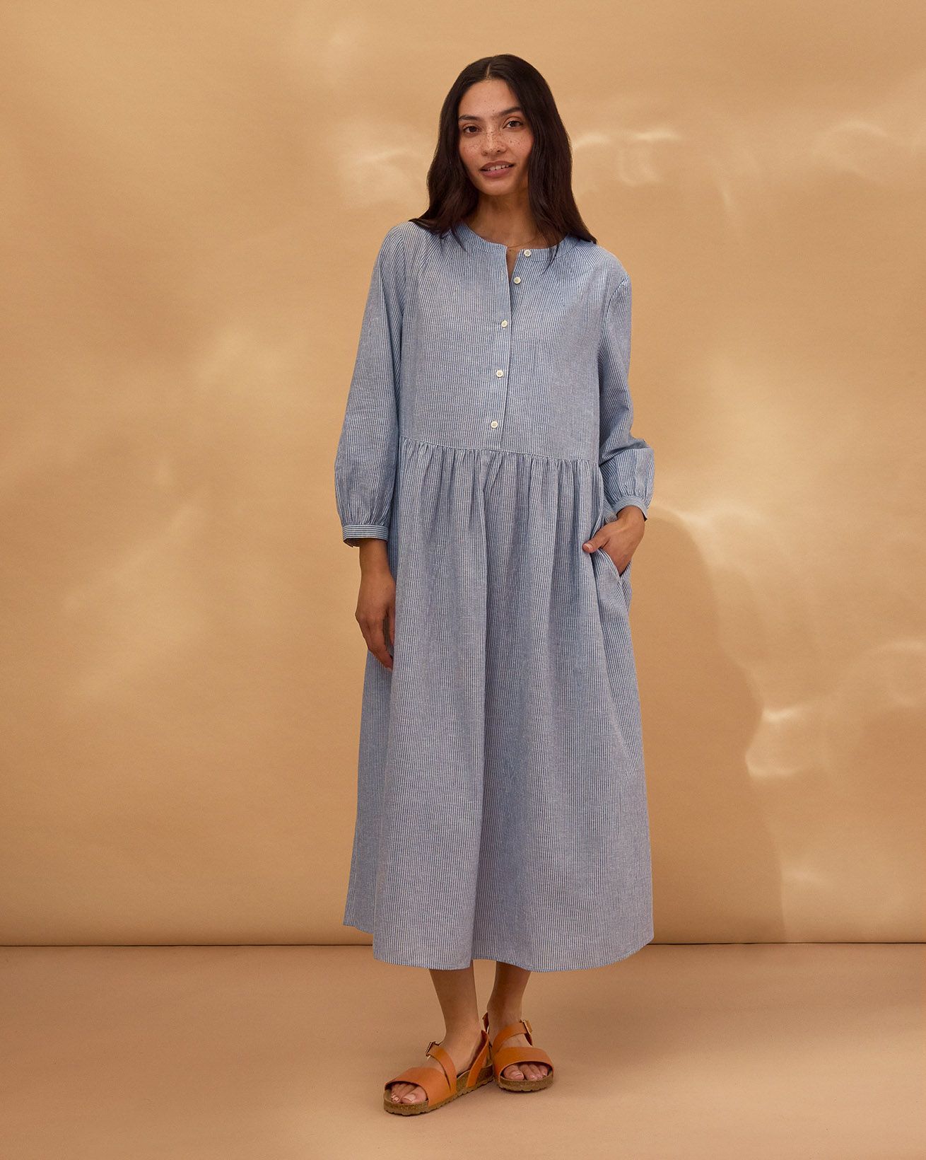 This midi dress features a relaxed fit with a round neckline and long sleeves, detailed with a grandad collar and a half button placket fastening. Made from yarn-dyed stripe fabric, it offers subtle texture and depth, combining comfort with timeless appeal in a naturally refined design.
