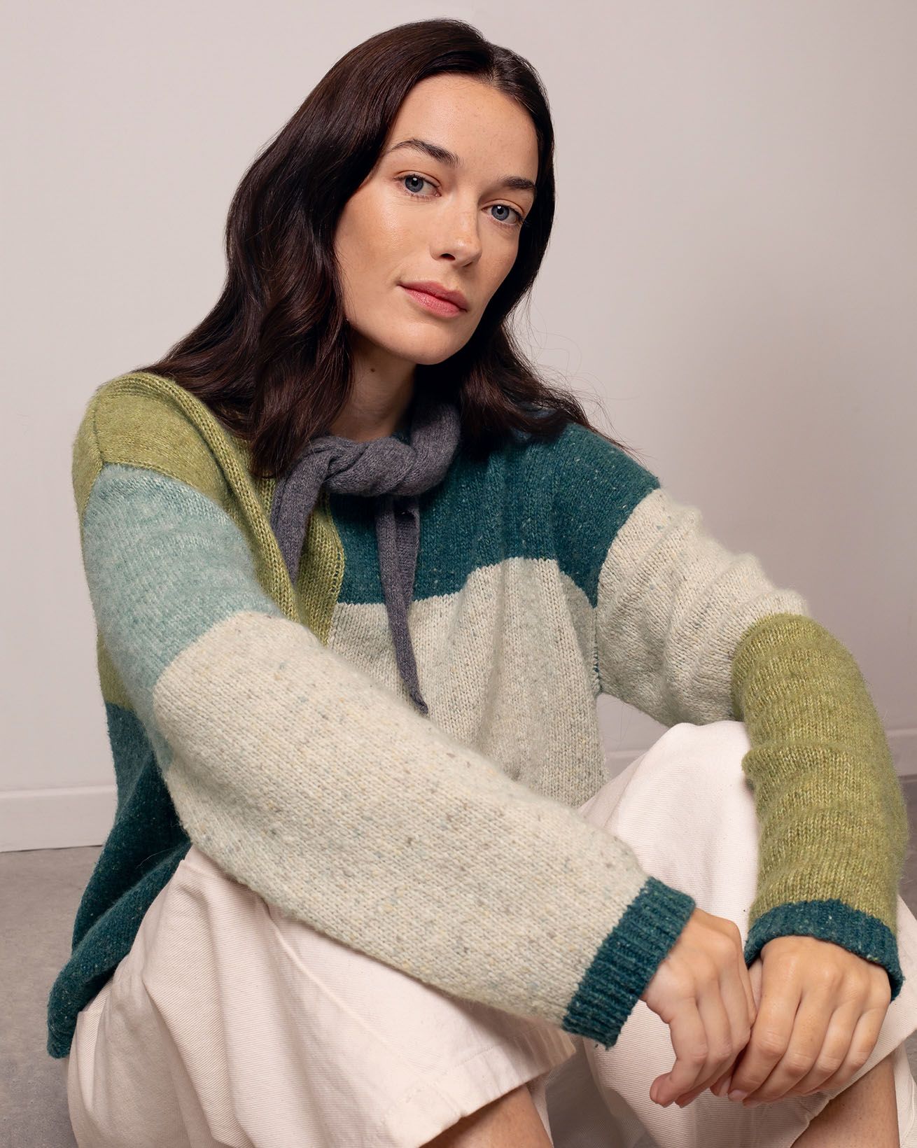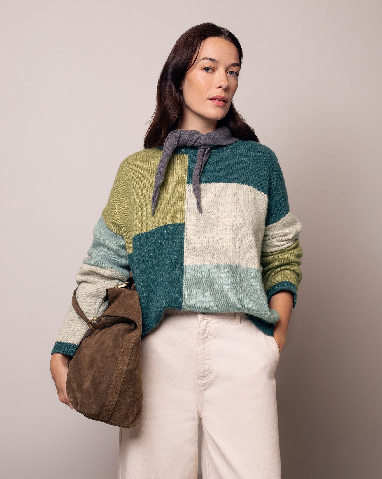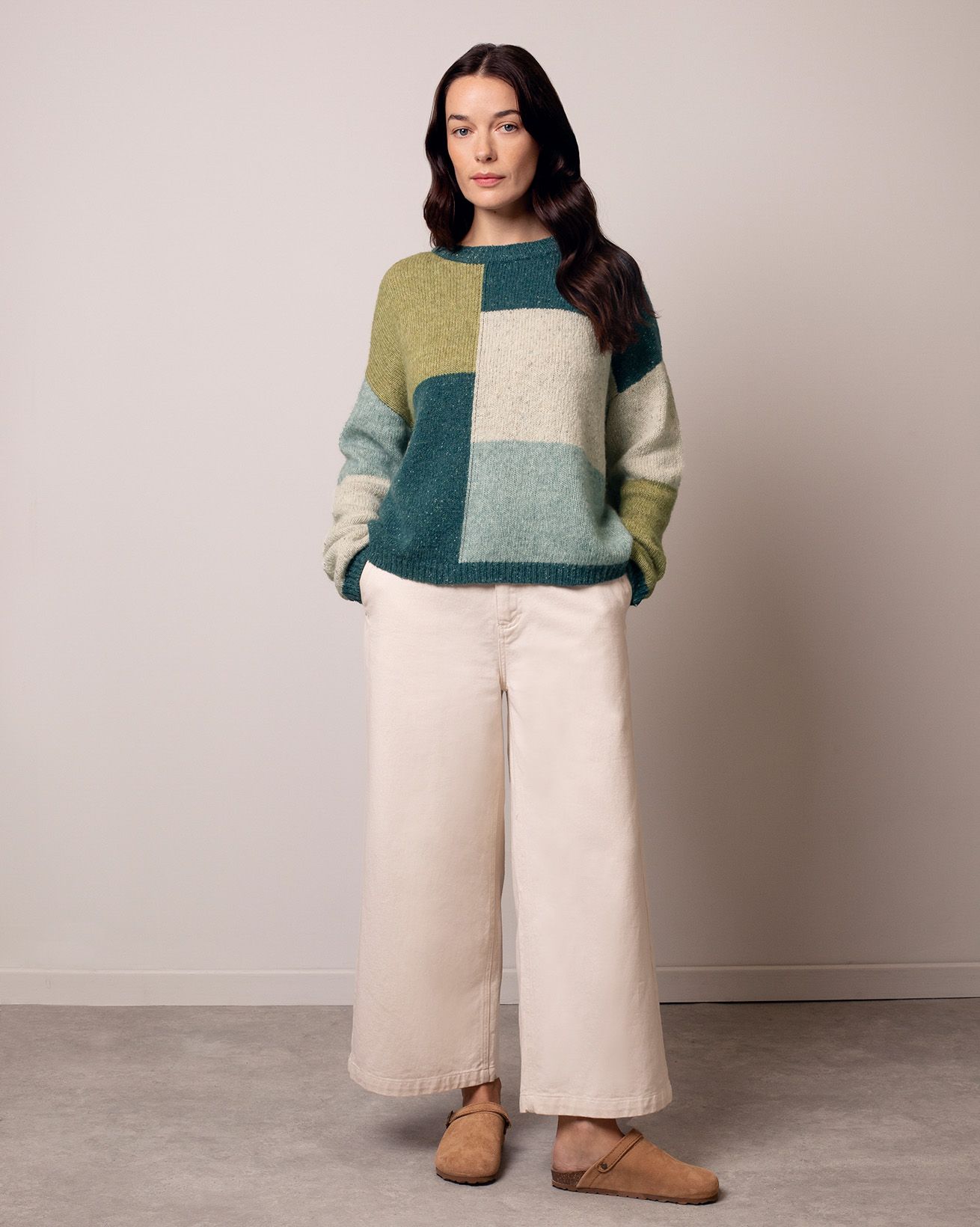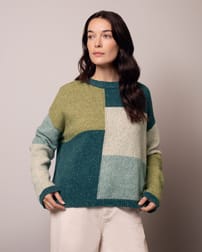 Our Colour block Intarsia Jumper features true intarsia colour blocking inspired by aerial views of fields, blending flecked and lofty yarns for texture and depth. With a classic crew neck, drop shoulders and ribbed trims, it offers a unique and comfortable layer that reflects a thoughtful approach to design.