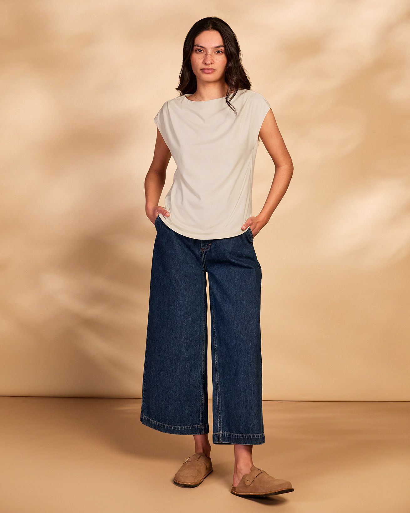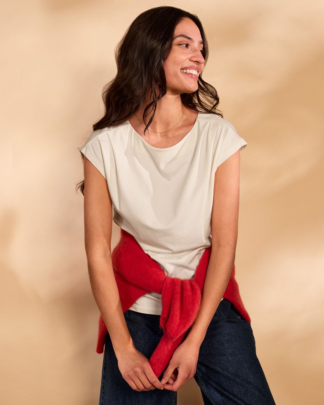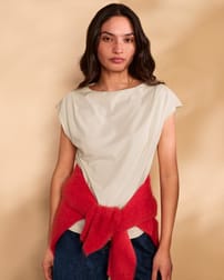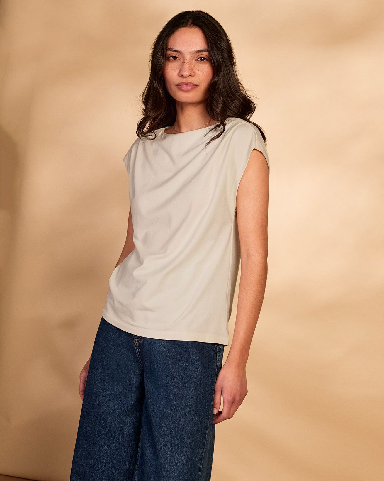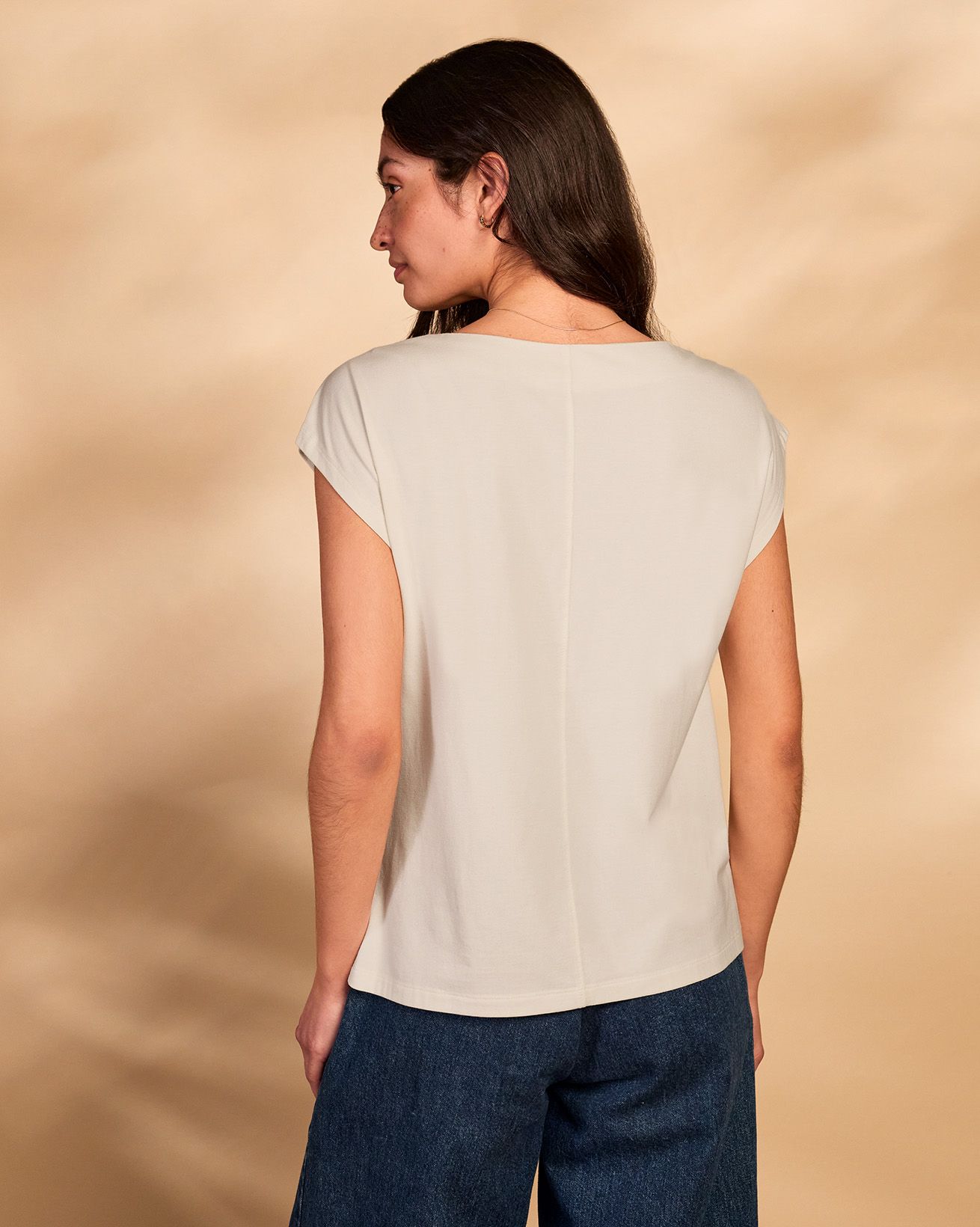 This fitted slash neck T-shirt features delicate pleated detailing and cap sleeves, offering a refined silhouette without the need for fastenings. Crafted with attention to natural materials, it provides understated elegance and comfort for everyday wear.