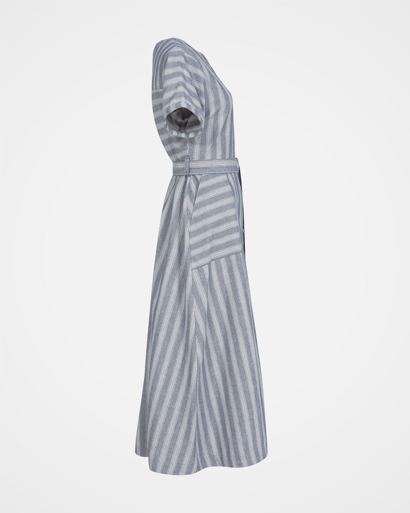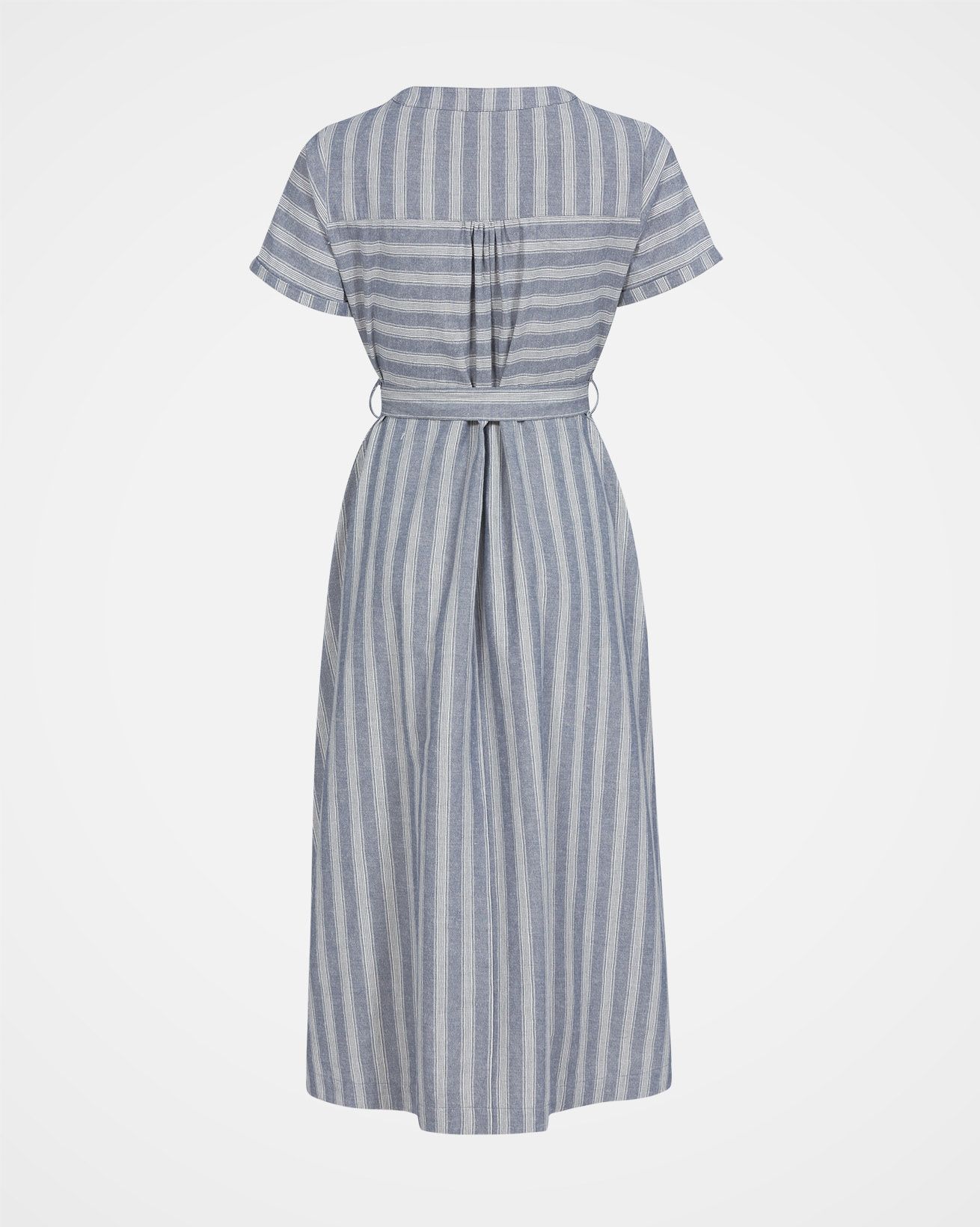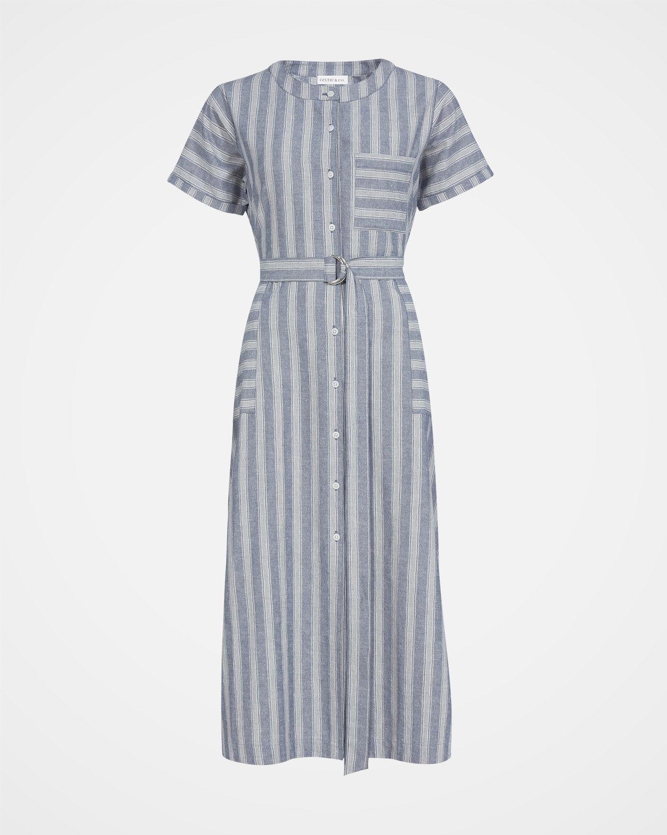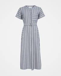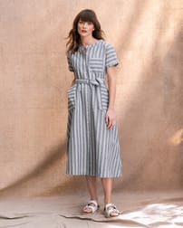 This button through, woven striped midi dress is made in a breathable cotton linen blend fabric, with a beautiful texture. It's pull-on style makes it an effortless, classic garment. A D-ring belt at the waist allows the dress to be adjusted to create your desired fit. Featuring a chest pocket and two hip pockets, turn back cuffs on the sleeves, a crew neckline and Corozo buttons.