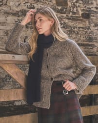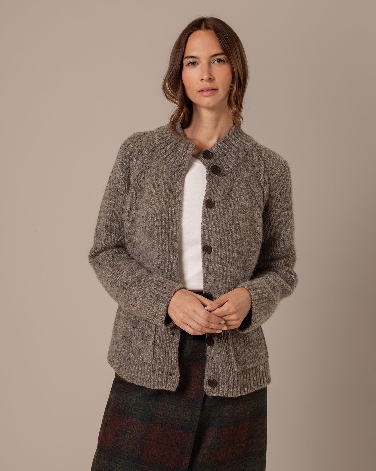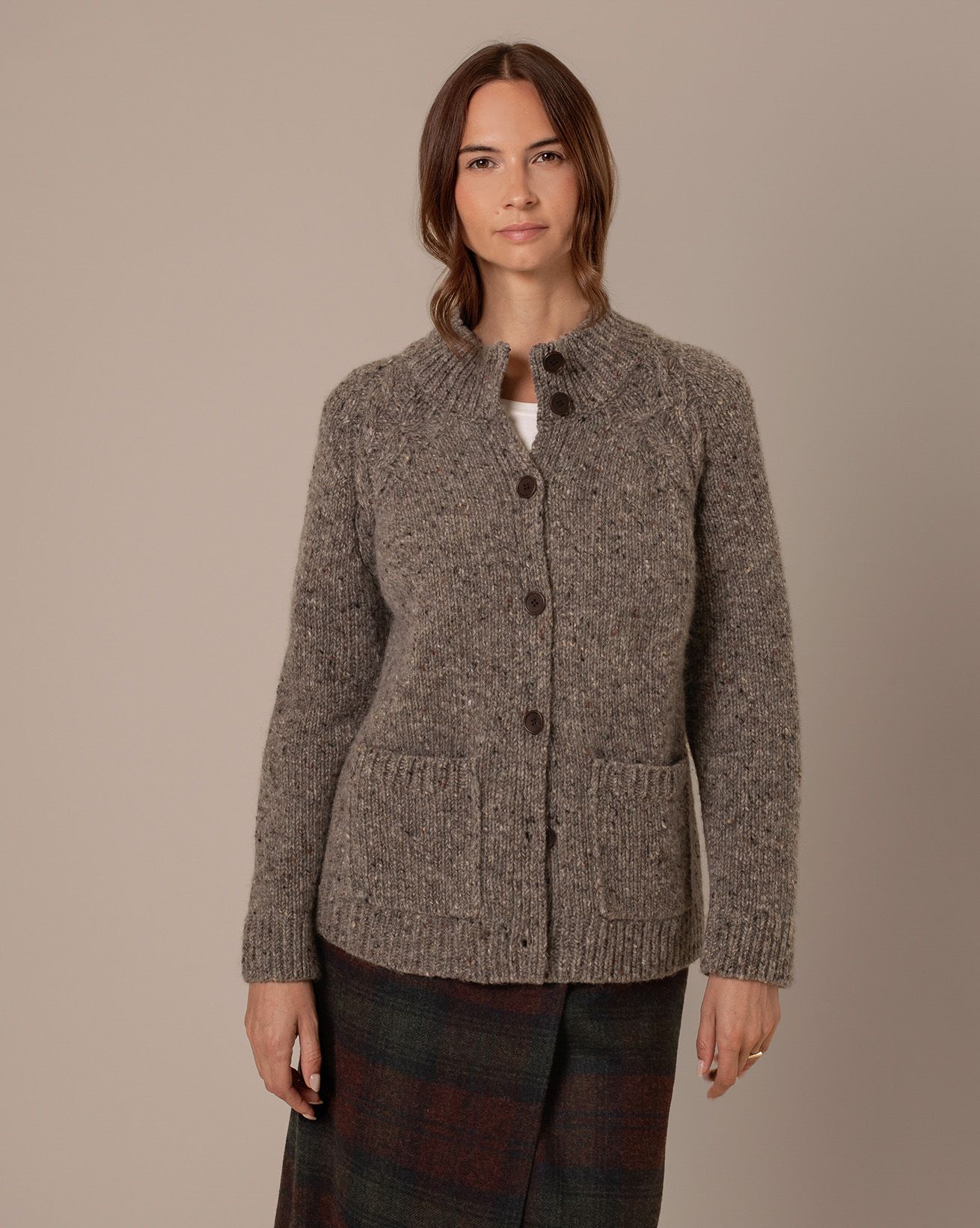 Perfect for wrapping up against cold winds, this warm funnel neck cardigan is crafted in a chunky weight Donegal yarn with patch pockets and ribbed cuffs, collar and hem. Details include cabling down the Raglan sleeve seam and Corozo buttons running down the front to fasten.
