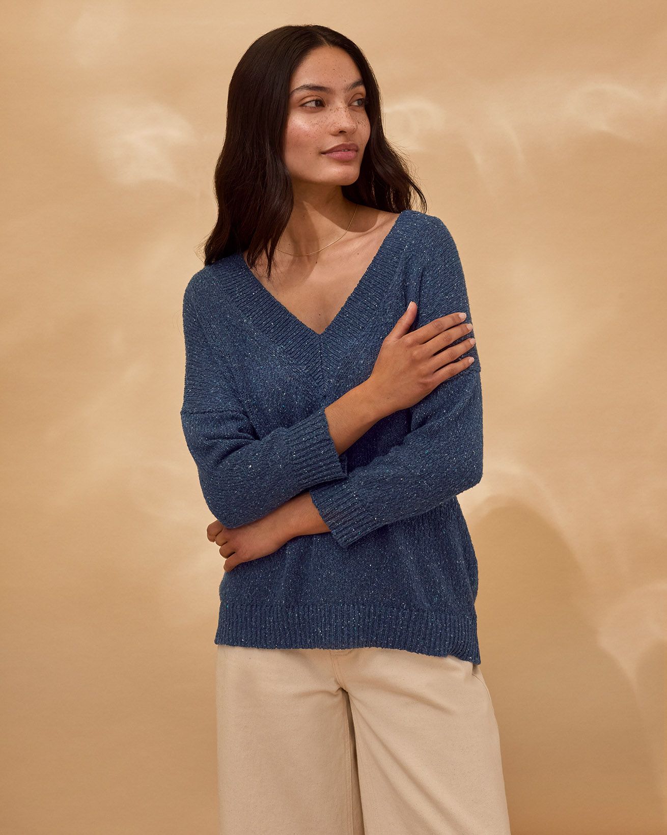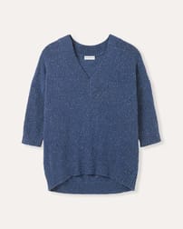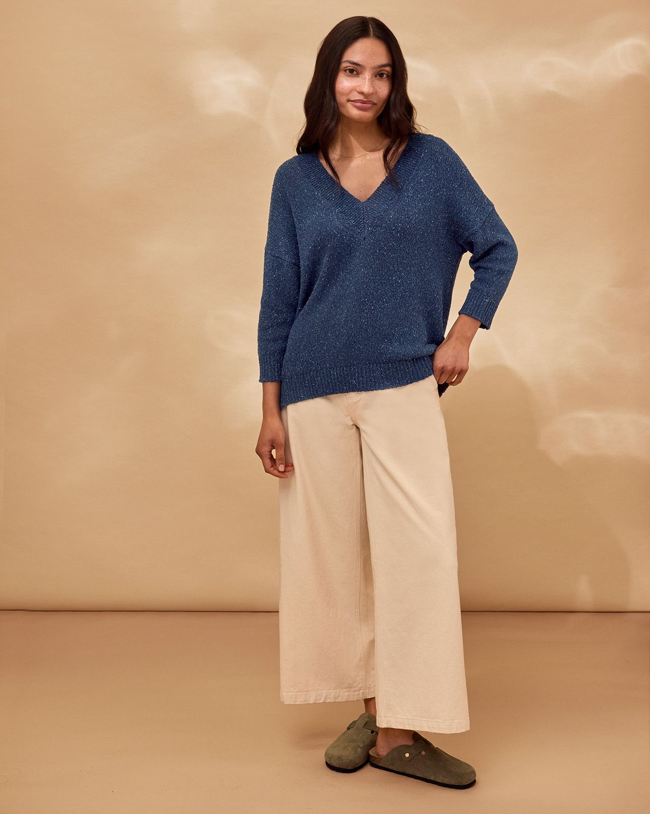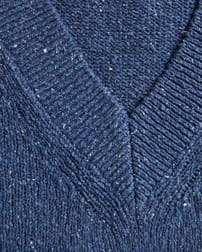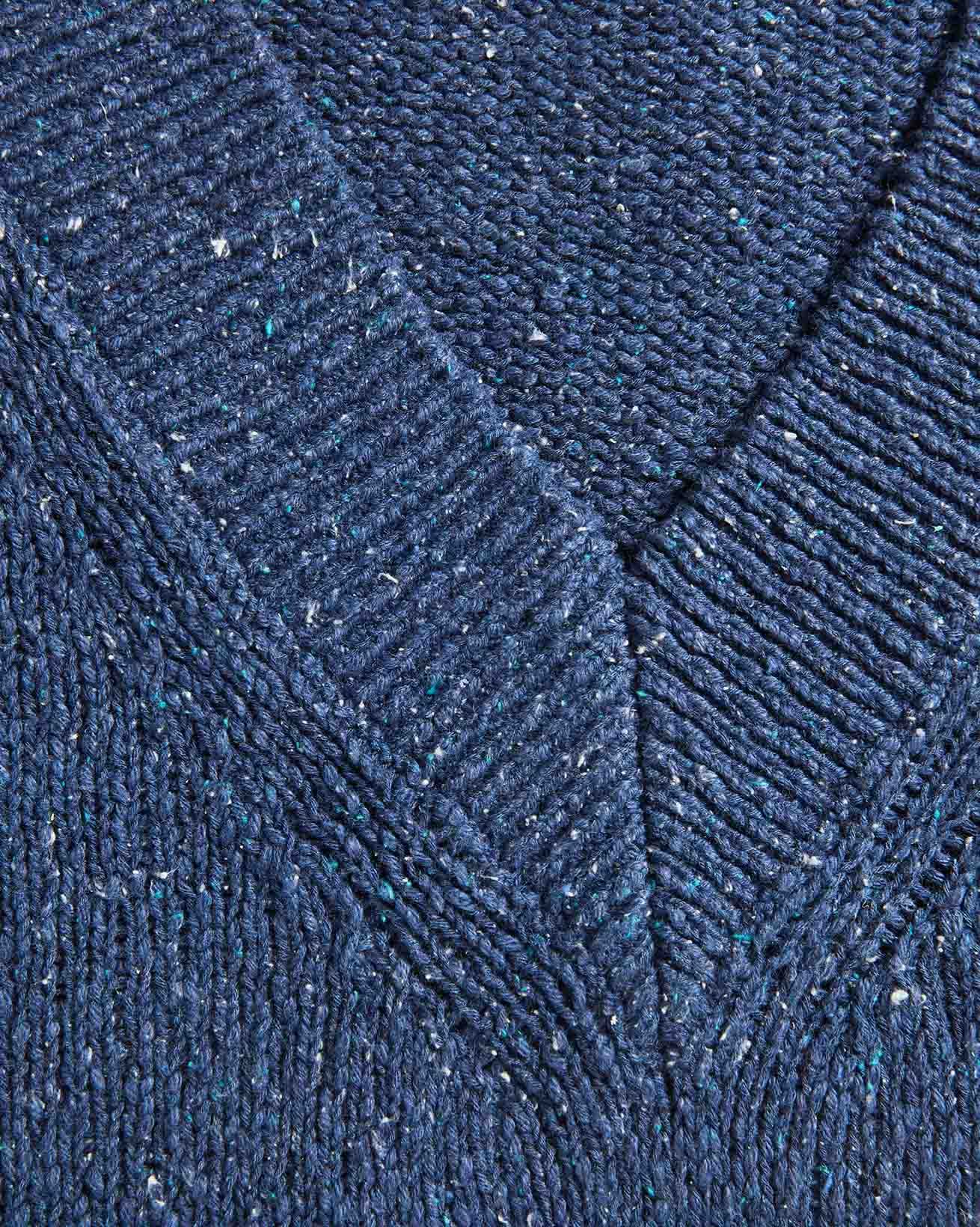 Crafted from a distinctive flecked yarn featuring Silk Noil neps, this linen, cotton, silk blend V-neck offers a breathable, high-summer option. Designed with a drop shoulder and deep ribbed neck trim, its cropped sleeves and French shoulder seams provide a refined yet relaxed silhouette. The all-over flecked texture adds subtle character to this versatile piece.