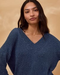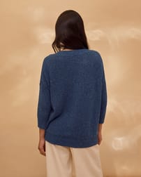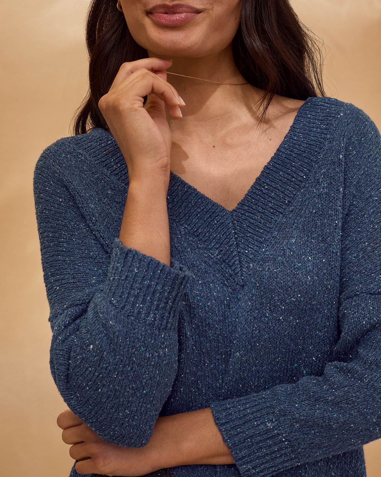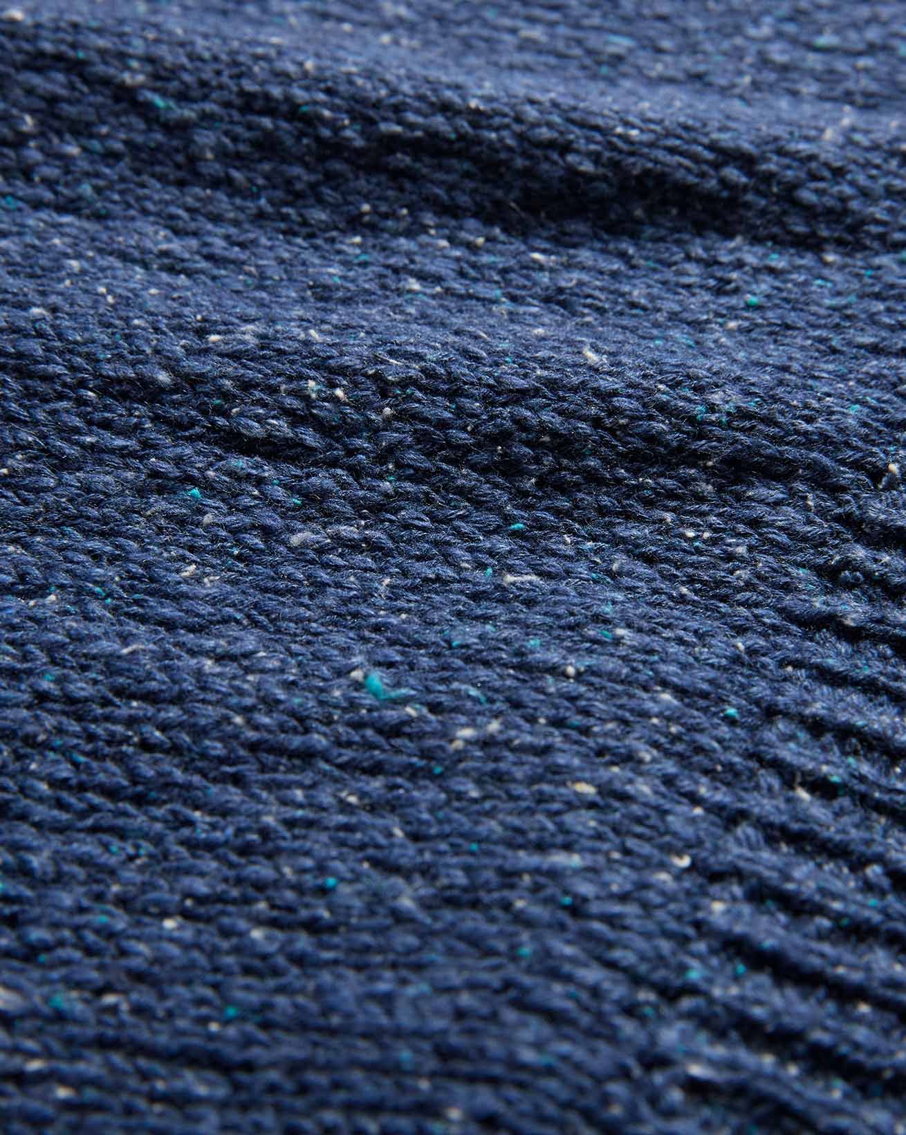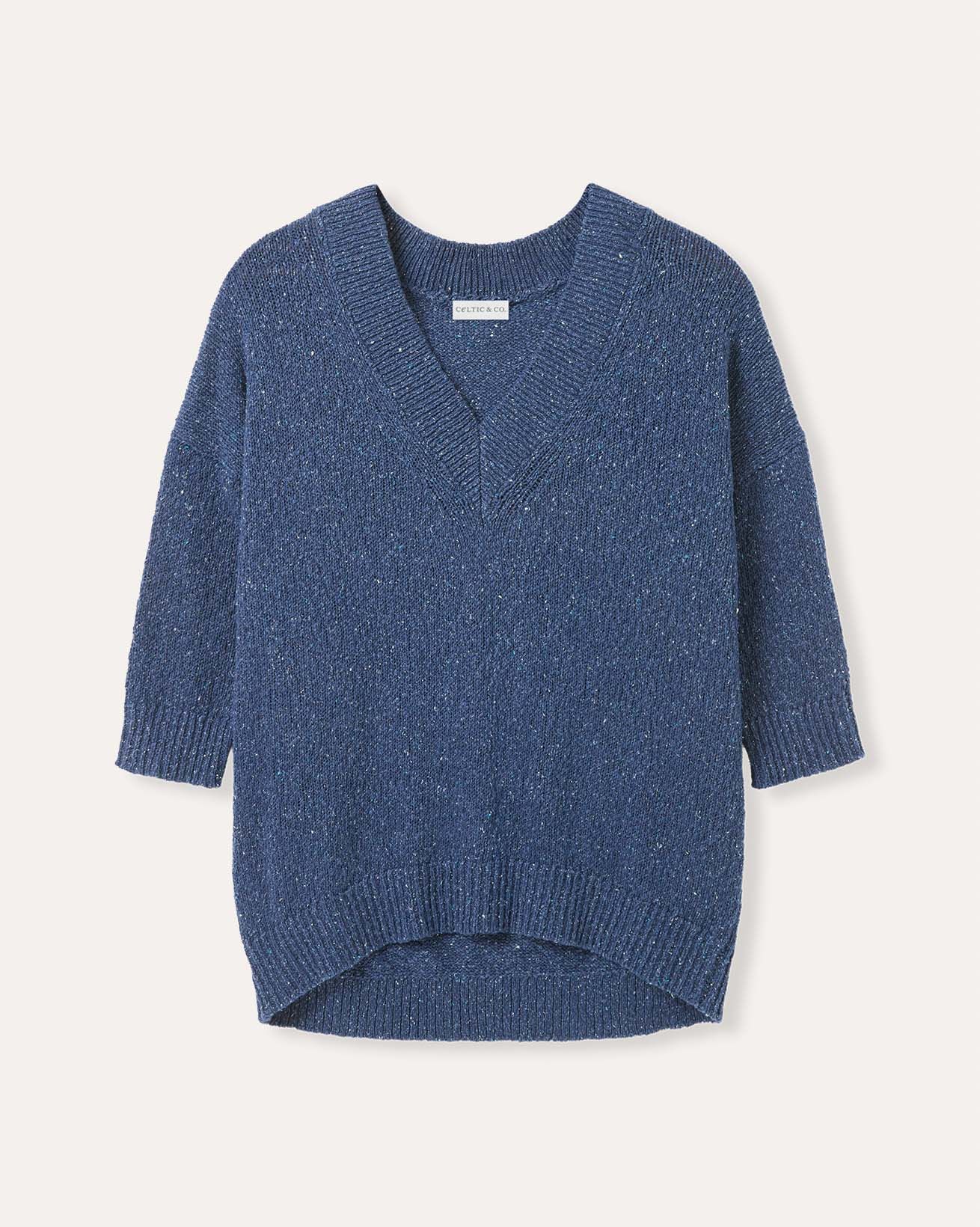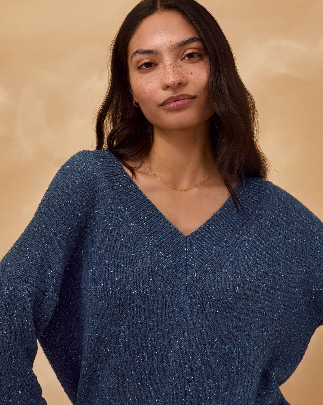 Crafted from a distinctive flecked yarn featuring Silk Noil neps, this linen, cotton, silk blend V-neck offers a breathable, high-summer option. Designed with a drop shoulder and deep ribbed neck trim, its cropped sleeves and French shoulder seams provide a refined yet relaxed silhouette. The all-over flecked texture adds subtle character to this versatile piece.