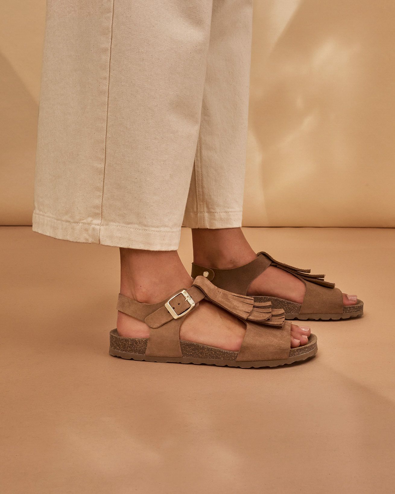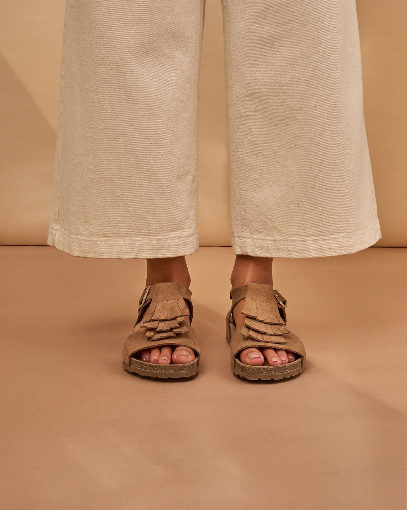 These sandals feature delicate fringed detailing paired with a secure metal buckle fastening, combining refined simplicity with subtle texture. Crafted to offer both comfort and enduring style, they're a timeless choice for warm-weather wear, reflecting a thoughtful approach to natural materials and timeless design.