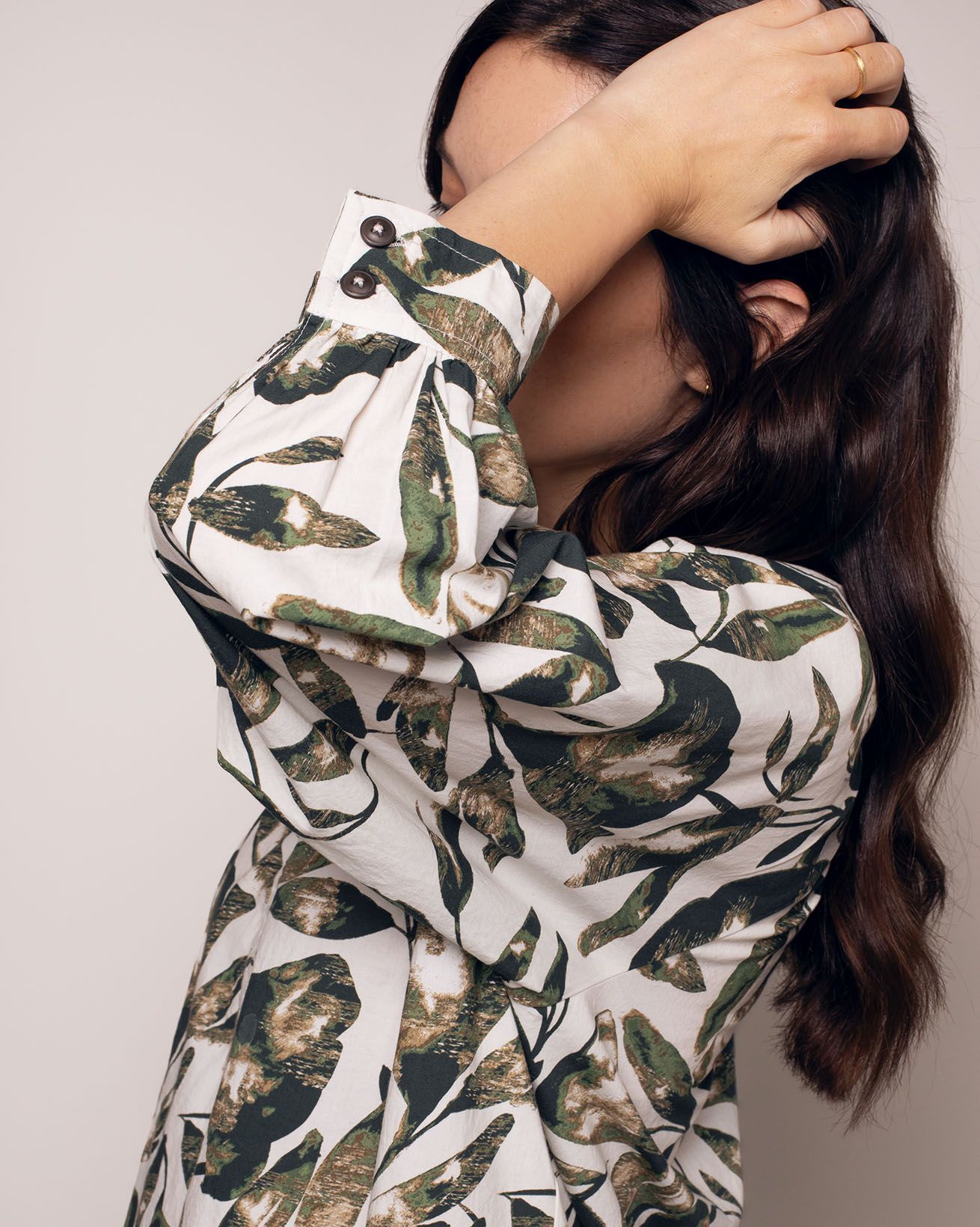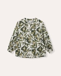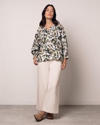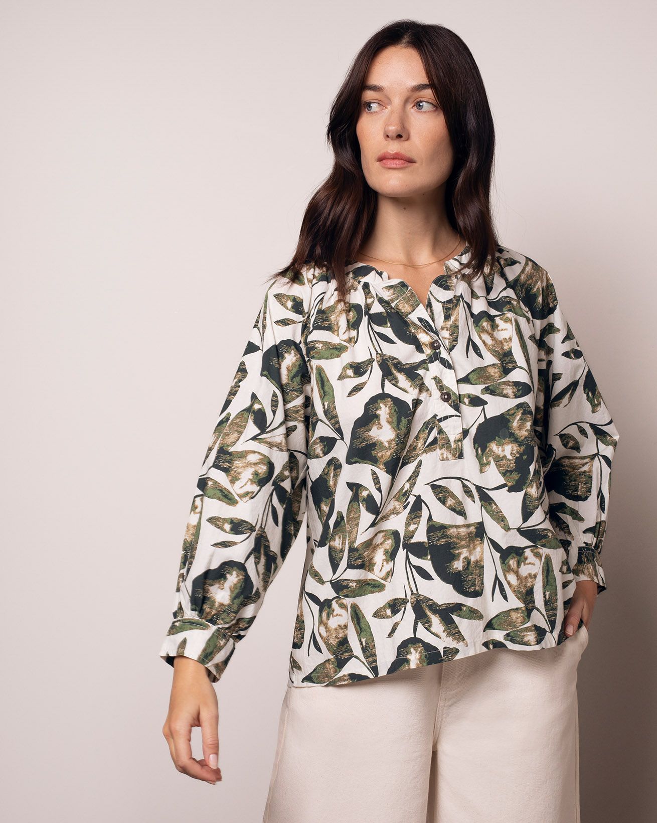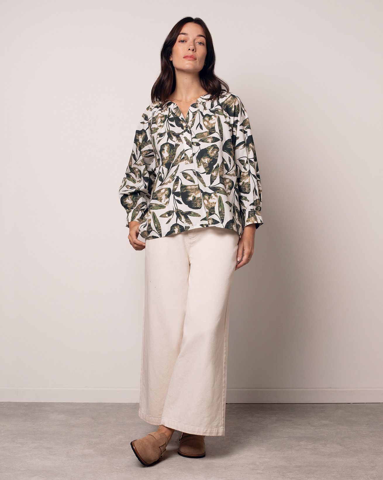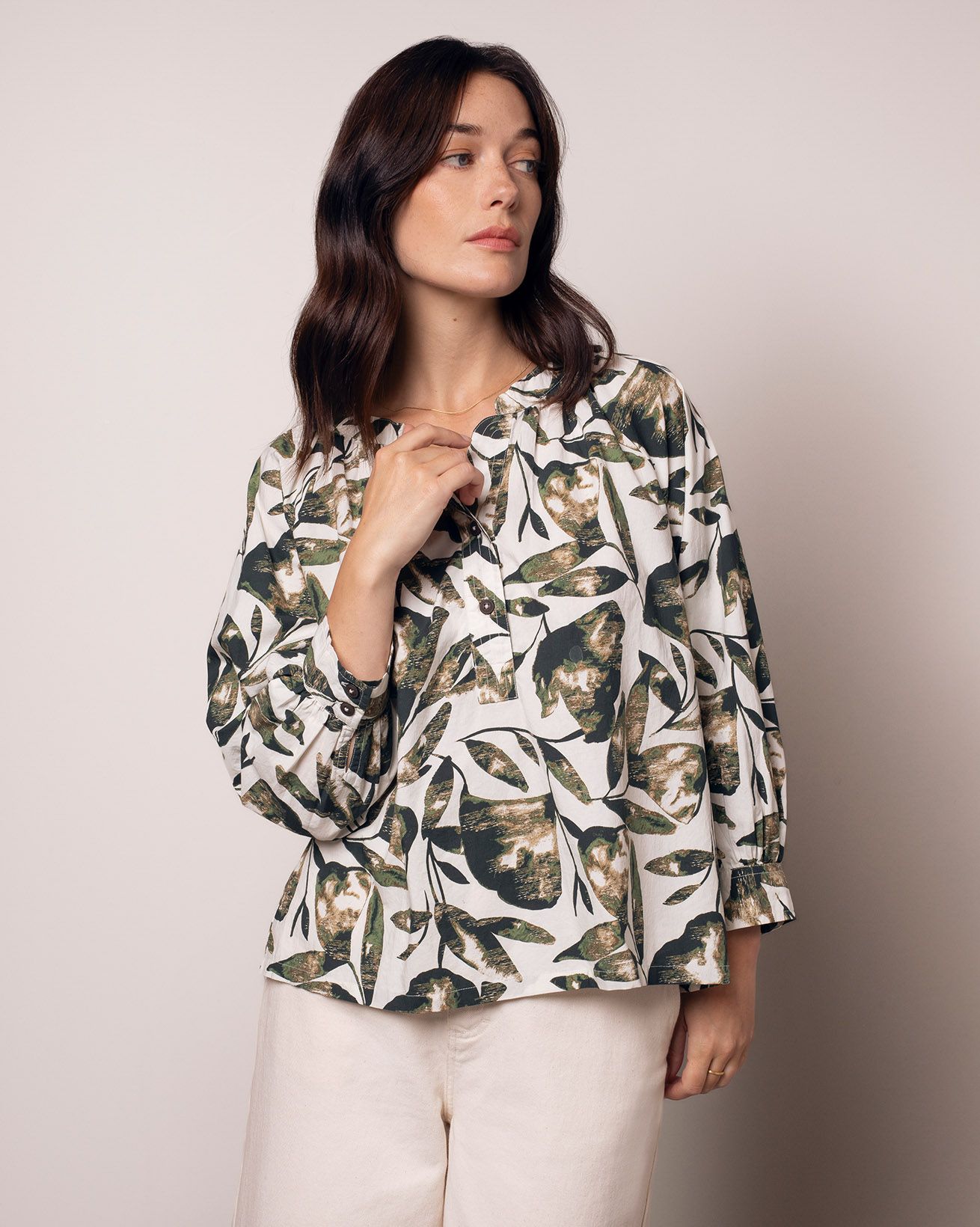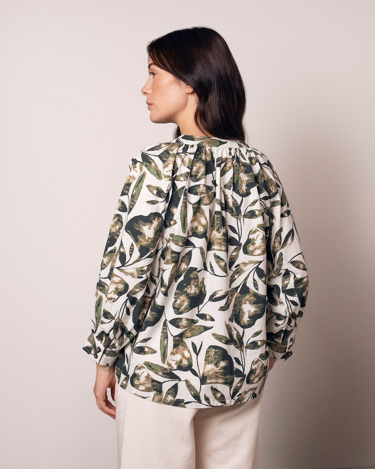 The Gathered Woven Blouse features a round neckline and grandad collar styling, finished with a half button placket. Crafted from digitally printed fabric, it reduces water use and chemical waste, reflecting a thoughtful approach to production without compromising on comfort or design. A versatile addition to any wardrobe.