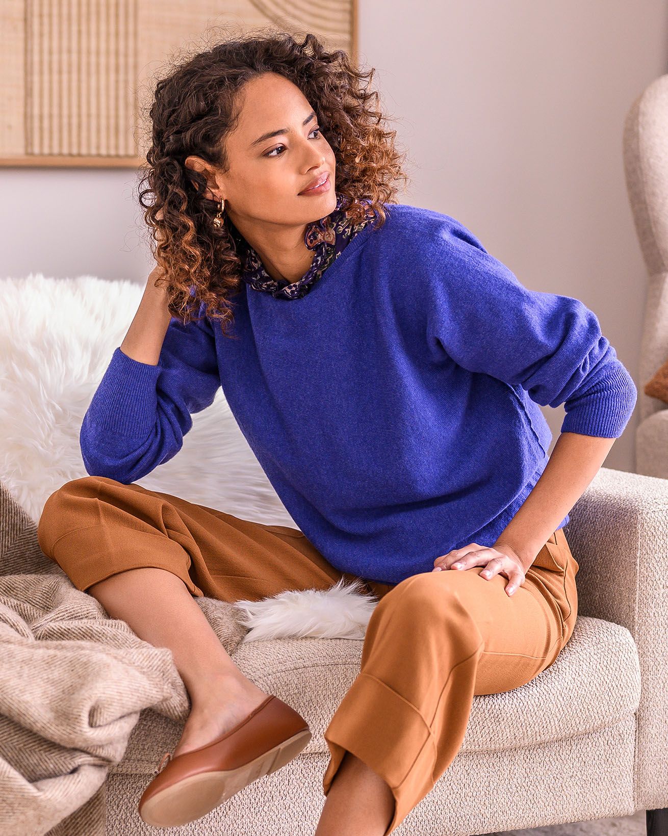 This super soft jumper has a relaxed fit coupled with a tight hem to create a flattering blouson effect. Clean and simple in style, we’ve designed this with a slash neckline with a narrow, ribbed collar trim and deep ribbed hem and cuffs. Perfect for lounging, every day wear or dressing up for evenings out.