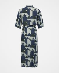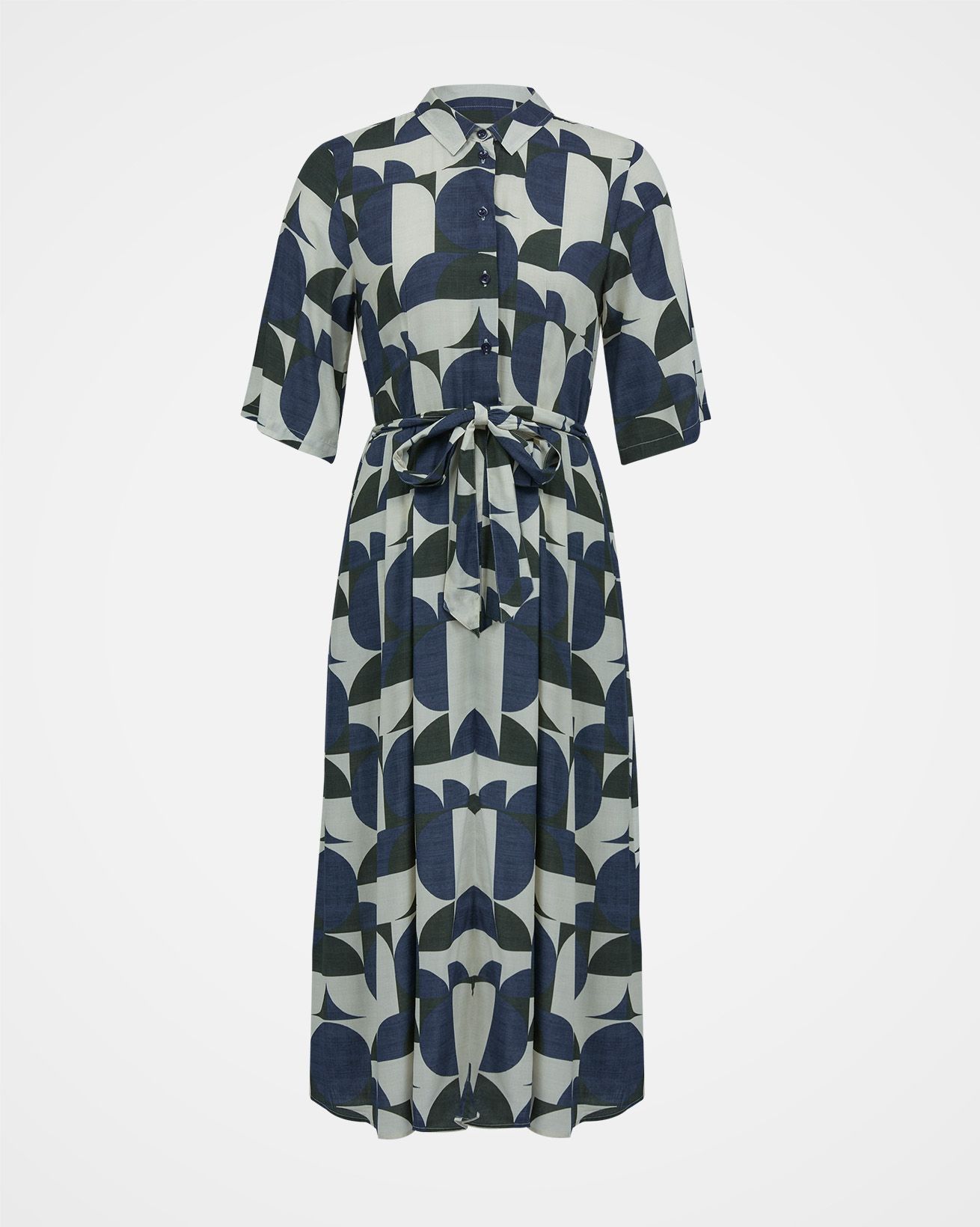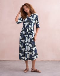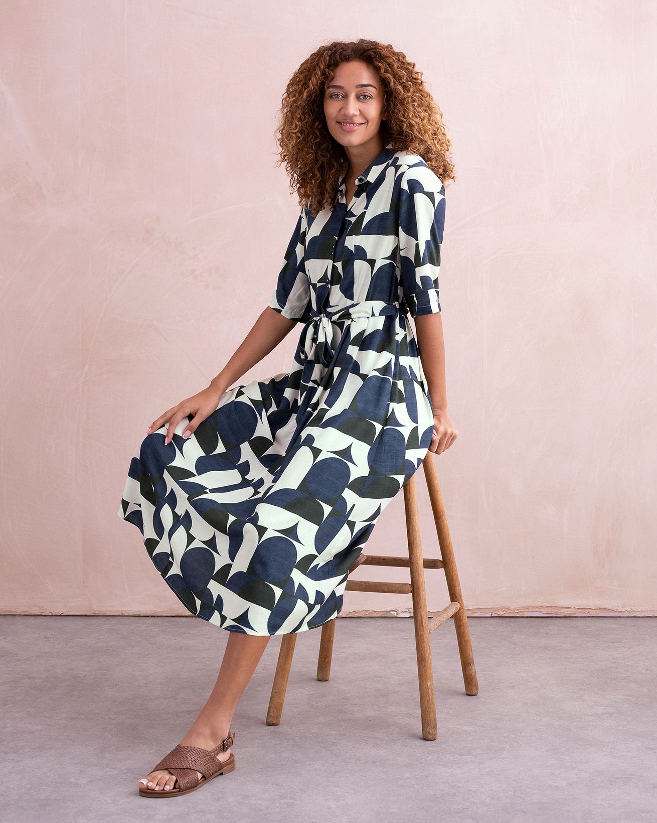 Our Half Sleeve Midi Shirt Dress is a versatile addition to your wardrobe. Designed with a midi length, it features a classic shirt collar and a button-through placket to the waist, adorned with buttons made from Corozo nut. The self-fabric belt cinches at the waist, creating a tailored silhouette, while the skirt features flattering knife pleats. The half-length sleeves add a touch of sophistication, and the patterned design adds a stylish twist. Crafted from soft, smooth, drapey lightweight woven material, this dress offers a contemporary appeal.