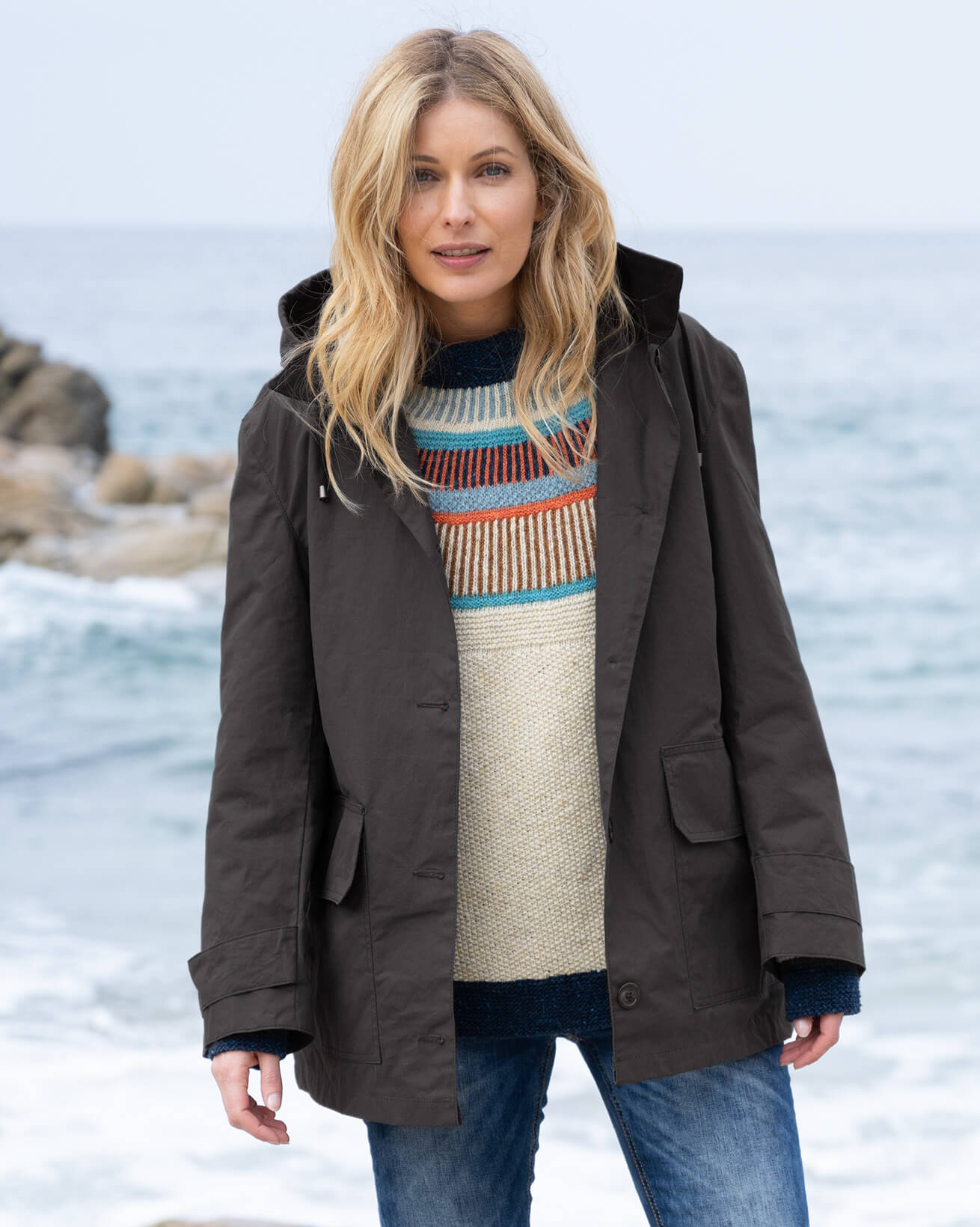 The cuff straps can be adjusted to seal out biting winds and the front secures with contrast buttons. Patch pockets are a great place to warm up your hands in chilly temperatures.