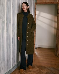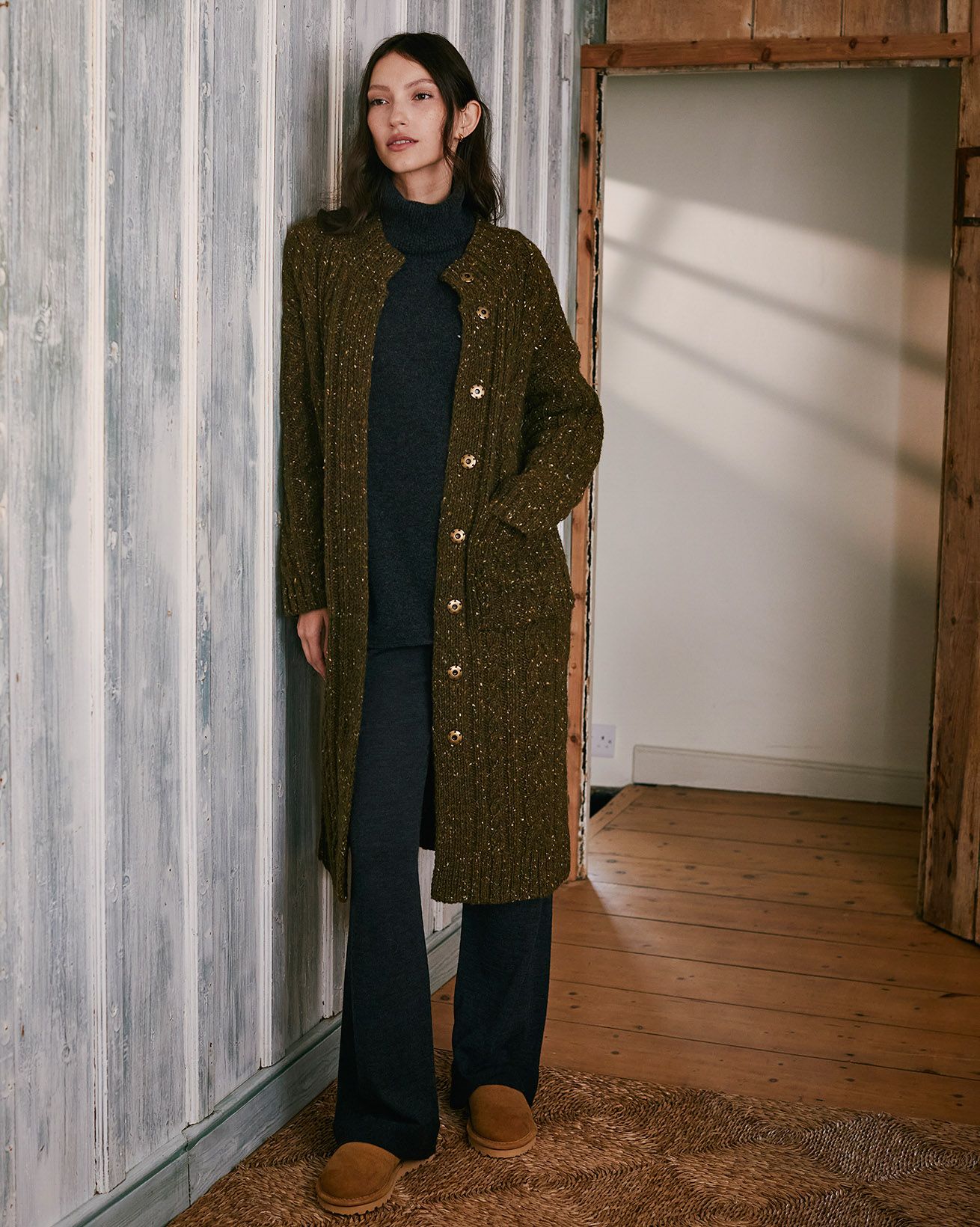 The Kilcarra Tweed Coatigan is made from chunky, rustic wool featuring an all-over cable design. It has drop shoulders and an oversized fit, suitable as an outer layer or coat. Finished with ribbed trims, a funnel neck, and concealed central poppers for a heritage-inspired statement piece.