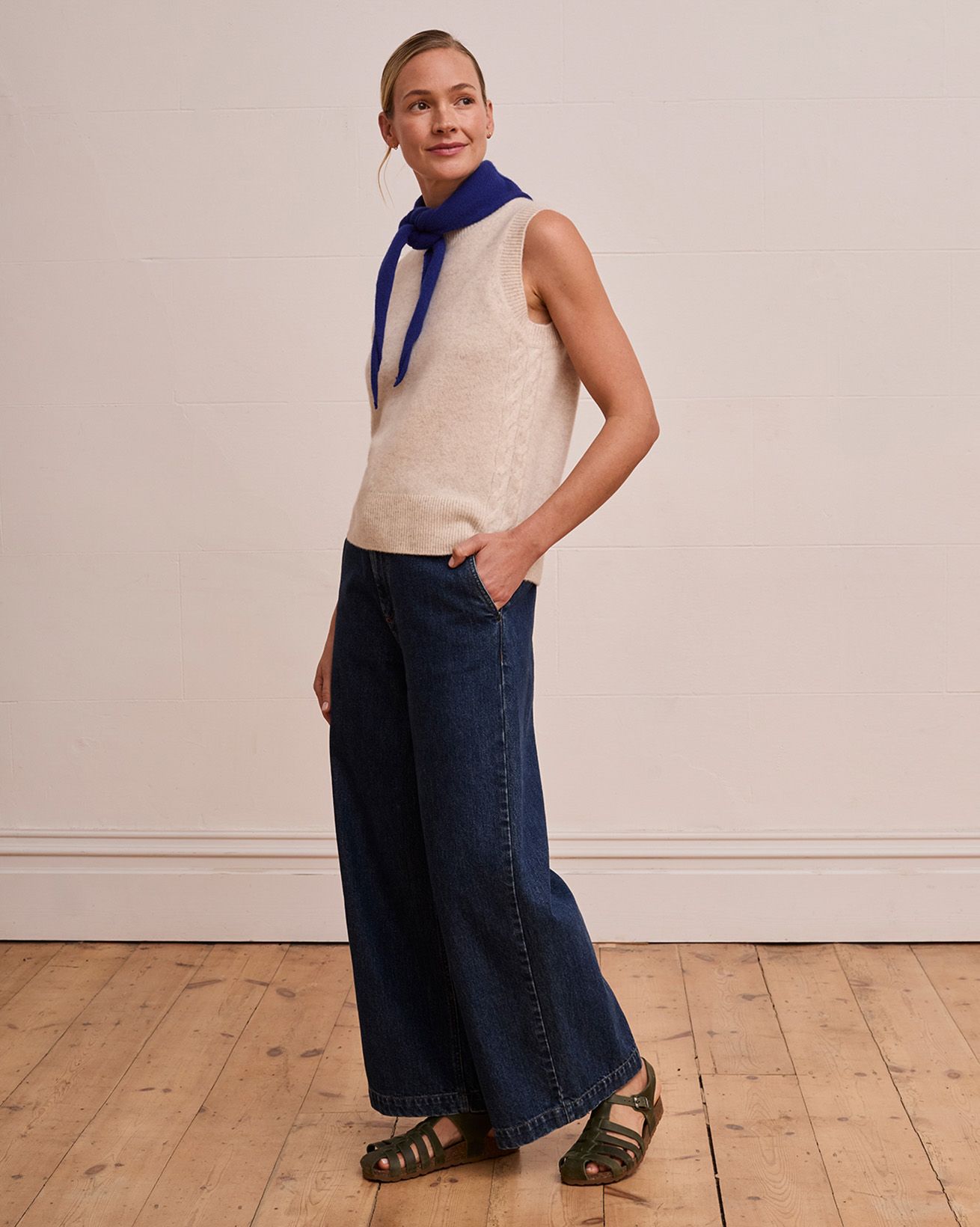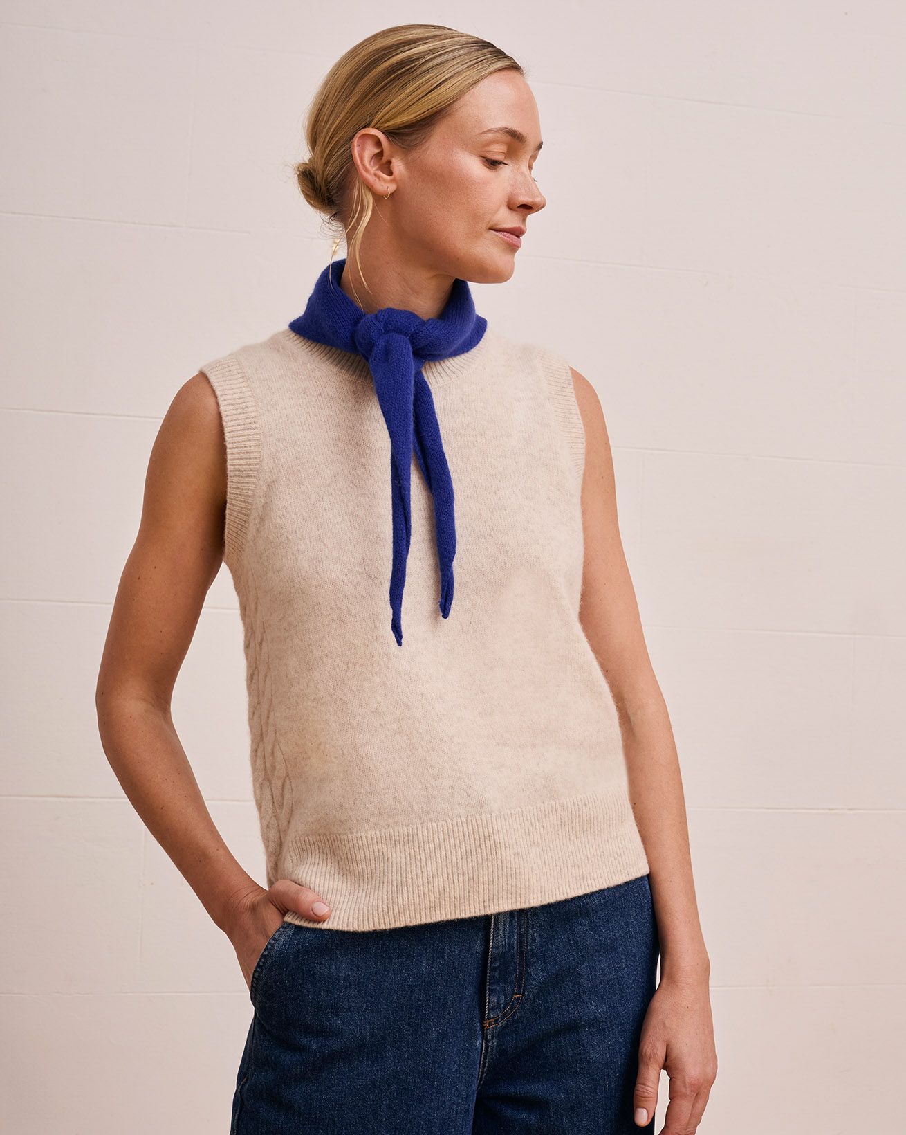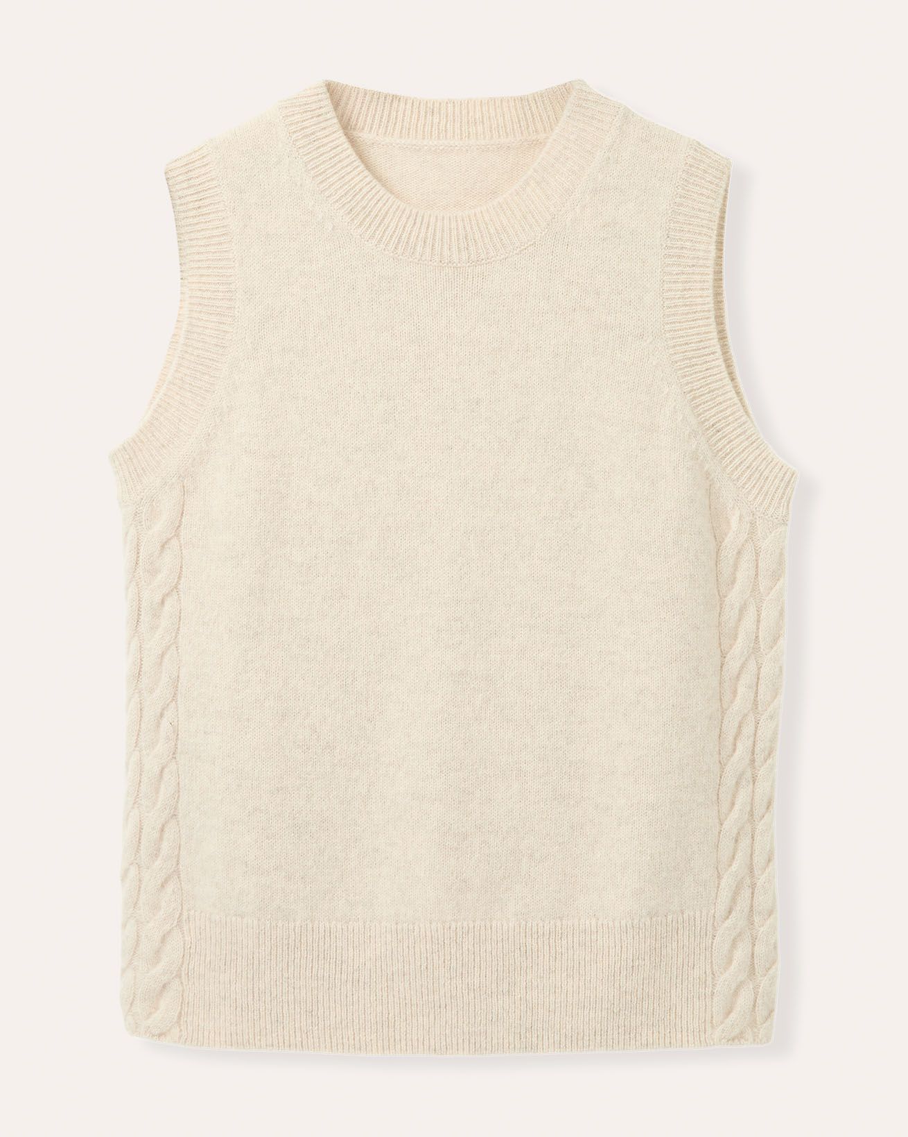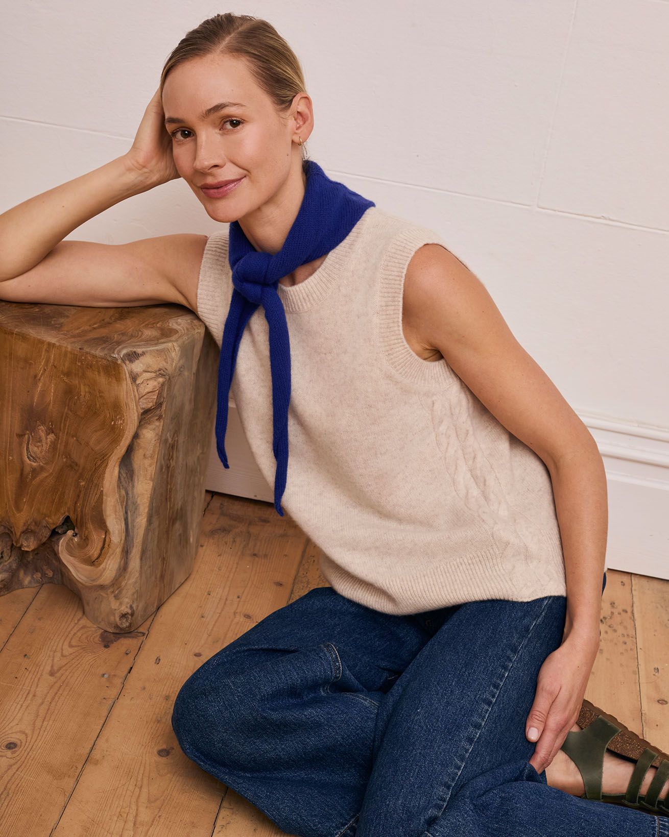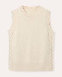 This sleeveless tank features cable details along the side seams and a ribbed hem, neckline, and armholes for a refined finish. With a slightly cropped length, it pairs effortlessly with the matching Cable Detail Raglan Cardigan or layered over tops, offering a versatile addition to your seasonal wardrobe.
