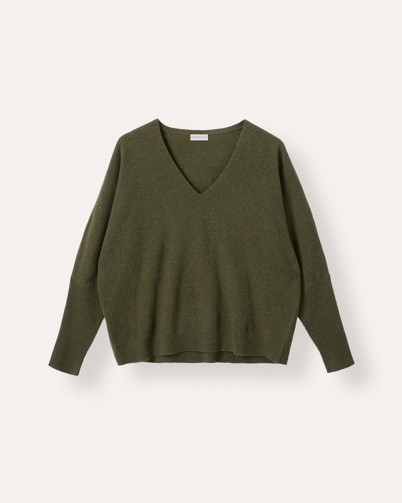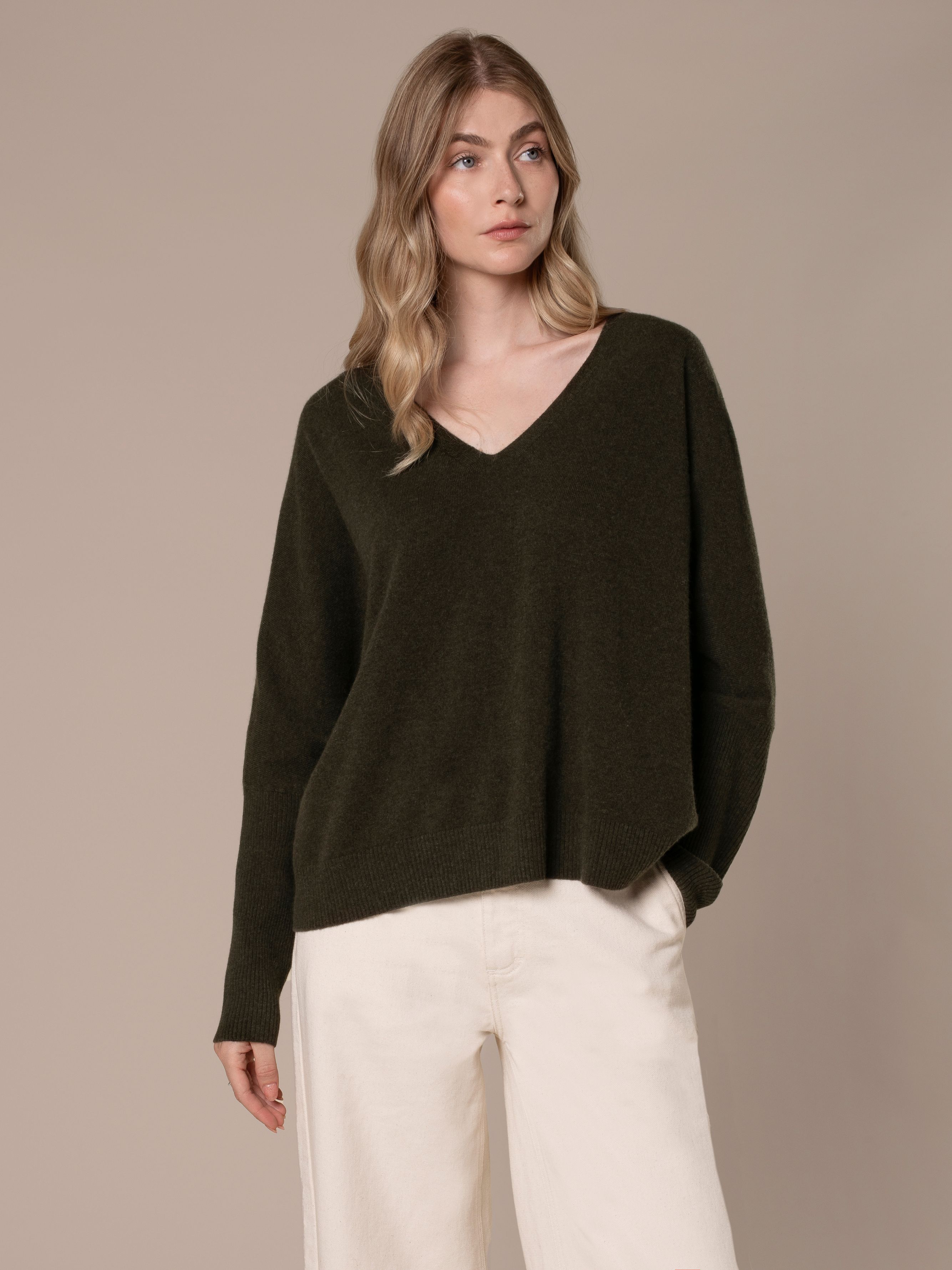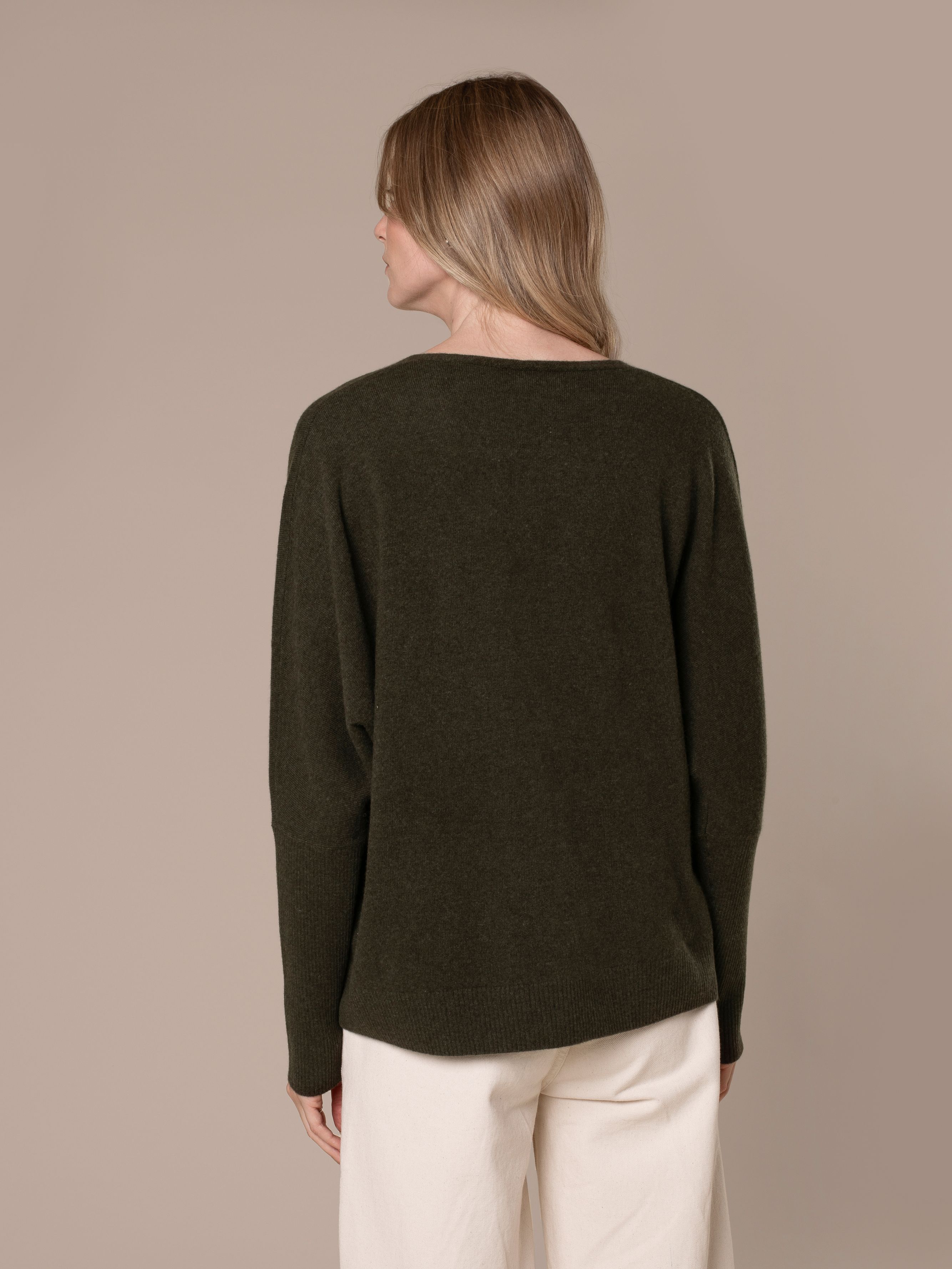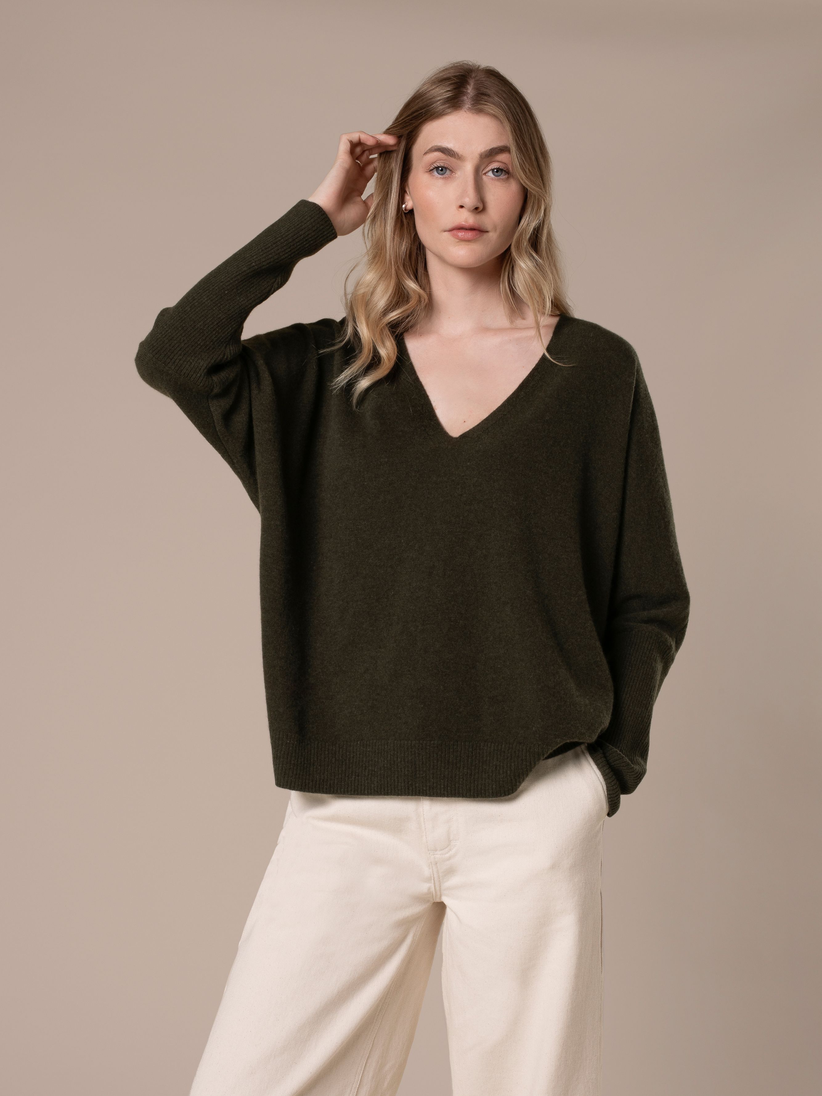 Crafted in pure lambswool, this V neck jumper features a relaxed slouchy fit with dropped shoulders for ease of movement. Finished with deep ribbed cuffs and a ribbed hem, it offers a soft, insulating layer ideal for cooler months.