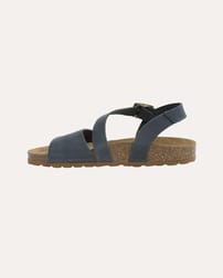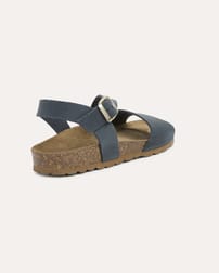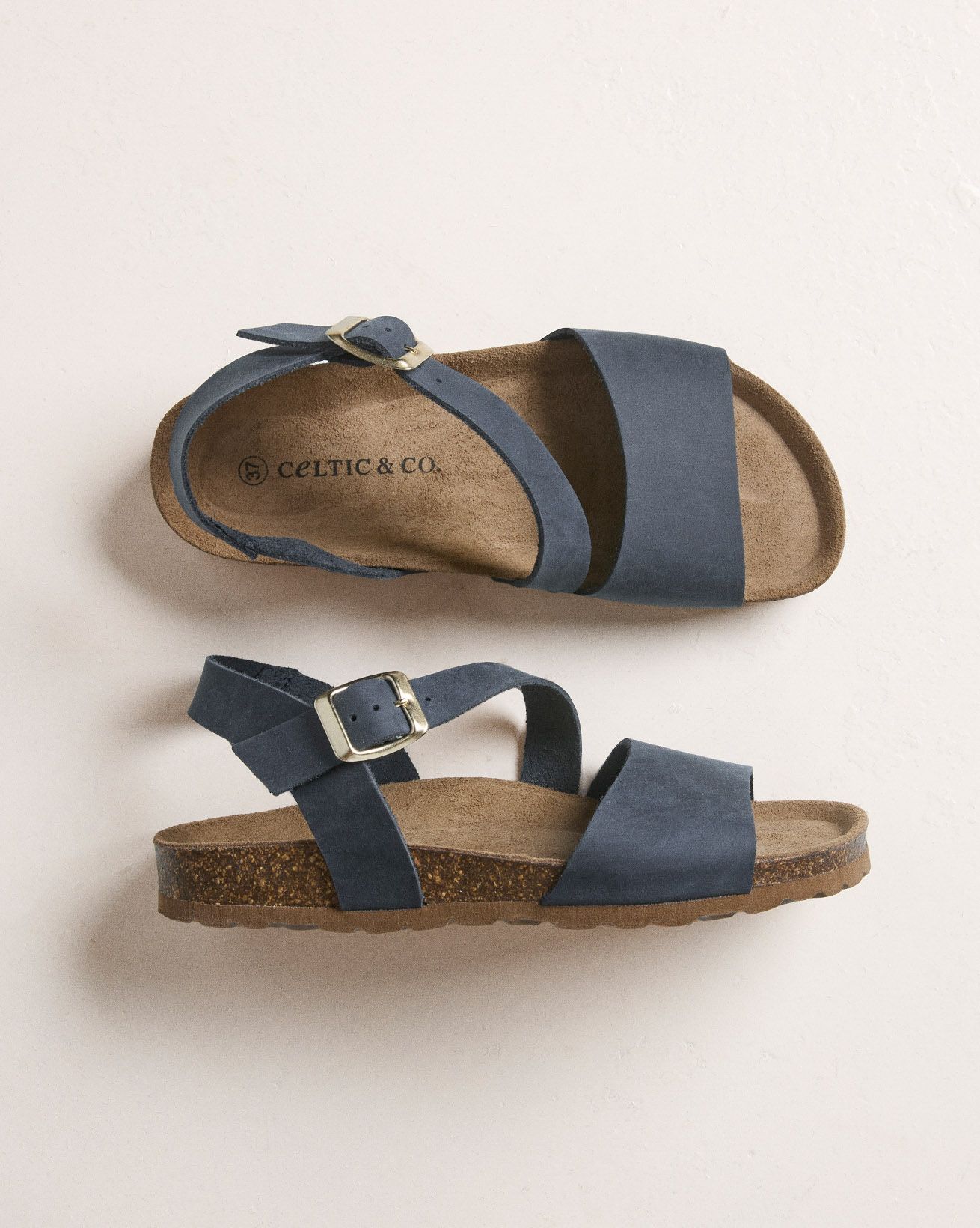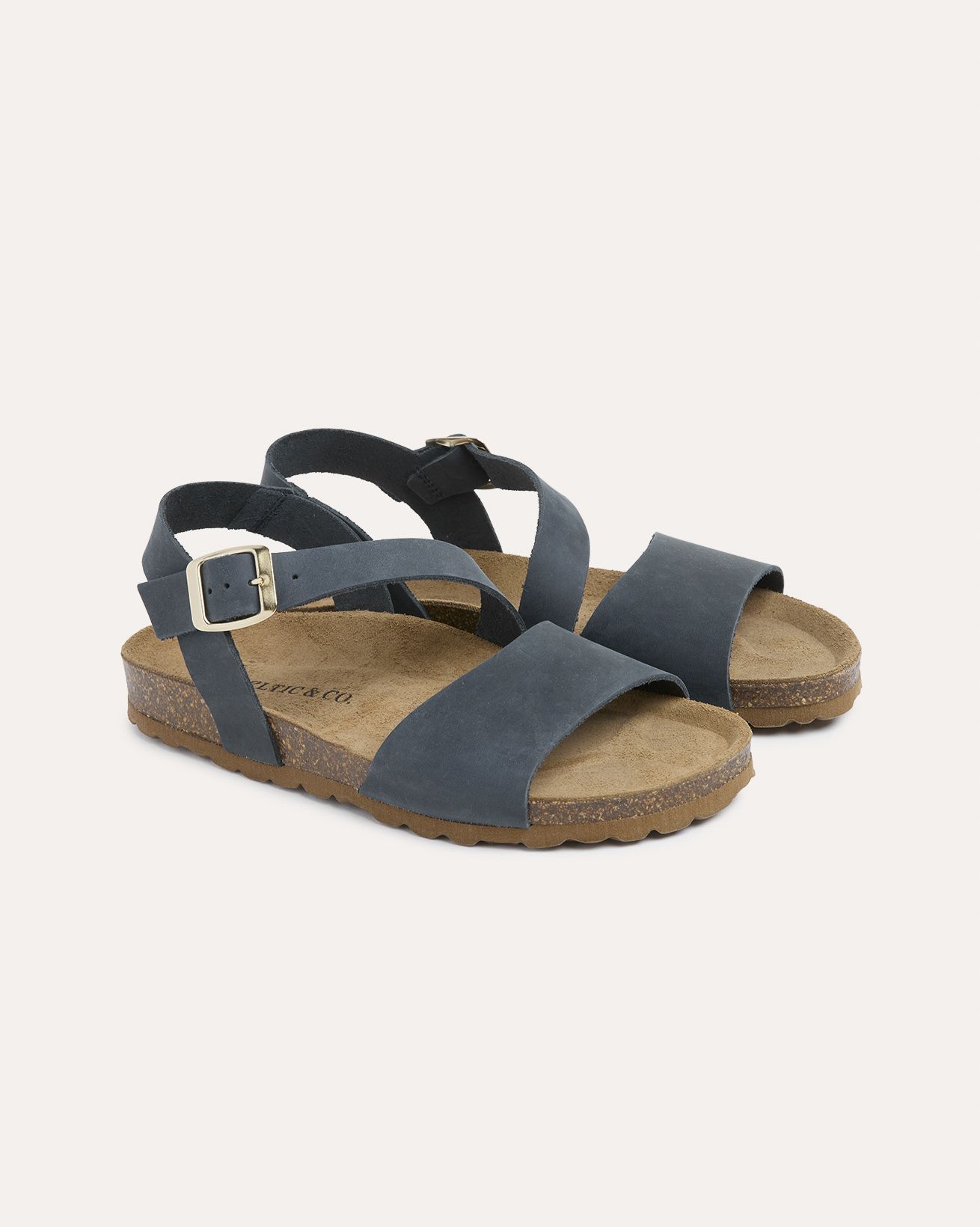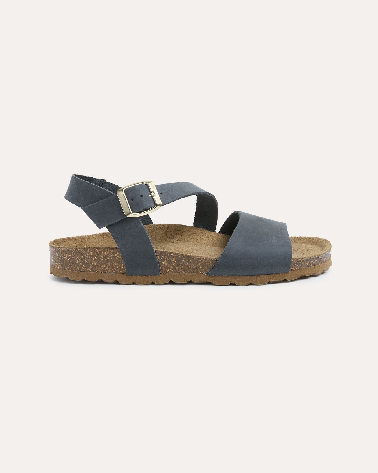 Designed for effortless summer style, these sandals feature a smooth leather upper with an asymmetric two-part strap and a secure buckled ankle fastening. A soft suede insole cushions the foot, while the low wedge moulded cork sole—finished with a durable rubber outsole—offers lightweight comfort and natural flexibility for all-day wear.