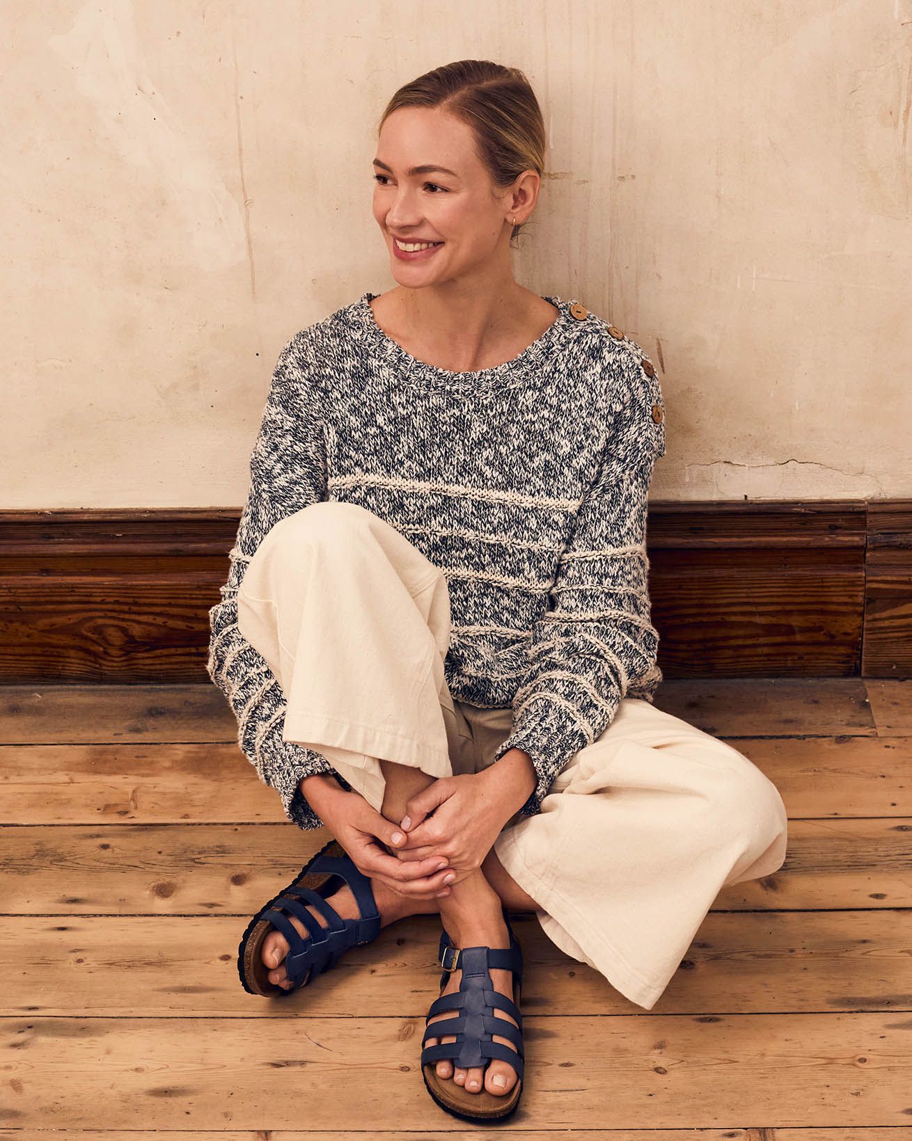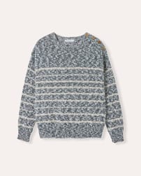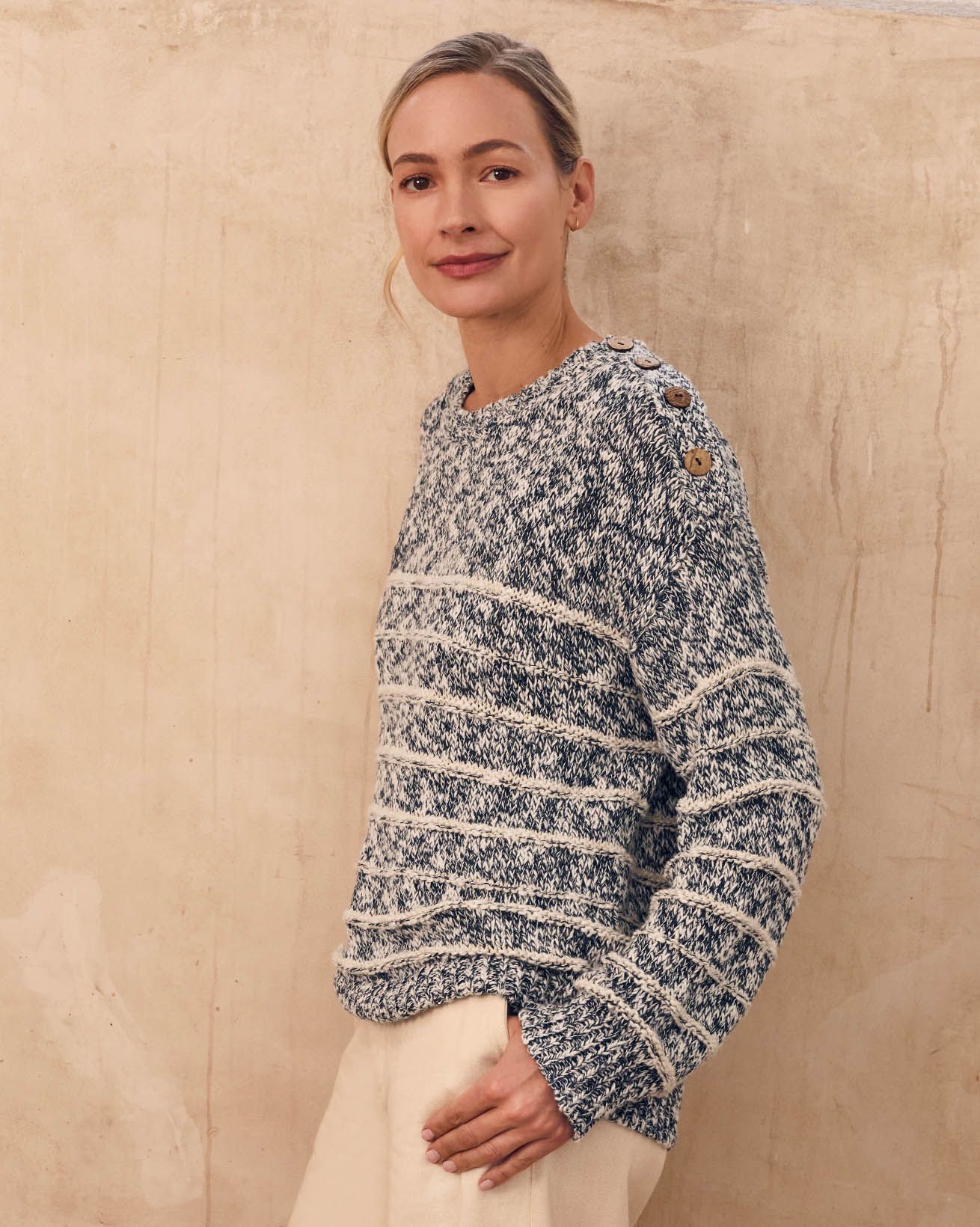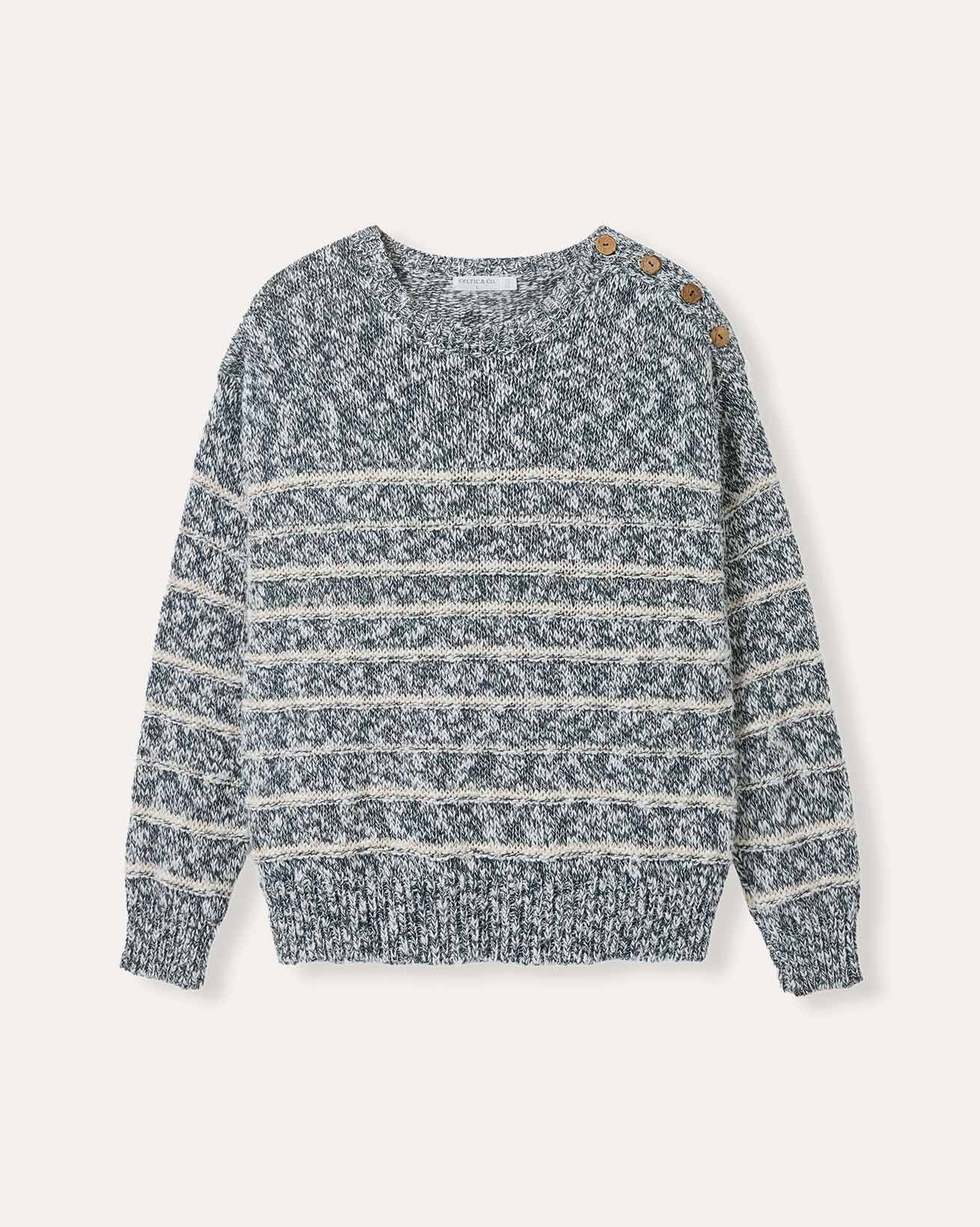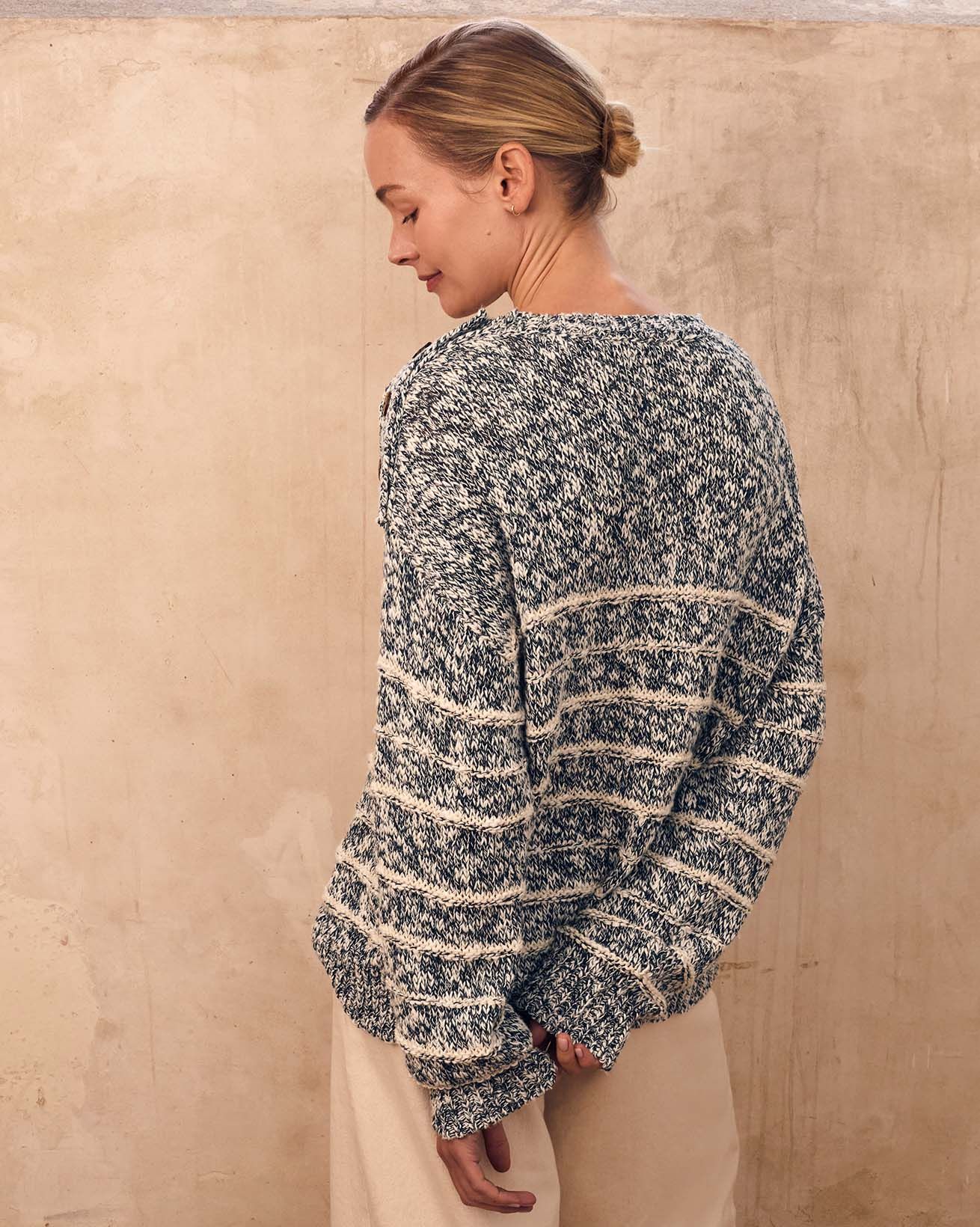 This relaxed-fit jumper features a classic crew neck and full length sleeves, crafted from a linen and cotton slub yarn blend. Inspired by a best-selling design of ours, it showcases drop shoulder styling with natural coconut buttons , combining timeless details with breathable, natural fibres for everyday comfort.