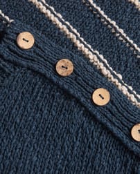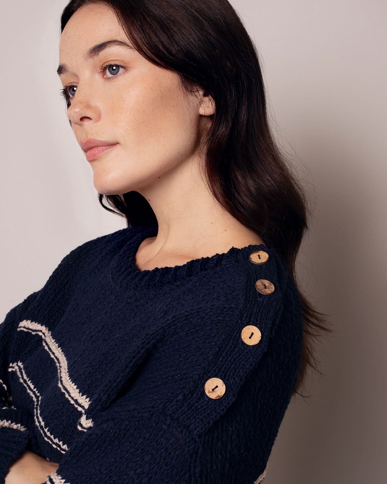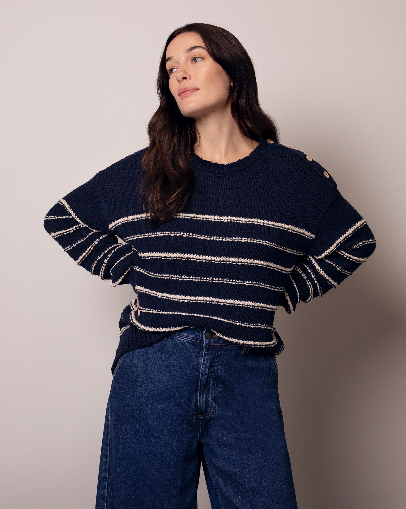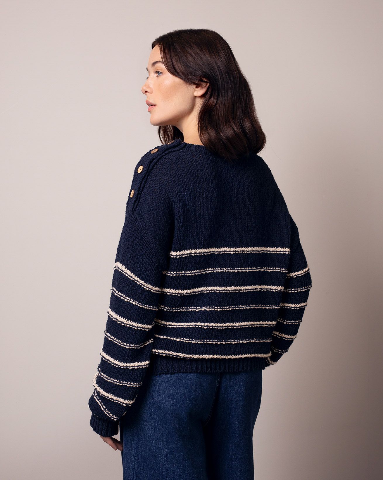 This relaxed-fit jumper features a classic crew neck and full length sleeves, crafted from a linen and cotton slub yarn blend. Inspired by a best-selling design of ours, it showcases drop shoulder styling with natural coconut buttons , combining timeless details with breathable, natural fibres for everyday comfort.