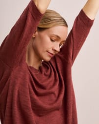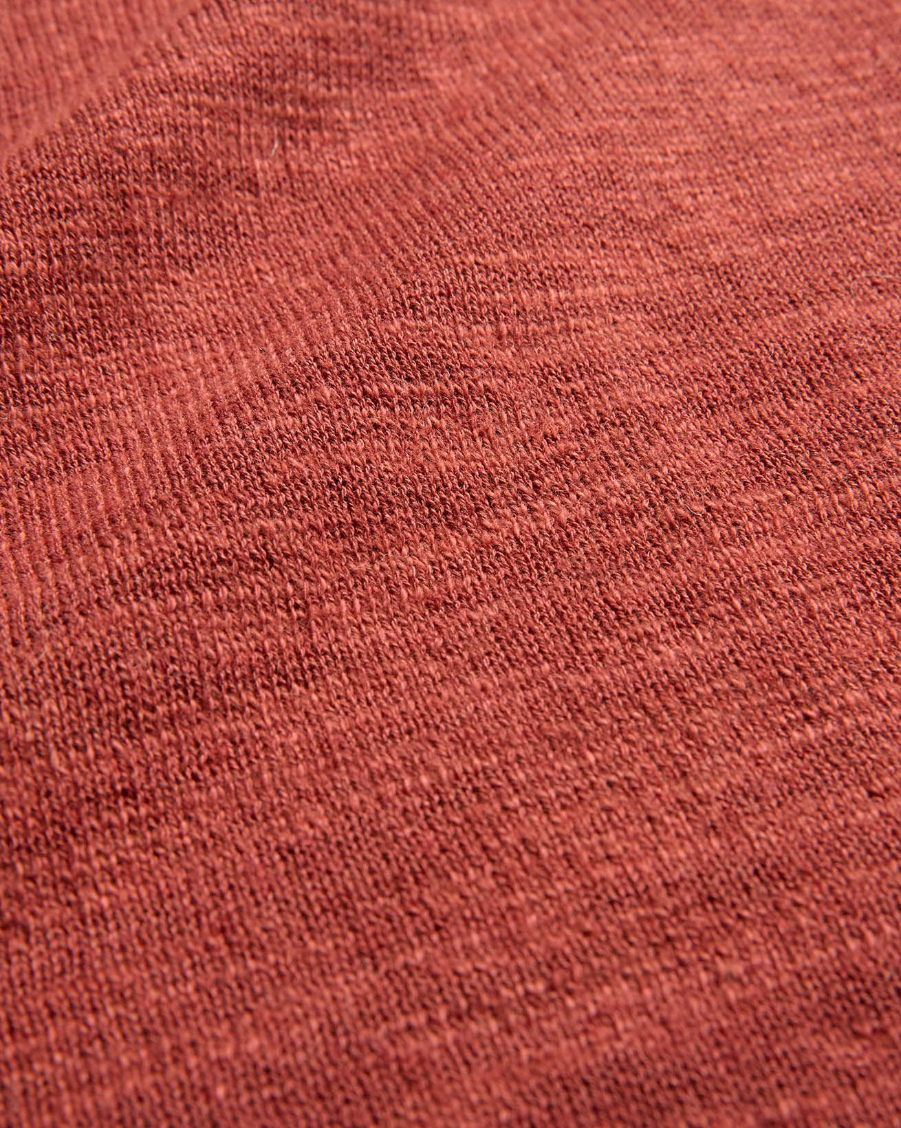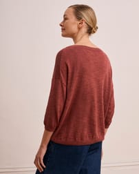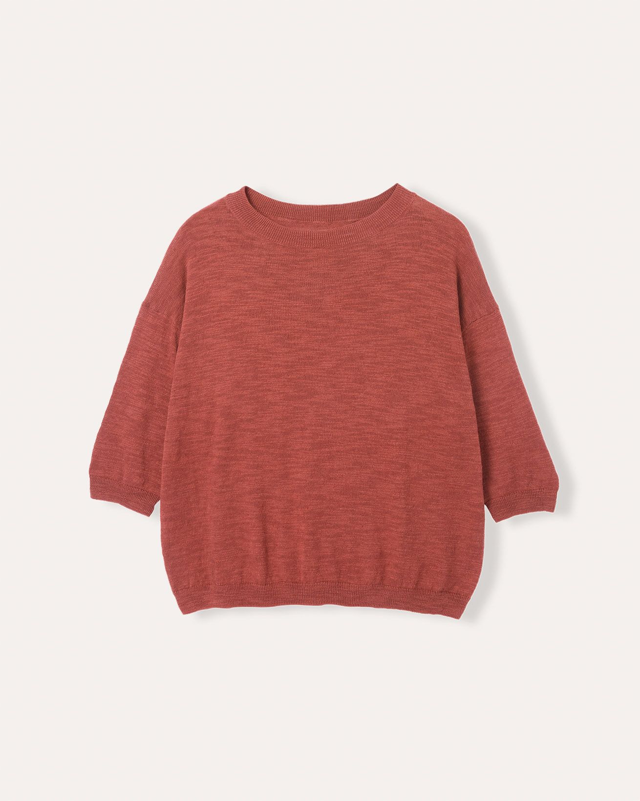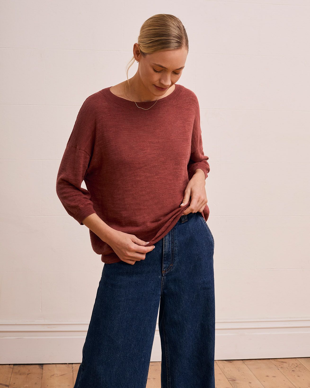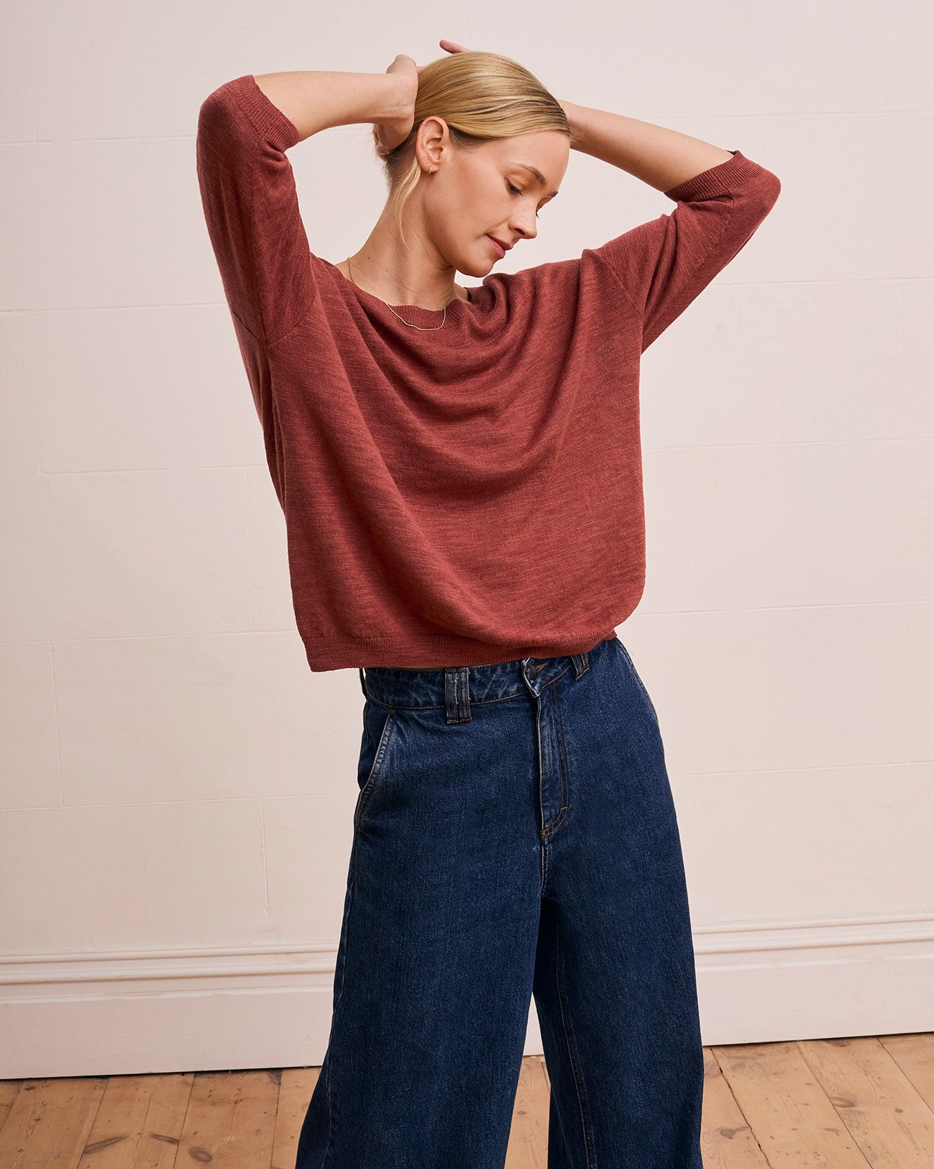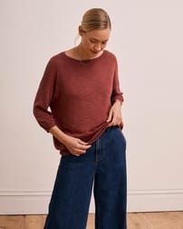 This lightweight crew neck jumper features a fine linen blend yarn with a subtle slub texture, adding delicate dimension to its soft, breathable fabric. Designed with a relaxed drop shoulder and cropped sleeves, it offers an elevated basic look that combines comfort with understated refinement.