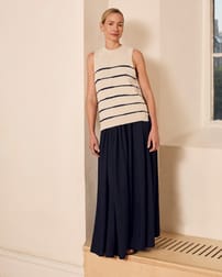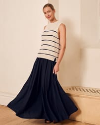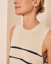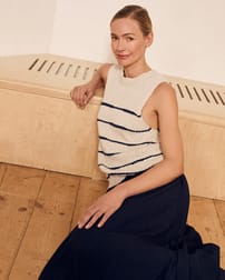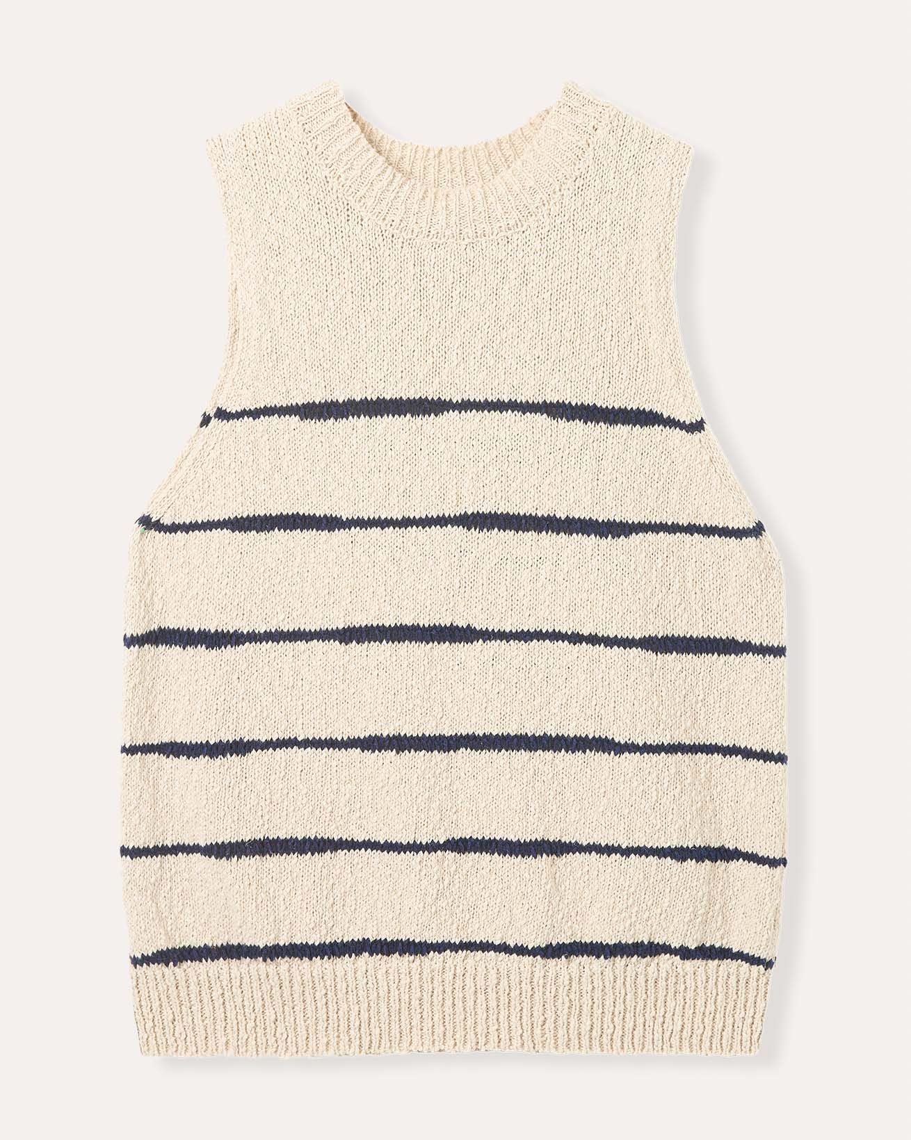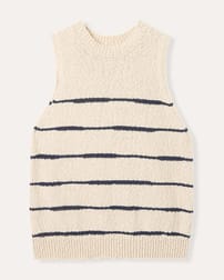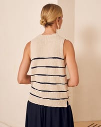 This sleeveless vest top features a drop stitch Breton detail and a simple, regular fit with a crew neckline. Made from a linen and cotton slub yarn blend, it offers a natural texture and breathable comfort, enhanced by ribbed trims and subtle side splits for ease of movement.