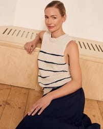 This sleeveless vest top features a drop stitch Breton detail and a simple, regular fit with a crew neckline. Made from a linen and cotton slub yarn blend, it offers a natural texture and breathable comfort, enhanced by ribbed trims and subtle side splits for ease of movement.