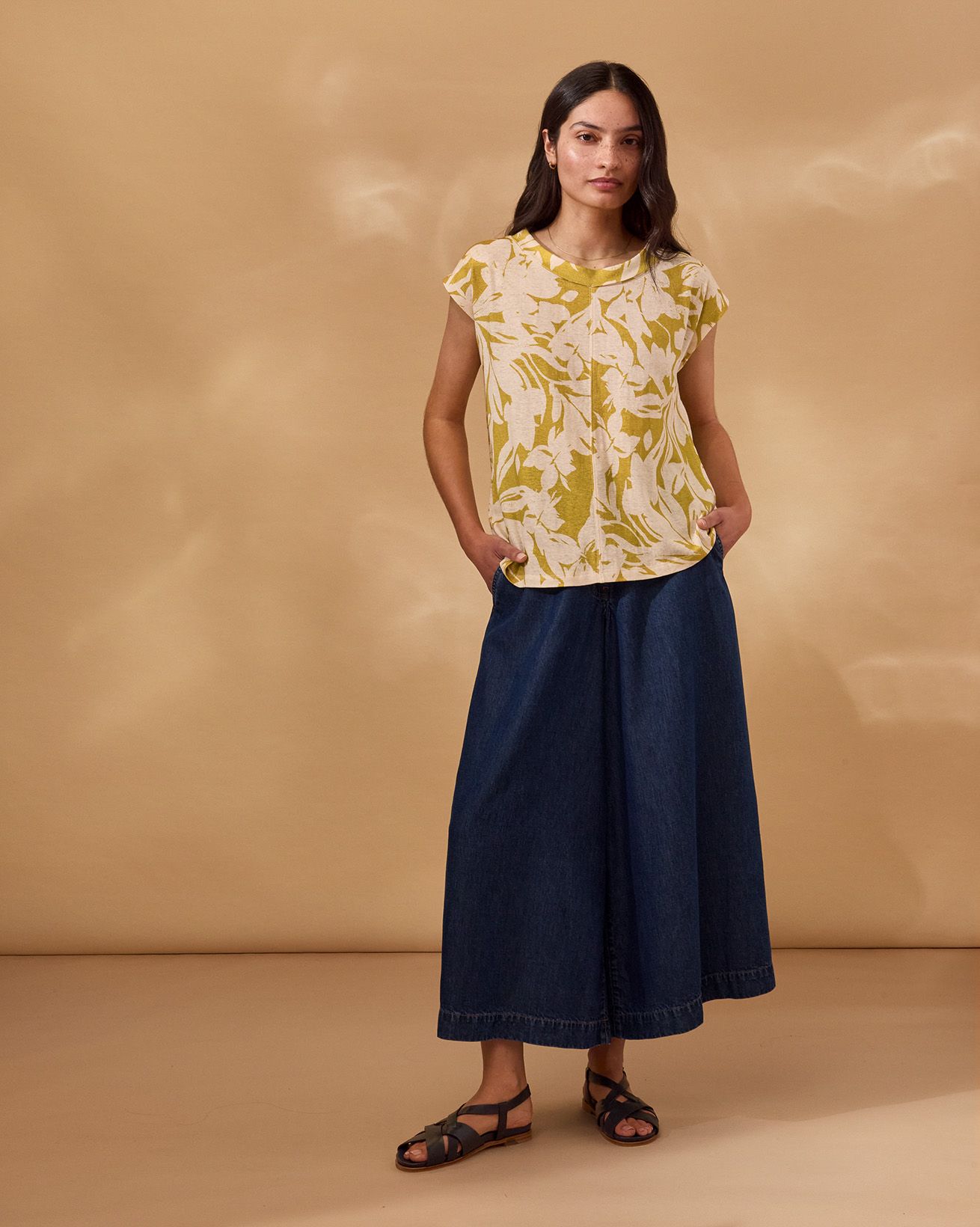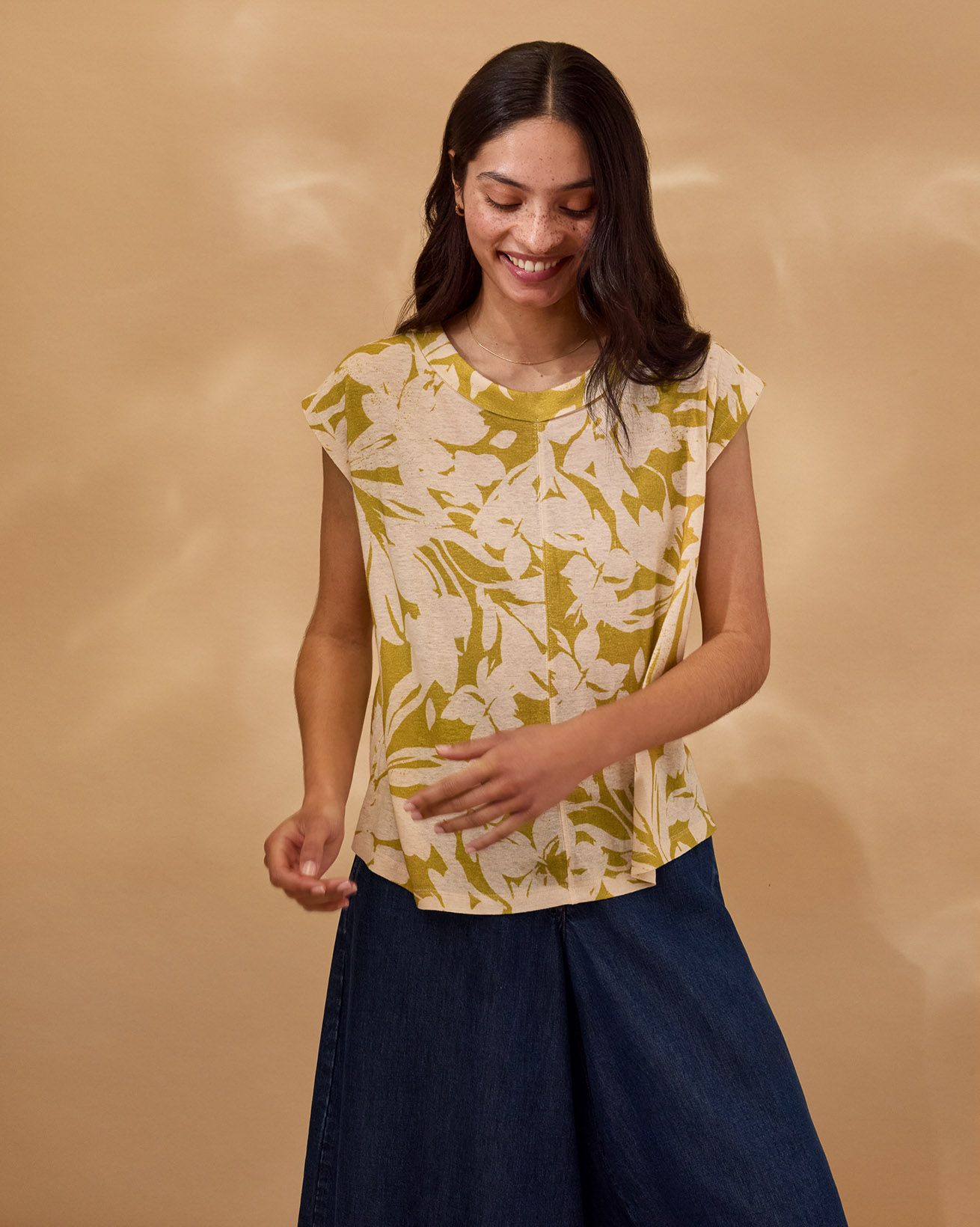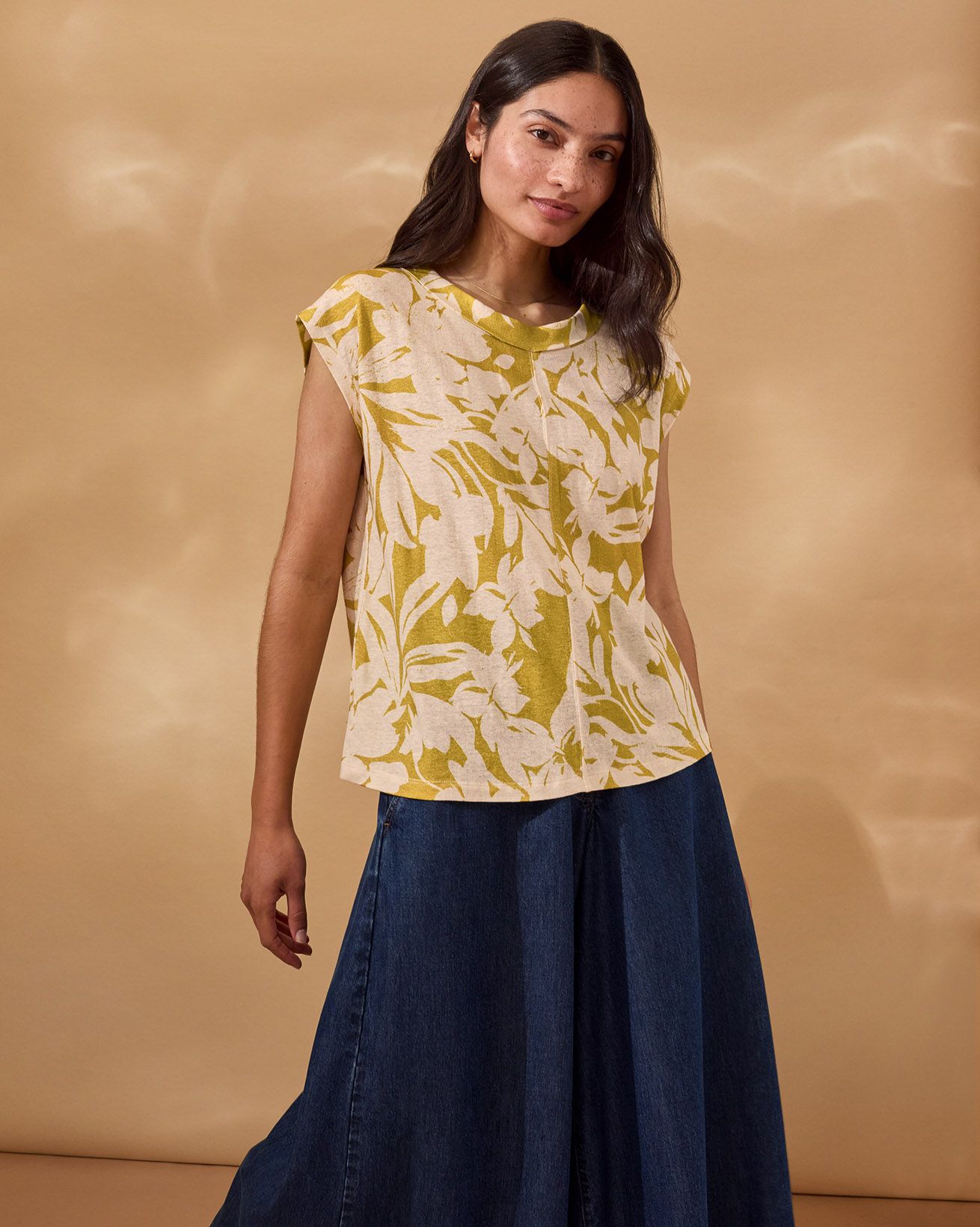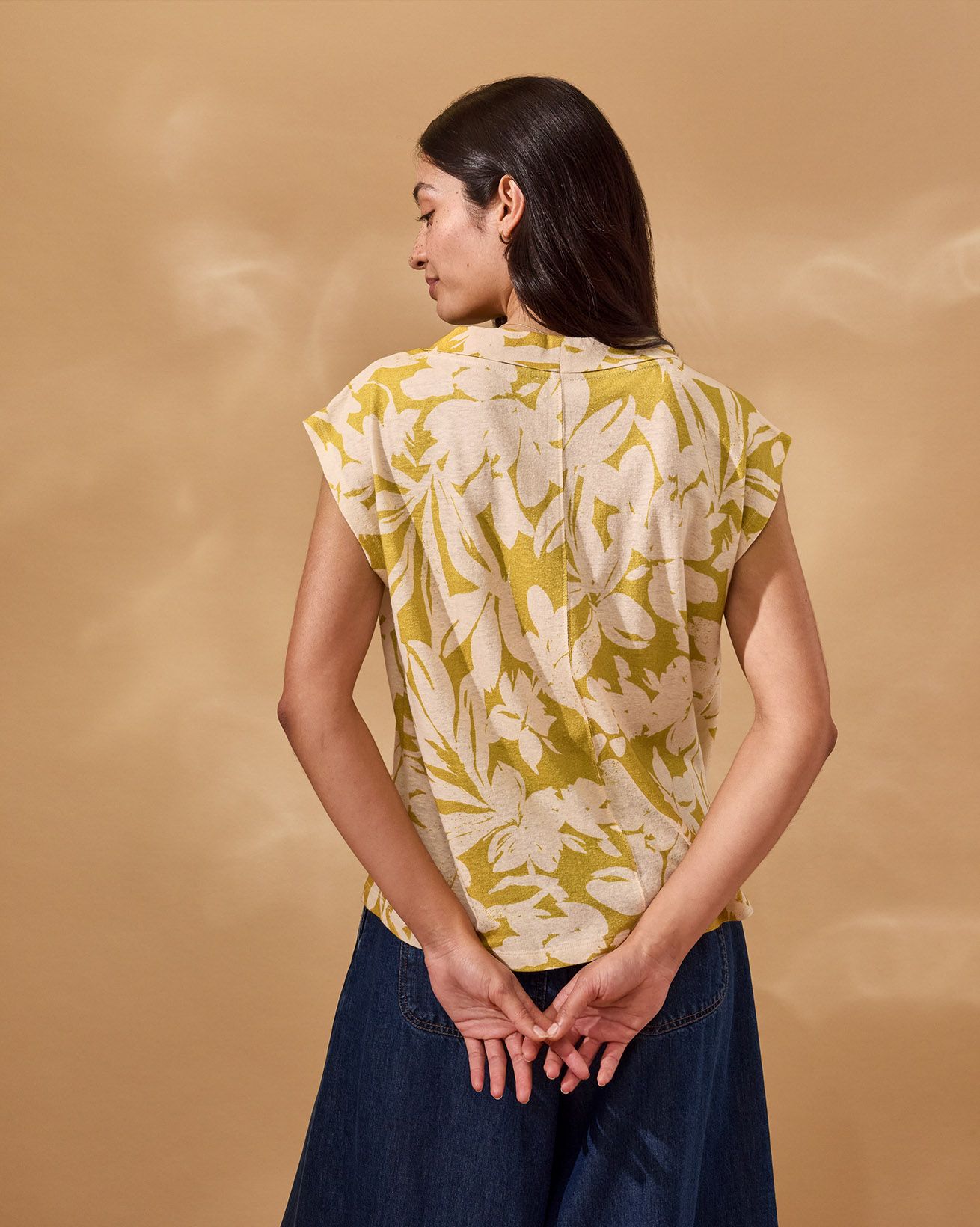 This sleeveless, relaxed-fit jersey top features a fold collar and delicate pleated detailing for a refined finish. Crafted from digitally printed fabric, it reduces water use and chemical waste, reflecting a thoughtful approach to production. Designed without fastenings, it offers a clean, effortless silhouette perfect for layering or wearing alone.