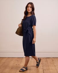 This fitted jersey dress features a scoop neckline and short sleeves, designed for effortless wear with a pull-over style and fastening-free finish. The side tie detail adds subtle interest, while the digitally printed fabric reduces water use and chemical waste, reflecting a thoughtful approach to production.